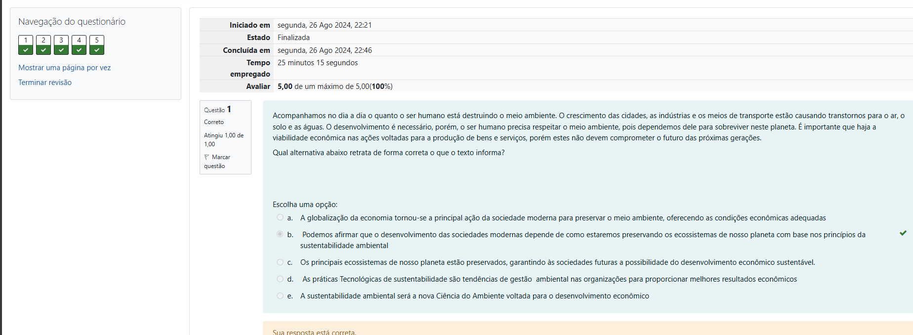 <p>nário Iniciado em segunda, 26 Ago 2024, 22:21 Estado Finalizada Concluída em segunda, 26 Ago 2024, 22:46 Tempo 25 minutos 15 segundos empregado Avaliar 5,00 de um máximo de 5,00(100%) Questão 1 Acompanhamos no dia a dia o quanto o ser humano está destruindo meio ambiente. o crescimento das cidades, as indústrias e os meios de transporte estão causando transtornos para ar, Correto solo e as águas. o desenvolvimento é necessário, porém, ser humano precisa respeitar o meio ambiente, pois dependemos dele para sobreviver neste planeta. É importante que haja a Atingiu 1,00 de viabilidade econômica nas ações voltadas para a produção de bens e serviços, porém estes não devem comprometer o futuro das próximas gerações 1,00 Qual alternativa abaixo retrata de forma correta que o texto informa? Marcar questão Escolha uma opção: a. A globalização da economia tornou-se a principal ação da sociedade moderna para preservar o meio ambiente, oferecendo as condições econômicas adequadas b. Podemos afirmar que o desenvolvimento das sociedades modernas depende de como estaremos preservando os ecossistemas de nosso planeta com base nos princípios da sustentabilidade ambiental Os principais ecossistemas de nosso planeta estão preservados, garantindo às sociedades futuras a possibilidade do desenvolvimento econômico d. As práticas Tecnológicas de sustentabilidade são tendências de gestão ambiental nas organizações para proporcionar melhores resultados econômicos e. A sustentabilidade ambiental será a nova Ciência do Ambiente voltada para o desenvolvimento econômico Sua resposta está correta</p>