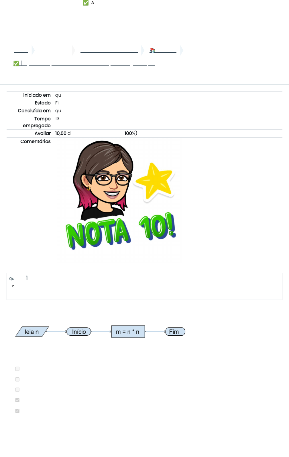 <p>Painel Meus cursos 32010001808-T01-2024-2 📚 Módulo 1</p><p>✅ [A1] – Avaliação do Módulo 1 - Introdução à Programação</p><p>Iniciado em quarta, 21 ago 2024, 20:22</p><p>Estado Finalizada</p><p>Concluída em quarta, 21 ago 2024, 20:35</p><p>Tempo</p><p>empregado</p><p>13 minutos</p><p>Avaliar 10,00 de um máximo de 10,00(100%)</p><p>Comentários</p><p>Questão 1</p><p>Correto</p><p>Atingiu 1,00 de 1,00</p><p>O fluxograma está incorreto.</p><p>Selecione as alternativas que explicam os motivos pelos quais o fluxograma não está correto:</p><p>Escolha uma ou mais:</p><p>a. O fluxo de dados está na horizontal e não na vertical.</p><p>b. Não termina com o símbolo de fim do fluxograma.</p><p>c. Não imprime o valor de m.</p><p>d. Não se inicia com o símbolo de início do fluxograma.</p><p>e. Inicia-se com a leitura de um número.</p><p>8/22/24, 9:17 PM ✅ [A1] – Avaliação do Módulo 1 - Introdução à Programação: Revisão da tentativa</p><p>https://ava.ufms.br/mod/quiz/review.php?attempt=1068886&cmid=846052 1/4</p><p>https://ava.ufms.br/my/</p><p>https://ava.ufms.br/course/view.php?id=60722</p><p>https://ava.ufms.br/course/view.php?id=60722#section-2</p><p>https://ava.ufms.br/mod/quiz/view.php?id=846052</p><p>Questão 2</p><p>Correto</p><p>Atingiu 1,00 de 1,00</p><p>Questão 3</p><p>Correto</p><p>Atingiu 1,00 de 1,00</p><p>Questão 4</p><p>Correto</p><p>Atingiu 1,00 de 1,00</p><p>Questão 5</p><p>Correto</p><p>Atingiu 1,00 de 1,00</p><p>Assumindo que você mora em uma casa com 20 lâmpadas, sendo que algumas delas estão queimadas, a</p><p>sequência de passos a seguir, que propõe deixar todas as lâmpadas da sua casa funcionando, é um algoritmo?</p><p>Enquanto houver lâmpada queimada na sua casa:</p><p>Identifique uma lâmpada queimada;</p><p>Troque a lâmpada queimada identificada no passo anterior por uma nova lâmpada;</p><p>Queime outra lâmpada.</p><p>Escolha uma opção:</p><p>Verdadeiro</p><p>Falso </p><p>A linguagem Python pode ser considerada uma linguagem de uso geral.</p><p>Escolha uma opção:</p><p>Verdadeiro </p><p>Falso</p><p>Um algoritmo é uma sequência de passos que visam atingir um objetivo bem definido.</p><p>Escolha uma opção:</p><p>Verdadeiro </p><p>Falso</p><p>Consulte a página https://wiki.python.org/moin/FrontPage para responder a esta questão.</p><p>O Python pode ser utilizado como extensão de outras linguagens.</p><p>Escolha uma opção:</p><p>Verdadeiro </p><p>Falso</p><p>8/22/24, 9:17 PM ✅ [A1] – Avaliação do Módulo 1 - Introdução à Programação: Revisão da tentativa</p><p>https://ava.ufms.br/mod/quiz/review.php?attempt=1068886&cmid=846052 2/4</p><p>https://wiki.python.org/moin/FrontPage</p><p>Questão 6</p><p>Correto</p><p>Atingiu 1,00 de 1,00</p><p>Questão 7</p><p>Correto</p><p>Atingiu 1,00 de 1,00</p><p>Questão 8</p><p>Correto</p><p>Atingiu 1,00 de 1,00</p><p>Consulte a página https://wiki.python.org/moin/FrontPage para responder a questão.</p><p>O Python é uma linguagem de programação interpretada, interativa e orientada a objetos.</p><p>Escolha uma opção:</p><p>Verdadeiro </p><p>Falso</p><p>1. Definição do problema</p><p>2. Determinação de como o problema será resolvido</p><p>3. Projeto da solução</p><p>4. Codificação da solução</p><p>5. Teste da solução</p><p>Dados os passos de projeto da solução, definição do problema, codificação da solução, teste da solução e</p><p>determinação de como o problema será resolvido, ordene-os corretamente para a construção de um Z</p><p>Sobre as IDEs, selecione as alternativas corretas:</p><p>Escolha uma ou mais:</p><p>a. PyCharm é uma IDE para o Python.</p><p>b. As IDEs surgiram somente após o surgimento do Python.</p><p>c. Consiste, geralmente, de um editor de texto, compilador e debugador de código.</p><p>d. A palavra IDE corresponde à sigla de Integrated Development Environment.</p><p>e. Apenas a linguagem de programação Python possui IDEs para auxiliar na programação com a</p><p>linguagem.</p><p>8/22/24, 9:17 PM ✅ [A1] – Avaliação do Módulo 1 - Introdução à Programação: Revisão da tentativa</p><p>https://ava.ufms.br/mod/quiz/review.php?attempt=1068886&cmid=846052 3/4</p><p>https://wiki.python.org/moin/FrontPage</p><p>Questão 9</p><p>Correto</p><p>Atingiu 1,00 de 1,00</p><p>Questão 10</p><p>Correto</p><p>Atingiu 1,00 de 1,00</p><p>A origem do nome da linguagem Python vem do seriado de comédia Monty Python's Flying Circus.</p><p>Escolha uma opção:</p><p>Verdadeiro </p><p>Falso</p><p>Assumindo que você mora em uma casa com 20 lâmpadas, sendo que algumas delas estão queimadas, a</p><p>sequência de passos a seguir, que propõe deixar todas as lâmpadas da sua casa funcionando, é um algoritmo?</p><p>Enquanto houver lâmpada queimada na sua casa:</p><p>Identifique uma lâmpada queimada;</p><p>Troque a lâmpada queimada identificada no passo anterior por uma nova lâmpada.</p><p>Escolha uma opção:</p><p>Verdadeiro </p><p>Falso</p><p>Atividade anterior</p><p>◄ 📍 [Checkout de Presença] Módulo 1 - Introdução à Programação</p><p>Seguir para...</p><p>Próxima atividade</p><p>▶ [Videoaula] Apresentação do Módulo 2 - Parte 1 ►</p><p>Manter contato</p><p>Suporte Técnico ao Usuário</p><p> https://suporteagetic.ufms.br</p><p> (67) 3345-7613</p><p> suporte.agead@ufms.br</p><p></p><p>8/22/24, 9:17 PM ✅ [A1] – Avaliação do Módulo 1 - Introdução à Programação: Revisão da tentativa</p><p>https://ava.ufms.br/mod/quiz/review.php?attempt=1068886&cmid=846052 4/4</p><p>https://ava.ufms.br/mod/assign/view.php?id=846050&forceview=1</p><p>https://ava.ufms.br/mod/url/view.php?id=846053&forceview=1</p><p>https://suporteagetic.ufms.br/</p><p>tel:(67) 3345-7613</p><p>mailto:suporte.agead@ufms.br</p><p>https://api.whatsapp.com/send?phone=556733457613</p>