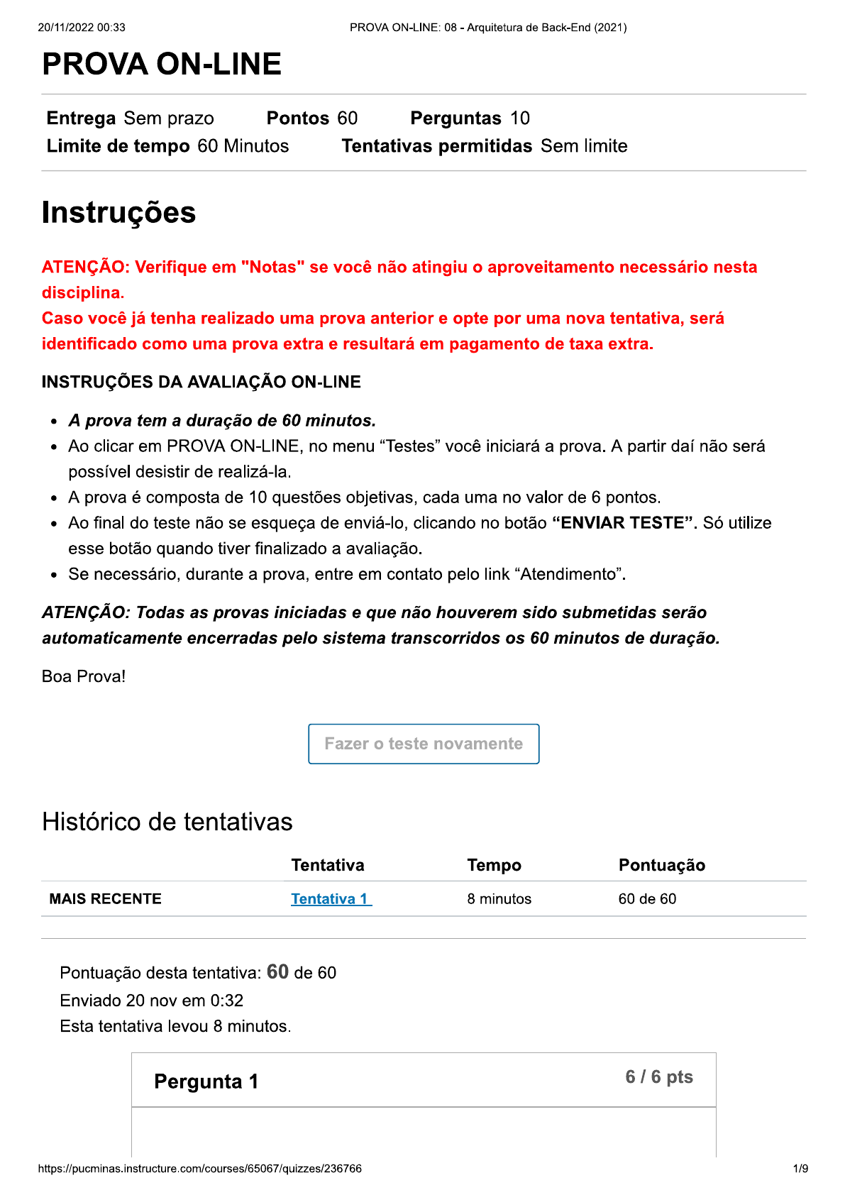 <p>20/11/2022 00:33 PROVA 08 - Arquitetura de Back-End (2021) PROVA ON-LINE Entrega Sem prazo Pontos 60 Perguntas 10 Limite de tempo 60 Minutos Tentativas permitidas Sem limite Instruções ATENÇÃO: Verifique em "Notas" se você não atingiu aproveitamento necessário nesta disciplina. Caso você já tenha realizado uma prova anterior e opte por uma nova tentativa, será identificado como uma prova extra e resultará em pagamento de taxa extra. INSTRUÇÕES DA AVALIAÇÃO ON-LINE A prova tem a duração de 60 minutos. Ao clicar em PROVA no menu "Testes" você iniciará a prova. A partir daí não será possível desistir de realizá-la. A prova é composta de 10 questões objetivas, cada uma no valor de 6 pontos. Ao final do teste não se esqueça de enviá-lo, clicando no botão "ENVIAR TESTE". Só utilize esse botão quando tiver finalizado a avaliação. Se necessário, durante a prova, entre em contato pelo link "Atendimento". ATENÇÃO: Todas as provas iniciadas e que não houverem sido submetidas serão automaticamente encerradas pelo sistema transcorridos os 60 minutos de duração. Boa Prova! Fazer teste novamente Histórico de tentativas Tentativa Tempo Pontuação MAIS RECENTE Tentativa 1 8 minutos 60 de 60 Pontuação desta tentativa: 60 de 60 Enviado 20 nov em 0:32 Esta tentativa levou 8 minutos. Pergunta 1 6/6 pts https://pucminas.instructure.com/courses/65067/quizzes/236766 1/9</p><p>20/11/2022 00:33 PROVA ON-LINE: 08 - Arquitetura de Back-End (2021) A Internet das coisas tem trazido a necessidade de aplicações com escalabilidade sob demanda e um estilo de computação chamada de Reactive tem se popularizado. Neste contexto, Funções como serviços (FAAS) podem ser usados para responder a vários tipos de eventos para arquiteturas reativas. Alguns dos eventos normalmente suportados por funções como serviços (FAAS) incluem: Movimentação de mouse e teclado, alterações em filas de mensagens e chamadas HTTP. Alterações em banco de dados, alterações em filas de mensagens e entrada de dados de teclados. Correto! Chamadas HTTP, alterações em filas de mensagens e alterações em banco de dados. Renderização de HTML, chamadas HTTP e alterações em filas de mensagens. Pergunta 2 6/6 pts Java EE é uma das plataformas mais conhecidas para a montagem de arquiteturas de Back-end e microsserviços. Ela possui diversas tecnologias para a criação de aplicações servidoras de serviços. É INCORRETO dizer sobre tecnologias de back-end do Java EE: https://pucminas.instructure.com/courses/65067/quizzes/236766 2/9</p><p>20/11/2022 00:33 PROVA ON-LINE: 08 - Arquitetura de Back-End (2021) Correto! JAX-WS, padrão moderno e introduzido no Java EE 6, tornou o JAX- RS obsoleto. JAX-WS foi introduzido no Java EE 1.4. E ele não tornou o JAX-RS obsoleto. JAX-WS suporta o protocolo de envelopamento SOAP e suporta diversos protocolos de transporte tais como HTTP, JMS ou TCP-IP. JCA (Java Connector Architecture) é usado para permitir a conectividade de Java a sistemas legados como por exemplo SAP ECC ou COBOL. JAX-RS pode ser usado para trafegar dados em formato JSON e também em XML. Pergunta 3 6/6 pts As arquiteturas de back-end e microsserviços são baseados no protocolo HTTP. Esse protocolo, sem estado e orientado a conexões, é a peça fundamental através da qual serviços e APIs operam. É CORRETO dizer sobre o protocolo HTTP: Correto! Os métodos PUT, DELETE e GET são considerados idempotentes. https://pucminas.instructure.com/courses/65067/quizzes/236766 3/9</p><p>20/11/2022 00:33 PROVA 08 - Arquitetura de Back-End (2021) 8.1.3 (https://tools.ietf.org/html/rfc7231#section 8.1.3)_. Registrations The "Hypertext Transfer Protocol (HTTP) Method Registry" h as been populated with the registrations below: + I Method Safe Idempotent Reference + CONNECT no no Section 4.3.6 (https://to DELETE no yes Section 4.3.5 (https://to GET yes yes Section 4.3.1 (https://to HEAD yes I yes Section 4.3.2 (https://to OPTIONS yes yes Section 4.3.7 (https://to POST no no Section 4.3.3 (https://to PUT no yes Section 4.3.4 (https://to TRACE yes yes Section 4.3.8 (https://to https://tools.ietf.org/html/rfc7231 Os métodos INCLUDE e POST podem ser usados para criar novos recursos em servidores Web. Os métodos GET e POST são seguros. método POST processa parâmetros somente através da Query String. Pergunta 4 6/6 pts Microsserviços normalmente possuem seus próprios repositórios de dados e isso traz implicações sobre o desenho de transações de sistemas distribuídos. https://pucminas.instructure.com/courses/65067/quizzes/236766 4/9</p><p>20/11/2022 00:33 PROVA ON-LINE: 08 - Arquitetura de Back-End (2021) Sobre transações em microsserviços pode-se dizer que: Correto! Eles não suportam transações distribuídas e trabalham com o paradigma chamado de consistência eventual. Eles suportam os aspectos C e P do teorema de CAP. Eles suportam os aspectos C, A e P do teorema de CAP. Eles suportam os aspectos C e A do teorema de CAP. Pergunta 5 6/6 pts Uma API representa um conjunto de serviços que podem ser consumidos por diferentes dispositivos e plataformas tecnológicas. Na plataforma Microsoft, o WCF e o ASP.NET Web API são tecnologias que podem suportar o desenvolvimento de APIs. É CORRETO dizer sobre essas tecnologias: ASP.NET Web API opera diretamente com protocolo O WCF não suporta protocolos UDP. O ASP.NET WEB API não suporta operação sobre soquetes seguros (SSL). Correto! O WCF suporta protocolos síncronos e assíncronos. Pergunta 6 6/6 pts https://pucminas.instructure.com/courses/65067/quizzes/236766 5/9</p><p>20/11/2022 00:33 PROVA ON-LINE: 08 - Arquitetura de Back-End (2021) Uma API representa um conjunto de serviços que podem ser consumidos por diferentes dispositivos e plataformas tecnológicas. Na plataforma Microsoft, Servlets, EJB, o JAX-RS e o JAX-WS são algumas das tecnologias que podem suportar o desenvolvimento de APIs. Sobre essas tecnologias, É INCORRETO di