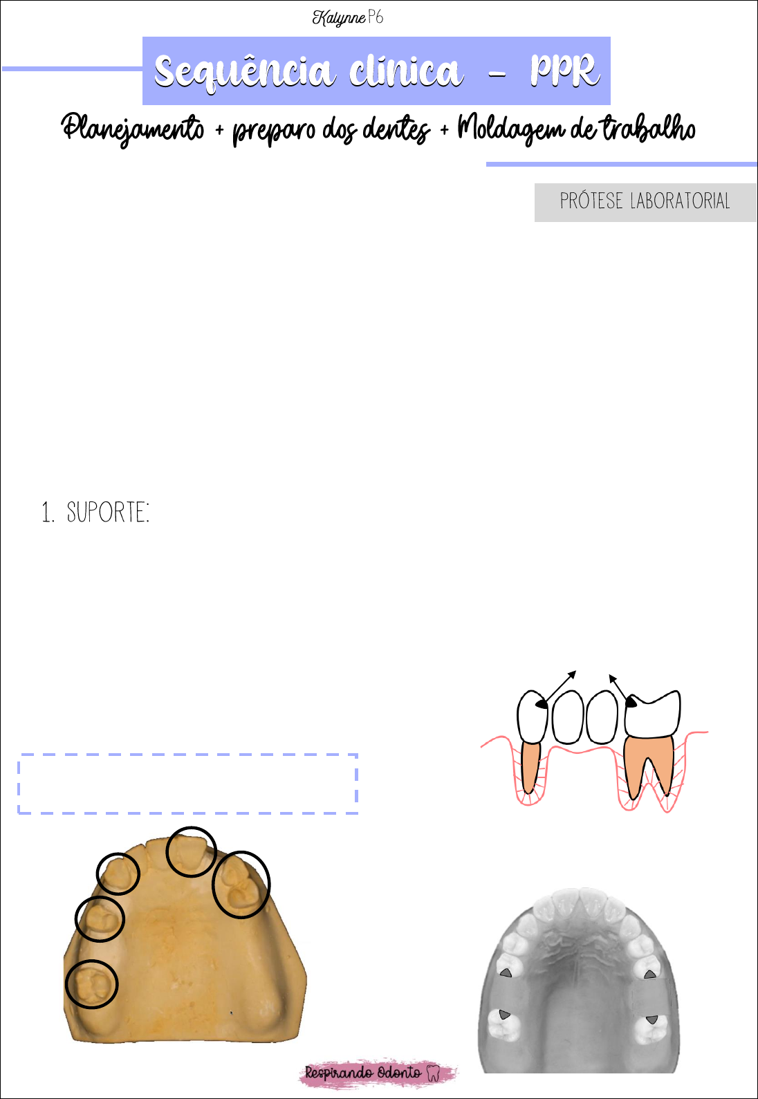 <p>– ODONTOLOGIA UNINASSAU RN - @respirando_odonto</p><p>Planejamento:</p><p>• Planejar: ato de projetar, estruturar e programar. É a</p><p>elaboração mental da PPR sob bases científicas.</p><p>• O desenho da PPR: é o ato de registrar graficamente o</p><p>planejamento.</p><p>Esse planejamento será baseado em princípios biomecânicos: que</p><p>visam neutralizar ou diminuir os movimentos da PPR. Esses</p><p>princípios são:</p><p>1. Suporte: resistência às forças ocluso-gengivais;</p><p>2. Retenção: resistência às forças gengivo-oclusais;</p><p>3. Estabilidade: resistência às forças horizontais.</p><p>O princípio de suporte refere-se à propriedade da PPR de</p><p>resistir ao deslocamento vertical no sentido oclusogengival.</p><p>• Os elementos da PPR responsáveis pelo suporte, são:</p><p>▪ Apoios;</p><p>▪ Conector maior maxilar;</p><p>▪ Superfície basal da sela.</p><p>Os APOIOS são os principais elementos que conferem o suporte</p><p>necessário para impedir o deslocamento da PPR durante a</p><p>mastigação.</p><p>Tipos de suporte:</p><p>• Dentossuportada:</p><p>▪ Suportada pelos dentes;</p><p>▪ Os dentes transmitem as forças oclusais</p><p>transmitidas pela prótese para o osso;</p><p>▪ A prótese fica apenas encostada na</p><p>fibromucosa, não chega a ser um suporte;</p><p>▪ O principal objetivo desse tipo de prótese é</p><p>proteger as papilas gengivais;</p><p>▪ Se o suporte for deficiente, pode resultar em</p><p>esmagamento das papilas, além de gerar</p><p>inflamação tecidual na região, podendo</p><p>progredir para uma reabsorção óssea no</p><p>local;</p><p>▪ Dessa forma, em espaços protéticos</p><p>intercalados, o apoio deverá estar geralmente</p><p>adjacente ao espaço protético, minimizando a</p><p>incidência de forças oblíquas ao periodonto.</p><p>Apoio adjacente ao espaço protético</p><p>Os apoios serão planejados próximo/vizinho aos espaços</p><p>protéticos.</p><p>TODOS os dentes pilares vizinho ao espaço protético devem</p><p>ter apoios.</p><p>Apoios</p><p>– ODONTOLOGIA UNINASSAU RN - @respirando_odonto</p><p>• Dentomucossuportada:</p><p>▪ Suportada pelos dentes e fibromucosa;</p><p>▪ No planejamento de uma PPR</p><p>dentomucossuportada, o princípio de suporte</p><p>torna-se complexo pela presença de duas vias</p><p>de transmissão de forças que respondem de</p><p>forma diferente frente aos esforços</p><p>mastigatórios: o dente e a fibromucosa;</p><p>Quando há esse movimento de alavanca, haverá uma linha de</p><p>fucro, que é uma linha imaginária pela qual tende a movimentar a</p><p>prótese. Ela passa pelos principais apoios.</p><p>A prótese irá tender a rotacionar para frente e para trás,</p><p>baseado nessa linha.</p><p>As regiões onde ficam o apoios, irão determinar a linha de fucro.</p><p>Quando os apoios são na mesial do dente, o fulcro é alterado e</p><p>isso melhora as forças que serão incididas sobre essa prótese.</p><p>Então, os apoios devem ser posicionados na região mesial dos</p><p>dentes pilares adjacentes à extremidade livre.</p><p>Se chama alvanca de segundo gênero.</p><p>Se a prótese tiver desadaptada (com folga), toda vez que o</p><p>paciente morder, ela irá se movimentar. Isso prejudica a área de</p><p>suporte, inflama a região e osso pode rabsorver cada vez mais.</p><p>Para minimizar essa reabsorção por trauma, a sela deve ser</p><p>bem adaptada à fibromucosa, enconstando e abraçando a</p><p>fibromucosa, para diminuir a movimentação e o efeito alavanca.</p><p>Para conseguir essa adptação, é necessário fazer uma moldagem</p><p>funcional na área desdentada.</p><p>O ligamento periodontal tem resiliência de 0,1 mm e a</p><p>fibromucosa possui uma resiliência que pode variar de 0,2 a</p><p>2 mm (podendo chegar até 20X mais que a do dente). Isso</p><p>significa que a fibromucosa pode se deformar muito mais (é</p><p>muito resiliente). Se a fibromucosa deforma muito, a área da</p><p>prótese também acompanha essa deformação, pois a</p><p>fibromucosa deforma mais que o dente. Por isso, tem-se o</p><p>movimento de alavanca.</p><p>Quando uma força for incidida na prótese (nos dentes</p><p>artificiais), como a fibromucosa é mais resiliente, a prótese</p><p>vai acompanhar a movimentação.</p><p>• Quanto menos dentes houver na cavidade, pior</p><p>será a PPR, pois haverá mais movimentos de</p><p>alavanca.</p><p>Potência</p><p>Resistência</p><p>Prótese desadaptada Prótese adaptada</p><p>– ODONTOLOGIA UNINASSAU RN - @respirando_odonto</p><p>O princípio de retenção é caracterizado pela resistência da</p><p>prótese ao deslocamento no sentido gengivo-oclusal. Os principais</p><p>elementos responsáveis pela retenção mecânica de uma PPR</p><p>pode ser retentores (grampos) diretos ou indiretos.</p><p>• Retentores diretos – ficam vizinho ao espaço protético.</p><p>• Retentores indiretos – ficam distante do espaço</p><p>protético, atuam na retenção e estabilidade da prótese.</p><p>São utilizados para tentar equilibrar a retenção.</p><p>Minimiza a rotação da PPR.</p><p>Uma linha tangencial é traçada a partir da linha de</p><p>fucro para saber aonde o retentor indireto irá ficar</p><p>(diminuindo a rotação dessa prótese).</p><p>No caso da dentomucosuportada: sempre será necessário o</p><p>retentor indireto, pois essa prótese tende muito a rotacionar.</p><p>Sempre traçando uma tangente a partir da linha de fucro.</p><p>SELEÇÃO DOS GRAMPOS PARA EXTREMIDADES LIVRES:</p><p>Em áreas de extremidade livre, dá-se preferência aos grampos</p><p>por ação de ponta, principalmente nas formas em “i” e “T”,</p><p>devido ao seu desenho simples, melhor estética, menor potencial</p><p>de gerar torque aos dentes pilares, maior flexibilidade e efetiva</p><p>retenção por ação de tropeçamento.</p><p>O princípio da estabilidade refere-se à resistência da PPR às</p><p>forças no sentido horizontal