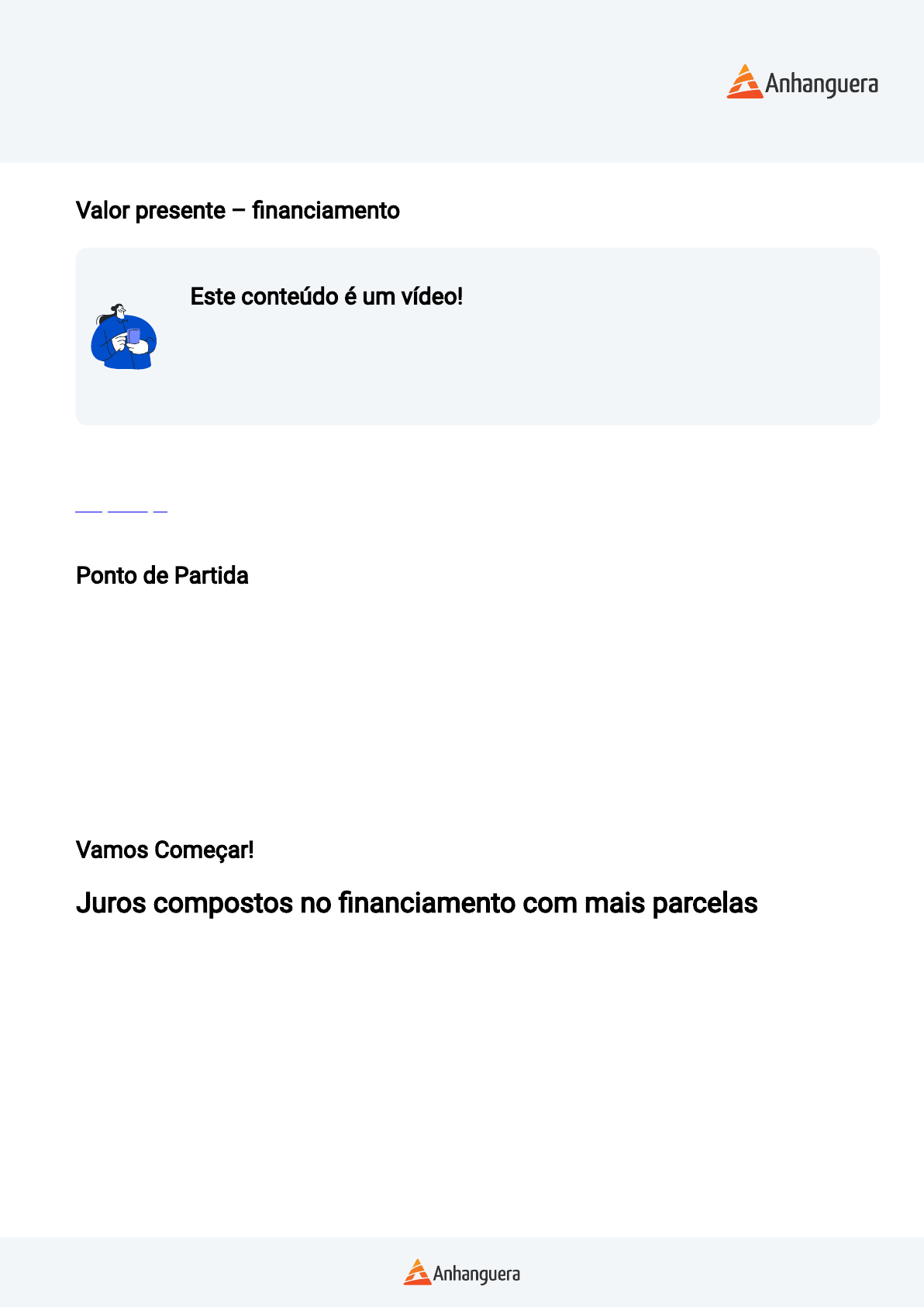 <p>Disciplina</p><p>MATEMÁTICA FINANCEIRA</p><p>Valor presente – �nanciamento</p><p>Este conteúdo é um vídeo!</p><p>Para assistir este conteúdo é necessário que você acesse o AVA pelo</p><p>computador ou pelo aplicativo. Você pode baixar os vídeos direto no aplicativo</p><p>para assistir mesmo sem conexão à internet.</p><p>Estudante, esta videoaula foi preparada especialmente para você. Nela, você irá aprender</p><p>conteúdos importantes para a sua formação pro�ssional. Vamos assisti-la? Bons estudos!</p><p>Clique aqui para acessar os slides da sua videoaula.</p><p>Ponto de Partida</p><p>Nesta aula, você fará uma análise sobre �nanciamentos, sejam eles de um veículo, um imóvel,</p><p>entre outros, além de compreender sobre características de um �nanciamento e a utilização da</p><p>fórmula do valor presente para seu cálculo.</p><p>Para melhor compreender sobre o assunto, imagine que você deseja �nanciar um veículo cujo</p><p>valor à vista é R$ 38.000,00. Uma loja apresentou uma proposta de 48 vezes mensais e iguais</p><p>sob a taxa efetiva de 1,51% a.m.</p><p>Qual será o valor da parcela dessa proposta de �nanciamento e como você faria para resolver</p><p>essa situação? Para isso, vamos dar início ao nosso estudo!</p><p>Vamos Começar!</p><p>Juros compostos no �nanciamento com mais parcelas</p><p>Em nosso dia a dia, muitas vezes, somos colocados em situações nas quais são oferecidas</p><p>diversas formas de pagar alguma compra, como parcelar em valores mensais e iguais uma</p><p>geladeira, uma casa, um carro, entre outros. Mas, a�nal, como são realizados os cálculos em</p><p>diferentes �nanciamentos?</p><p>O �nanciamento tem como base de cálculo a série de juros compostos, que também pode ser</p><p>chamado de valor presente. Utilizamos a série de juros compostos quando estamos fazendo</p><p>cálculos de parcelas e prestações, mas com quantidades pequenas de parcelas, que não</p><p>precisam ser periódicas e nem iguais.</p><p>Já no caso de �nanciamento em juros compostos, com grande quantidade de parcelas</p><p>periódicas iguais, fazemos uso da fórmula do valor presente, um caso particular de séries de</p><p>juros compostos. O valor presente refere-se ao �nanciamento em juros compostos e por se tratar</p><p>de uma relação �nanceira a longo prazo, geralmente, suas parcelas ocorrem em relação mensal.</p><p>Disciplina</p><p>MATEMÁTICA FINANCEIRA</p><p>No cálculo do valor presente, ou seja, no �nanciamento, faz-se uso da taxa de juros compostos, o</p><p>que consequentemente nos leva ao uso da taxa efetiva. Por isso, importante ressaltar que a taxa</p><p>nominal deve ser convertida para efetiva quando necessário fazer esse tipo de cálculo.</p><p>Um exemplo para compreender sobre o valor presente pode ser situação de um �nanciamento</p><p>imobiliário com 300 parcelas iguais e mensais sob uma taxa efetiva de 7,8% a.a. Neste caso,</p><p>temos uma quantidade grande de parcelas periódicas e iguais, além de trabalharmos com uma</p><p>taxa efetiva.</p><p>Figura 1 | Juros. Fonte: Freepik.</p><p>Siga em Frente...</p><p>Financiamentos</p><p>Em nosso cotidiano é comum usar �nanciamentos para aquisição de bens. Um �nanciamento é</p><p>quando alguém empresta uma determinada quantia em dinheiro a uma pessoa ou a uma</p><p>empresa. Quando acontece um empréstimo de dinheiro, por exemplo, quem empresta cobra uma</p><p>porcentagem de juros sobre o valor emprestado, o que exige conhecimento para escolha da</p><p>melhor taxa de juros para cada situação.</p><p>É muito comum fazer uso de empréstimos de instituições bancárias, com um período pré-</p><p>determinado para sua liquidação e nessas situações o valor dos juros é calculado de acordo com</p><p>o valor do empréstimo, bem como conforme a taxa percentual aplicada pelo banco.</p><p>Muito se fala na aquisição de bens sem a necessidade de �nanciamentos, no entanto, tudo</p><p>depende do cenário e contexto de cada um, pois muitas vezes se realiza um �nanciamento para</p><p>Disciplina</p><p>MATEMÁTICA FINANCEIRA</p><p>a expansão de negócios lucrativos, �nanciamento de equipamentos, instalações, entre outros, o</p><p>que pode compensar no �nal das contas.</p><p>Existem diferentes tipos de �nanciamento, mas o exemplo a ser estudado nesta seção é do</p><p>cálculo de parcelas iguais e periódicas no regime de capitação de juros compostos, ou seja, taxa</p><p>efetiva.</p><p>Cálculo de prestações</p><p>Para o cálculo de �nanciamentos com parcelas periódicas e iguais, podemos usar a fórmula do</p><p>valor presente:</p><p>Onde:</p><p>VP: valor presente, capital, valor à vista.</p><p>parc: parcela, prestações iguais.</p><p>n: número total de parcelas, prestações iguais e periódicas.</p><p>i: taxa de juros compostos, taxa efetiva.</p><p>Tal fórmula apresenta uma vantagem em trabalhar com parcelamentos de número muito grande</p><p>de prestações iguais, como 60, 120, 180 parcelas. As parcelas sempre deverão ter vencimentos</p><p>periódicos, como mensais, bimestrais, semestrais, entre outros. Vejamos um exemplo:</p><p>Ana Alice comprou um aparelho celular em 10 parcelas mensais e iguais de R$ 150,00 sob taxa</p><p>efetiva de 2,5% a.m. Qual o valor à vista do aparelho celular?</p><p>Primeiramente, vamos extrair os valores do problema:</p><p>Substituindo os valores na fórmula, temos:</p><p>V P = parc. [ 1−(1+i)−n</p><p>i ]</p><p>V P =?</p><p>parc = 150,00</p><p>n = 10 parcelas mensais e iguais.</p><p>i = 2,5% a.m = 0,025 a.m</p><p>VP = parc[ 1−(1+i)−n</p><p>i</p><p>]</p><p>AV = V P = 150[ 1−(1+0,025)−10</p><p>0,025</p><p>]</p><p>Disciplina</p><p>MATEMÁTICA FINANCEIRA</p><p>Logo, o valor à vista do aparelho celular é de R$ 1.312,80.</p><p>Vamos Exercitar?</p><p>Para colocar em prática os conceitos vistos, imagine que você deseja �nanciar um veículo cujo</p><p>valor à vista é R$ 38.000,00. Uma 