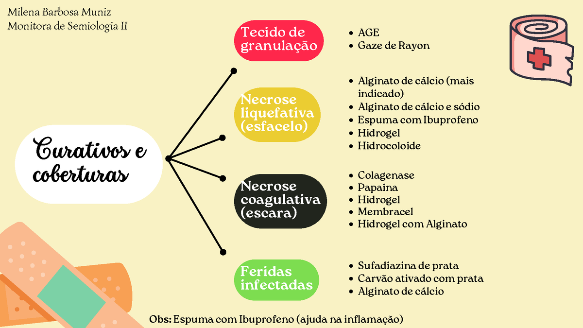 <p>Monitora de Semiologia II Tecido de AGE granulação Gaze de Rayon Alginato de cálcio (mais Necrose indicado) liquefativa Alginato de cálcio e sódio (esfacelo) Espuma com Ibuprofeno Hidrogel Curativos e Hidrocoloide coberturas Colagenase Necrose Papaína coagulativa Hidrogel (escara) Hidrogel com Alginato Feridas Sufadiazina de prata infectadas Carvão ativado com prata Alginato de cálcio Obs: Espuma com Ibuprofeno (ajuda na inflamação)</p>