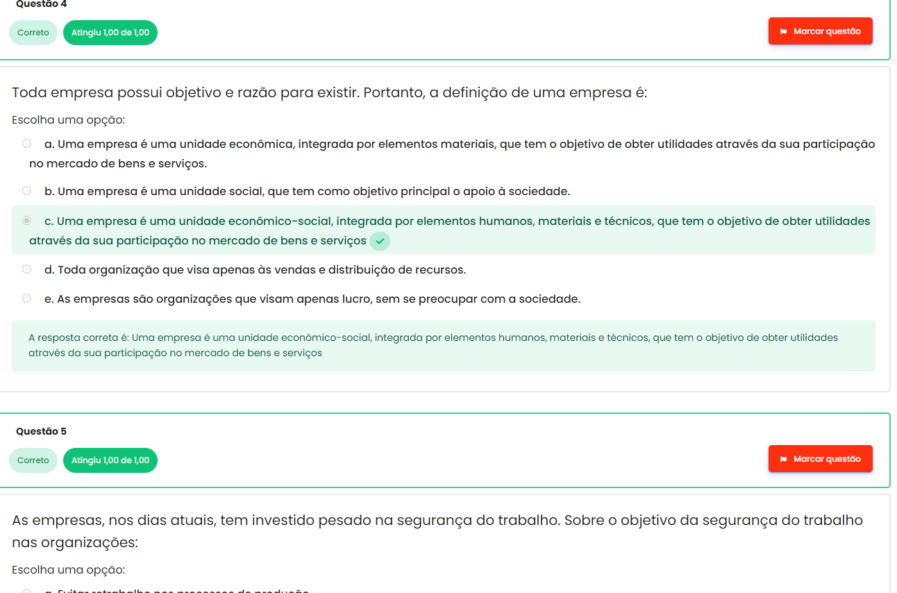<p>Questão 4 Correto Atingiu 1,00 de 1,00 Marcar questão Toda empresa possui objetivo e razão para Portanto, a definição de uma empresa é: Escolha uma opção: a. Uma empresa é uma unidade econômica, integrada por elementos materiais, que tem objetivo de obter utilidades através da sua participação no mercado de bens e serviços. b. Uma empresa é uma unidade social, que tem como objetivo principal apoio à sociedade. C. Uma empresa é uma unidade integrada por elementos humanos, materiais e técnicos, que tem o objetivo de obter utilidades através da sua participação no mercado de bens e serviços d. Toda organização que visa apenas às vendas e distribuição de recursos. e. As empresas são organizações que visam apenas lucro, sem se preocupar com a sociedade. A resposto correta é: Uma empresa é uma unidade integrada por elementos humanos, materiais e técnicos, que tem objetivo de obter utilidades através da sua participação no mercado de bens e serviços Questão 5 Correto Atingiu 1,00 de 1,00 Marcar questão As empresas, nos dias atuais, tem investido pesado na segurança do trabalho. Sobre objetivo da segurança do trabalho nas organizações: Escolha uma opção:</p>