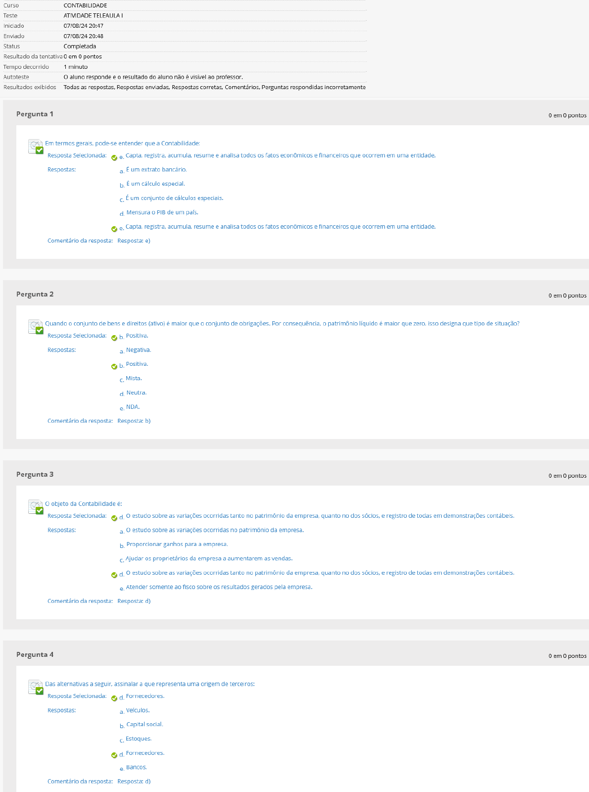 <p>Curso CONTABILIDADE Teste ATIVIDADE TELEAULA Iniciado 07/08/24 20:47 Enviado 07/08/24 20:48 Status Completada Resultado da tentativa 0 em 0 pontos Tempo decorrido 1 minuto Autoteste o aluno responde e o resultado do aluno não é visível ao professor. Resultados exibidos Todas as respostas, Respostas enviadas, Respostas corretas, Perguntas respondidas incorretamente Pergunta 1 0 em 0 pontos Em termos gerais, pode-se entender que a Contabilidade: Resposta Selecionada: e. Capta, registra, acumula, resume e analisa todos os fatos econômicos e financeiros que ocorrem em uma entidade. Respostas: a. É um extrato bancário. b. É um cálculo especial. É um conjunto de cálculos especiais. d. Mensura PIB de um país. e. Capta, registra, acumula, resume e analisa todos os fatos econômicos e financeiros que ocorrem em uma Comentário da resposta: Resposta: e) Pergunta 2 0 em 0 pontos Quando conjunto de bens e direitos (ativo) é maior que conjunto de obrigações. Por consequência, patrimônio líquido é maior que zero, isso designa que tipo de situação? Resposta Selecionada: b. Positiva. Respostas: a. Negativa. b. Positiva. Mista. d. Neutra. e. NDA. Comentário da resposta: Resposta: b) Pergunta 3 0 em 0 pontos objeto da Contabilidade é: Resposta Selecionada: d. estudo sobre as variações ocorridas tanto no patrimônio da empresa, quanto no dos sócios, e registro de todas em demonstrações Respostas: a. estudo sobre as variações ocorridas no patrimônio da empresa. b. Proporcionar ganhos para a empresa. Ajudar os proprietários da empresa a aumentarem as vendas. d. estudo sobre as variações ocorridas tanto no patrimônio da empresa, quanto no dos sócios, e registro de todas em demonstrações e. Atender somente ao fisco sobre os resultados gerados pela empresa. Comentário da resposta: Resposta: d) Pergunta 4 0 em 0 pontos Das alternativas a seguir, assinalar a que representa uma origem de terceiros: Resposta Selecionada: d. Respostas: a. Veículos. b. Capital social. C. Estoques. d. Fornecedores. e. Bancos. Comentário da resposta: Resposta: d)</p>