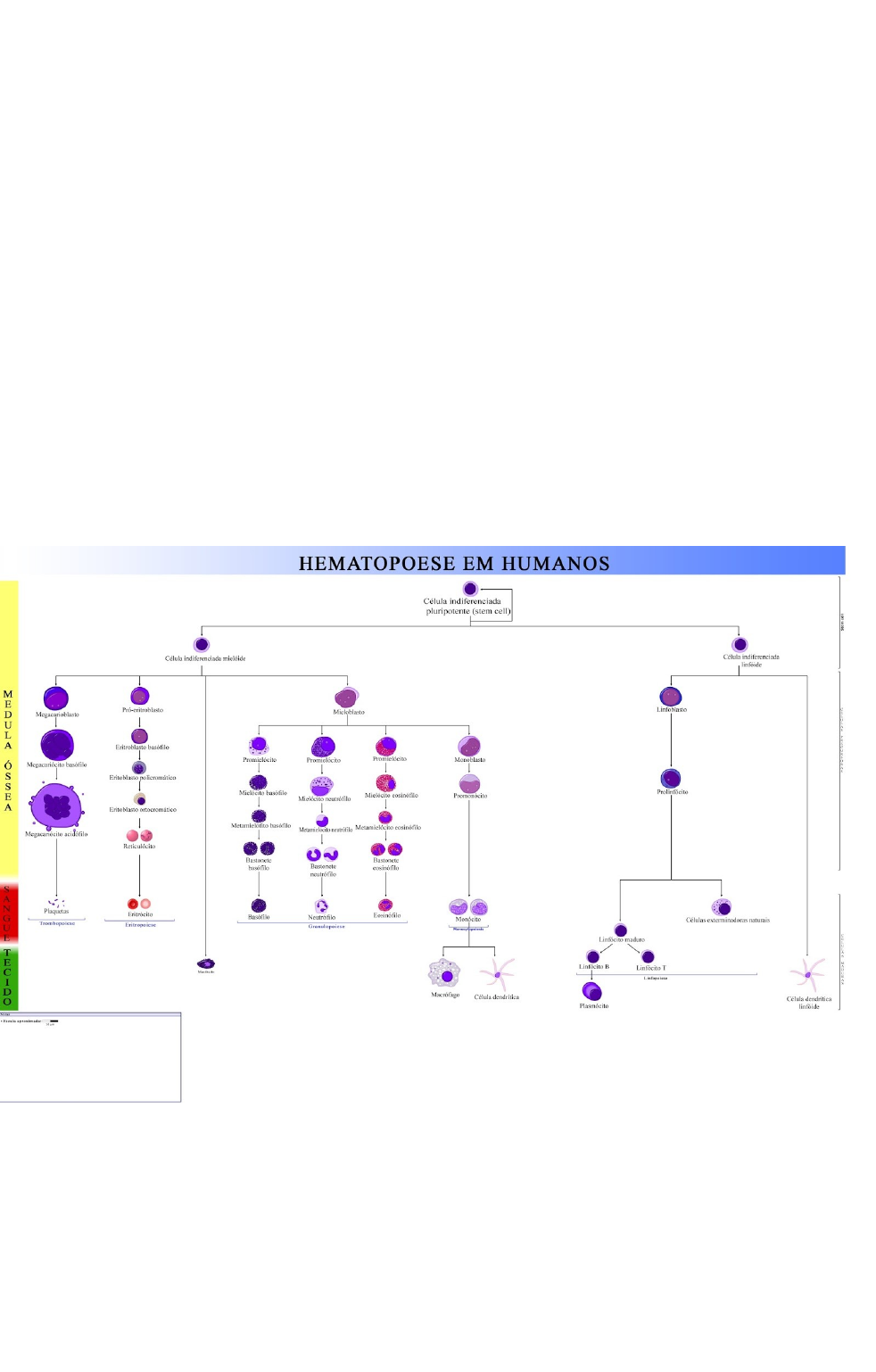 <p>1° Módulo:</p><p>Introdução</p><p>Hematologia é o ramo da biologia que estuda o sangue. A palavra é composta pelos radicais gregos: Haima (de haimatos), "sangue" e lógos, "estudo, tratado, discurso".</p><p>A Hematologia estuda, particularmente, os elementos figurados do sangue: hemácias (glóbulos vermelhos), leucócitos (glóbulos brancos) e plaquetas. Estuda, também, a produção desses elementos e os órgãos onde eles são produzidos (órgãos hematopoiéticos): medula óssea, baço e linfonodos.</p><p>Por outro lado, além de estudar o estado de normalidade dos elementos sangüíneos e dos órgãos hematopoiéticos, estuda também as doenças a eles relacionadas.</p><p>HEMATOPOIESE é o processo de substituição das células sanguíneas, que ocorrem nos chamados órgãos hematopoiéticos, que compreendem a medula óssea e o sistema linfóide.</p><p>MEDULA ÓSSEA é o mais importante órgão da gênese das mais diversas células sanguíneas, pois lá estão às células tronco que dão origem a células progenitoras de linhagens mielocíticas, linfocítica, megacariócitos e eritroblastos.</p><p>LINHAGEM MIELOCÍTICA compreende os granulócitos polimorfonucleados (neutrófilo,eosinófilo e basófilo) e monócitos.Quando os monócitos migram para os tecidos se transformam em macrófagos, que são células com alto poder de fagocitose.</p><p>LINHAGEM LINFOCÍTICA engloba os linfócitos T e B. Os linfócitos B saem maduros da medula óssea enquanto os linfócitos T precisam migrar para o Timo onde irão sofrer o processo de maturação.Os linfócitos B ainda se diferenciam em plasmócitos quando encontram um antígeno num órgão linfóide secundário e secretam anticorpos nos tecidos.</p><p>MEGACARIÓCITO partes de seu citoplasma dão origem às plaquetas, responsáveis pela coagulação sanguínea.</p><p>em 3D</p><p>ERITROPOIESE é o processo de produção de eritrócitos. Em humanos adultos, a eritropoiese ocorre na medula óssea, mas fetos e em situações especiais como anemias severas pode ocorrer em outros órgãos, principalmente no fígado e no baço.</p><p>ERITROBLASTO origina as hemácias do sangue, que atuam nas trocas gasosas.</p><p>2° Módulo:</p><p>Hemoglobina e Hemograma</p><p>HEMOGLOBINA</p><p>Estrutura</p><p>A hemoglobina é um tetrâmero composto de duas de cada dois tipos de cadeias de globina, a alfa e a beta. Cada uma dessas cadeias contém cerca de 141 aminoácidos. Existem quatro grupos heme por proteína; estes possuem um íon de ferro no seu centro, que liga a molécula de O2. É uma proteína alostérica, pois a ligação e a liberação do oxigênio é regulada por mudanças na estrutura provocadas pela própria ligação do oxigénio ao grupo heme.</p><p>Existem três tipos de hemoglobina, devido a variação na cadeia polipeptidica: Hemoglobina A1, Hemoglobina A2 e Hemoglobina F.</p><p>Distribuição do Oxigênio</p><p>A distribuição é feita através da interação da hemoglobina com o oxigênio do ar (que pode ser inspirado ou absorvido, como na respiração cutânea). Devido a isto, forma-se o complexo oxi-hemoglobina, representado pela notação HbO2. Chegando às células do organismo, o oxigênio é liberado e o sangue arterial (vermelho) transforma-se em venoso (vermelho arroxeado). A hemoglobina livre pode ser reutilizada no transporte do oxigênio. A hemoglobina distribui o oxigênio para as todas as partes do corpo irrigadas por vasos sanguíneos.</p><p>Localização</p><p>A hemoglobina pode ser encontrada dispersa no sangue (em grupos animais simples) ou em várias células especializadas (as hemácias de animais mais complexos).</p><p>O aumento de glóbulos vermelhos no sangue (eritrocitose) geralmente se dá por uma adaptação fisiológica do organismo em locais de altitude elevada. Uma vez que o aumento de glóbulos vermelhos favorece o transporte de oxigênio pelo sangue, seu uso melhora a performance de atletas, principalmente em esportes que necessitem muita resistência. Quando os atletas realizam treino em locais de alta altitude, a pequena concentração de oxigênio estimula a produção natural de EPO (Eritropoietina, hormônio que aumenta o número de GV e da capacidade muscular) e ao retornar às baixas altitudes, seu corpo está mais preparado e sua resistência está maior.</p><p>HEMOGRAMA</p><p>HEMOGRAMA é um exame realizado que avalia as células sanguíneas de um paciente. O exame é requerido pelo médico para diagnosticar ou controlar a evolução de uma doença. Que compreende o eritrograma, leucograma e plaquetograma.</p><p>Coleta de sangue</p><p>O sangue do indíviduo é colhido com anticoagulante (EDTA), para se evitar a coagulação do mesmo. Não há necessidade de colher o sangue com o indivíduo em jejum.</p><p>Processo Manual</p><p>Contagens manuais do número de hemácias e leucócitos podem ser feitos em câmara de Neubauer, após uma diluição prévia do sangue. O método dificilmente é usado, sendo usado em poucos casos de dúvidas da metodologia automática.</p><p>O esfregaço de sangue é usado para fazer uma diferenciação entre os leucócitos, isto é, fazer uma contagem do número de neutrófilos, linfócitos, monócitos, eosinófilos e basófilos. Chegando-se a uma porcentagem de cada célula encontrada. Usado também para avaliar a série vermelha e as plaquetas. É feito com uma pequena gota de sangue sendo colocada sobre uma lâmina de vidro, onde o técnico fará um esfregaço, arrastando a gota de sangue com outra lâmina de vidro, com isso forma-se uma película. O sangue tem que ser homogenizado antes de se fazer o esfregaço para que as células estejam bem destribuídas. O esfregaço é corado com Leishman ou Giemsa. E observado em microscópio com objetiva de aumento de 100X.</p><p>A vantagem de se fazer um hemograma é que algumas células podem ser contadas erradamente pelos processos automáticos. Alguns aparelhos não contam células imaturas e podem levar a um erro quanto 