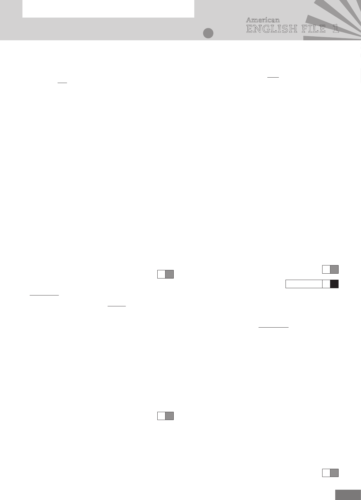 <p>1</p><p>NAME CLASS</p><p>End-of-course Test</p><p>Grammar, Vocabulary, and Pronunciation A</p><p>American English File 1 Photocopiable © Oxford University Press 2013</p><p>American</p><p>ENGLISH FILE 1</p><p>3 Complete the sentences with the correct form of</p><p>the verbs in parentheses.</p><p>Example: Mark and Emma have (have) a house in</p><p>Portugal.</p><p>1 I ________ (not be) to Egypt. Is it nice?</p><p>2 He________ (not ask) for a cappuccino – he asked</p><p>for a latte.</p><p>3 ________ she ________ (travel) to India next</p><p>summer?</p><p>4 Colin ________ (not be) at work yesterday.</p><p>5 I ________ (buy) a new car last week.</p><p>6 She ________ (not listen) to music at the moment.</p><p>7 I ________ (start) cooking classes next week.</p><p>8 Where ________ (be) he yesterday morning?</p><p>9 ________ you ever ________ (break) your leg?</p><p>10 “How often ________ you ________ (go) to the</p><p>theater?” “Every month.”</p><p>11 Emma ________ (write) him a letter two days ago.</p><p>12 Who ________ (be) the three greatest politicians of</p><p>the twentieth century?</p><p>13 He has an exam tomorrow, so he ________ (study)</p><p>now.</p><p>14 She ________ (not like) using elevators.</p><p>14</p><p>Grammar total 40</p><p>VOCABULARY</p><p>4 Complete the words in the sentences.</p><p>Example: We go to the supermarket every Saturday</p><p>morning.</p><p>1 The stove’s really d________ . We need to clean it.</p><p>2 I think it’s going to rain. Let’s take an u________.</p><p>3 I gave my brother a w________ – he often loses his</p><p>money.</p><p>4 I read the n________ every day.</p><p>5 The parking lot’s normally full but today it’s pretty</p><p>e________.</p><p>6 I was late for work because the b________ was late.</p><p>7 I usually have a s________ for lunch. I love bread.</p><p>8 She’s listening to the news on the r________.</p><p>9 I want to write something – can I borrow your</p><p>p________, please?</p><p>10 I read two b________ when I was on vacation last</p><p>summer.</p><p>10</p><p>GRAMMAR</p><p>1 Complete the sentences.</p><p>Example: Are they from Switzerland?</p><p>1 I ________ sing, but I can play the guitar.</p><p>2 “How did your phone break?” “________ fell on the</p><p>floor.”</p><p>3 We ________ British. We’re American.</p><p>4 There isn’t ________ milk in the fridge.</p><p>5 “What’s that?” “It’s ________ ID card.”</p><p>6 ________ Holly have any children?</p><p>7 I’m taller ________ my brother.</p><p>8 “Would you like to fly a plane?” “No, I ________.”</p><p>9 The art gallery is closed ________ Mondays.</p><p>10 “What’s the time?” “It’s three ________.”</p><p>11 ________ aren’t many books on the shelf.</p><p>12 I spoke to him on the phone ten minutes ________.</p><p>13 We hardly ________ watch TV on the weekend.</p><p>14 They ________ like the film – they left after 10</p><p>minutes.</p><p>15 “How much coffee do you drink?” “Quite a</p><p>________.”</p><p>16 They are ________ noisiest neighbors on the street.</p><p>16</p><p>2 Underline the correct form.</p><p>Example: My mother work / works in a hospital.</p><p>1 We don’t have some / any money.</p><p>2 My father’s dentist / a dentist.</p><p>3 I have a lot of / a lot brothers and sisters.</p><p>4 We had an excellent meal / a meal excellent.</p><p>5 Please drive careful / carefully. The weather’s bad.</p><p>6 Can we meet on / in Monday evening?</p><p>7 I have always / always have breakfast at home.</p><p>8 It’s raining. Let’s go / We go inside.</p><p>9 I don’t like get up / getting up early.</p><p>10 He’s hoping to study / study law in college.</p><p>10</p><p>2</p><p>NAME CLASS</p><p>End-of-course Test</p><p>Grammar, Vocabulary, and Pronunciation A</p><p>American English File 1 Photocopiable © Oxford University Press 2013</p><p>American</p><p>ENGLISH FILE 1</p><p>3 Marc’s a c________. He works in a French</p><p>restaurant.</p><p>4 I need to cut some paper. Do you have any</p><p>s________?</p><p>5 A p________ is a place where you can buy medicine.</p><p>6 I don’t read books but I like reading m________ and</p><p>newspapers.</p><p>7 Can I see your ID c________, please?</p><p>8 Do you want to c________ a taxi?</p><p>9 I didn’t t________ off my phone and it rang during</p><p>the lesson!</p><p>10 She often t________ by plane.</p><p>11 I usually m________ dinner at 8.00.</p><p>12 I d________ a Volkswagen.</p><p>13 I always w________ up early.</p><p>14 Your son’s daughter is your g________.</p><p>14</p><p>Vocabulary total 40</p><p>PRONUNCIATION</p><p>8 Match the words with the same sounds.</p><p>slow piece friend spell hot breakfast</p><p>said tissue spoke thought juice people</p><p>Example: red friend said</p><p>teacher 1 ________ 2 ________</p><p>wall 3 ________ 4 ________</p><p>shoe 5 ________ 6 ________</p><p>open 7 ________ 8 ________</p><p>red 9 ________ 10 ________</p><p>10</p><p>9 Underline the stressed syllable.</p><p>Example: co|ffee</p><p>1 o|ppo|site 6 to|ma|toes</p><p>2 su|per|mar|ket 7 beau|ti|ful</p><p>3 vege|ta|bles 8 cho|colate</p><p>4 en|gi|neer 9 be|hind</p><p>5 heal|thy 10 un|der|stand</p><p>10</p><p>Pronunciation total 20</p><p>Grammar, Vocabulary, and Pronunciation total 100</p><p>5 Check (✓) A, B, or C to complete the sentences.</p><p>Example: We eat in the ________.</p><p>A bathroom ■ B bedroom ■</p><p>C dining room ■✓</p><p>1 My mother’s brother is my ________.</p><p>A grandfather ■ B nephew ■ C uncle ■</p><p>2 My sister works in an office. She’s a ________.</p><p>A receptionist ■ B musician ■</p><p>C builder ■</p><p>3 I don’t see Pete very much, but we often ________ on</p><p>weekends.</p><p>A download ■ B Skype ■ C search ■</p><p>4 Can I pay by credit ____, please?</p><p>A ticket ■ B money ■ C card ■</p><p>5 I work with sick animals. I’m a ________.</p><p>A lawyer ■ B politician ■ C vet ■</p><p>6 I got your email but I couldn’t open the ___