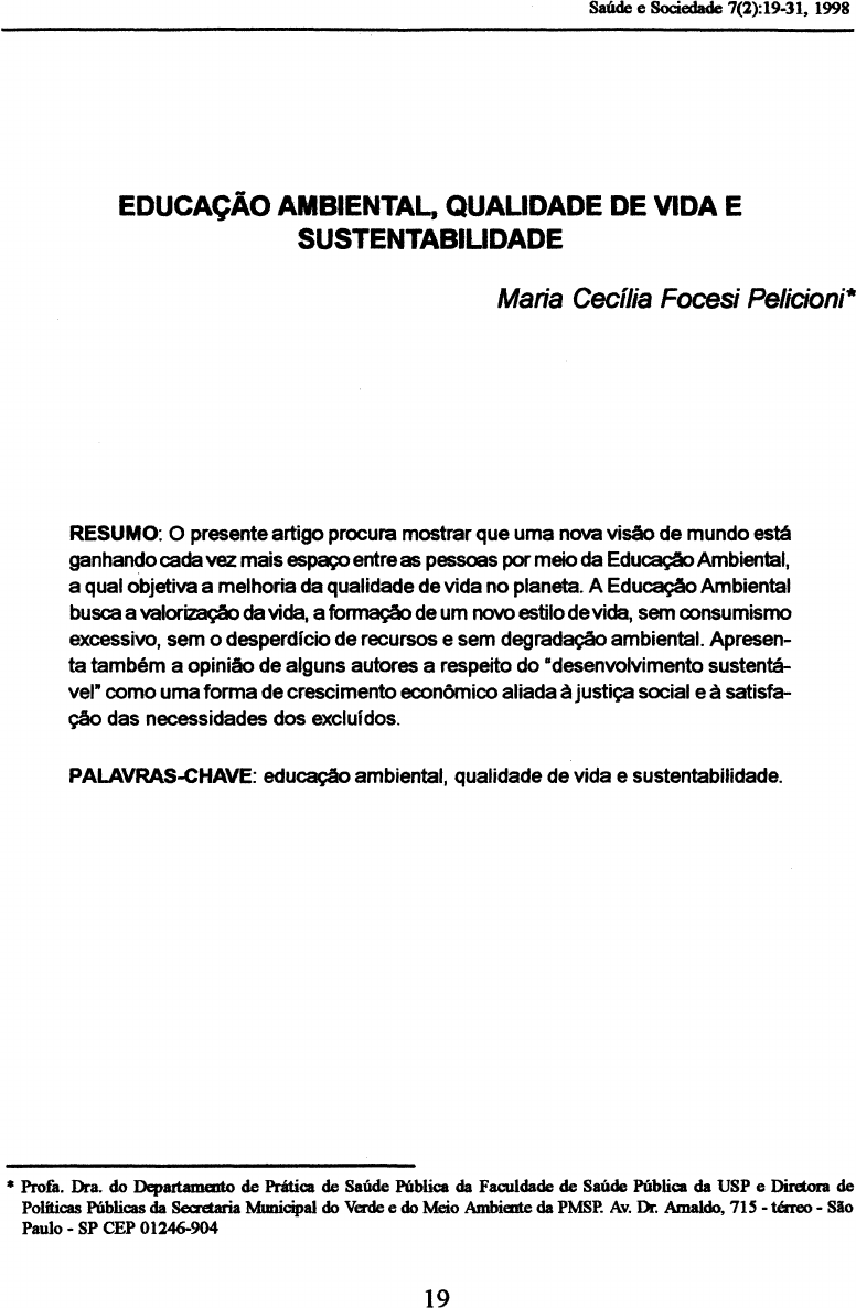 <p>EDUCAÇÃO AMBIENTAL, QUALIDADE DE VIDA E</p><p>SUSTENTABILIDADE</p><p>Maria Cecília Focesi Pelicioni*</p><p>RESUMO: O presente artigo procura mostrar que uma nova visão de mundo está</p><p>ganhando cada vez mais espaço entre as pessoas por meio da Educação Ambiental,</p><p>a qual objetiva a melhoria da qualidade de vida no planeta. A Educação Ambiental</p><p>busca a valorização da vida, a formação de um novo estilo de vida, sem consumismo</p><p>excessivo, sem o desperdício de recursos e sem degradação ambiental. Apresen</p><p>ta também a opinião de alguns autores a respeito do "desenvolvimento sustentá</p><p>vel" como uma forma de crescimento econômico aliada à justiça social e à satisfa</p><p>ção das necessidades dos excluídos.</p><p>PALAVRAS-CHAVE: educação ambiental, qualidade de vida e sustentabilidade.</p><p>* Profa. Dra. do Departamento de Prática de Saúde Pública da Faculdade de Saúde Pública da USP e Diretora de</p><p>Políticas Públicas da Secretaria Municipal do Verde e do Meio Ambiente da PMSP. Av. Dr. Arnaldo, 715 - térreo - São</p><p>Paulo - SP CEP 01246-904</p><p>EDUCAÇÃO AMBIENTAL</p><p>De acordo com a Primeira Conferência Intergovemamental sobre Educação</p><p>Ambiental, realizada em 1977 em Tbilisi, Georgia (ex URSS) a educação ambiental é</p><p>considerada um processo permanente, no qual os indivíduos e a comunidade tomam</p><p>consciência do meio ambiente e adquirem os conhecimentos, os valores, as habilida</p><p>des, as experiências e a determinação que os tomam aptos a agir individual e coletiva</p><p>mente para resolver problemas ambientais presentes e futuros (DIAS, 1992, p. 92).</p><p>Foi definida como uma dimensão dada ao conteúdo e à prática da educação,</p><p>orientada para a resolução dos problemas concretos do meio ambiente através de</p><p>enfoques interdisciplinares e de uma participação ativa e responsável de cada indivíduo</p><p>e da coletividade. Essa definição é adotada no Brasil e pela maioria dos países mem</p><p>bros da Organização das Nações Unidas-ONU (DIAS, 1994, p. IX).</p><p>A Educação Ambiental, de acordo com DIAS (1994), se caracteriza por incorpo</p><p>rar as dimensões sociais, políticas, econômicas, culturais, ecológicas e éticas, o que</p><p>significa que ao tratar de qualquer problema ambiental, deve-se considerar todas as</p><p>dimensões. E continua o autor ..."a maior parte dos problemas ambientais tem suas</p><p>raízes na miséria, que por sua vez é gerada por políticas e problemas econômicos</p><p>concentradores de riqueza e responsáveis pelo desemprego e degradação ambientar.</p><p>Entre as orientações de Tbilisi destaca-se ainda que a Educação Ambiental deve</p><p>considerar o meio ambiente em sua totalidade, em seus aspectos naturais e criados</p><p>pelo homem. Enquanto processo contínuo e permanente a Educação Ambiental, deve</p><p>atingir todas as fases do ensino formal e não formal; deve examinar as questões</p><p>ambientais do ponto de vista local, regional, nacional e internacional, analisando suas</p><p>causas, conseqüências e complexidade. Deve também, desenvolver o senso crítico e</p><p>as habilidades humanas necessárias para resolver tais problemas e utilizar métodos e</p><p>estratégias adequadas para aquisição de conhecimentos e comunicação, valorizando</p><p>as experiências pessoais e enfatizando atividades práticas delas decorrentes (DIAS,</p><p>1994).</p><p>Das recomendações do Seminário Latino-americano realizado em Buenos Aires,</p><p>Argentina em 1988, algumas completam as orientações acima descritas: a Educação</p><p>Ambientai deve fazer parte da política ambiental dos países; adaptar-se às característi-</p><p>cas culturais específicas das populações envolvidas no processo educativo; deve consi</p><p>derar o contexto de subdesenvolvimento dos países da América do Sul e se transformar</p><p>num instrumento idôneo para a integração e o apoio mútuo entre as nações da região.</p><p>Deve também salientar a necessidade de criação de um novo estilo de desenvolvimento</p><p>que inclua crescimento econômico, igualdade social e conservação de recursos natu</p><p>rais, capaz de propiciar relações mais humanas, fraternas e justas entre os homens, e</p><p>destes com o seu entorno natural, atingindo níveis crescentes de qualidade de vida</p><p>(DIAS, 1994, XIV).</p><p>Já durante a Conferência das Nações Unidas sobre o Meio AMbiente e o De</p><p>senvolvimento realizado no Rio de Janeiro em 1992 recomendou-se que a educação</p><p>ambiental deveria: reorientar a educação para o desenvolvimento sustentável de forma</p><p>a compatibilizar objetivos sociais de acesso às necessidades básicas; com objetivos</p><p>ambientais de preservação da vitalidade e diversidade do planeta garantindo como direi</p><p>to aos cidadãos um ambiente ecologicamente saudável e com objetivos econômicos;</p><p>aumentar a conscientização popular; considerar o analfabetismo ambiental e promover</p><p>treinamento.</p><p>As organizações não governamentais reunidas no Fórum Global da Rio-92 for</p><p>mularam o trabalho de Educação Ambiental para Sociedades Sustentáveis e Responsa</p><p>bilidade Global que estabeleceram alguns princípios, dos quais pode-se citar</p><p>- a educação ambiental é um direito de todos, somos todos aprendizes e educa</p><p>dores;</p><p>- deve ter como base o pensamento crítico e inovador em qualquer tempo ou</p><p>lugar em seus modos formal, não formal e informal promovendo a transformação e a</p><p>construção da sociedade.</p><p>- é individual e coletiva. Tem o propósito de formar cidadãos com consciência</p><p>local e planetária que respeitem a autodeterminação dos povos e a soberania das na</p><p>ções;</p><p>- a educação ambiental não é neutra, mas ideológica;</p><p>- deve integrar conhecimentos, aptidões, valores, atitudes e ações, convertendo<