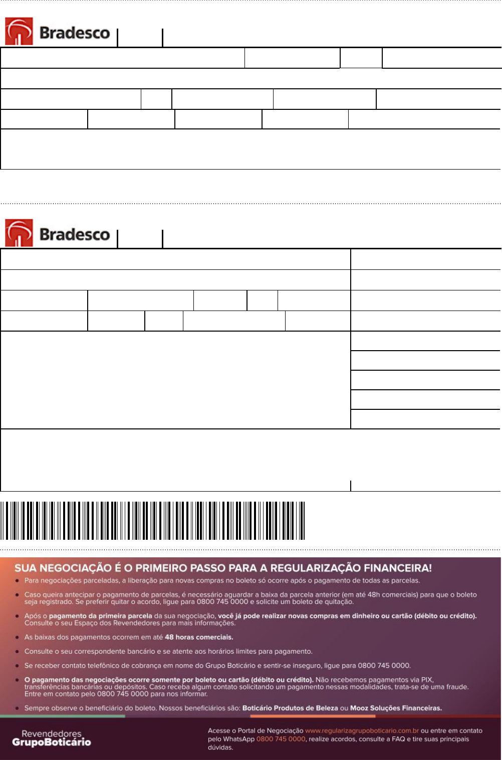 <p>BOLETO DE NEGOCIAÇÃO</p><p>Recibo do Pagador</p><p>237-2 23793.09905 40000.191631 65000.396500 5 98270000021342</p><p>Beneficiário Agência / Cód. Cedente Quantidade Nosso Número</p><p>BOTICÁRIO PRODUTOS DE BELEZA LTDA 3099-6 / 0003965-9 04/00001916365-7</p><p>Endereço Beneficiário</p><p>Avenida doutor Dario Lopes dos Santos, 2197 - Rebouças Curitiba / PR - CEP: 80210-010</p><p>Número do Documento Espécie CPF/CNPJ Vencimento Valor Documento</p><p>13533268 R$ 11.137.051/0001-86 02/09/2024 213,42</p><p>(-) Desconto / Abatimentos (-) Outras Deduções (+) Mora / Multa (+) Outros Acréscimos (=) Valor Cobrado</p><p>Pagador</p><p>ROSEVANIA LUCIA DA COSTA</p><p>AVENIDA PAU BRASIL 90</p><p>OURO BRANCO - MG - CEP: 36496386</p><p>Demonstrativo</p><p>Acordo: 9342830 Parcela: 1 Vencimento: 02/09/24 Valor: 213,42</p><p>Titulo: 273034643 Vencimento: 05/06/24 Valor: 106,71 Titulo: 273034642 Vencimento: 06/05/24 Valor: 106,71</p><p>Corte na linha pontilhada</p><p>237-2 23793.09905 40000.191631 65000.396500 5 98270000021342</p><p>Local de Pagamento Vencimento</p><p>PREFERENCIALMENTE NO BANCO BRADESCO 02/09/2024</p><p>Beneficiário Agência / Cód. Cedente</p><p>BOTICÁRIO PRODUTOS DE BELEZA LTDA - CPF/CNPJ: 11.137.051/0001-86 3099-6 / 0003965-9</p><p>Data Documento N° Documento Espécie doc. Aceite Data Processamento Nosso Número</p><p>21/08/2024 13533268 RC N 21/08/2024 04/00001916365-7</p><p>Uso do Banco Carteira Espécie Quantidade Valor Documento (=) Valor Documento</p><p>04 R$ 213,42</p><p>Instruções (Texto de Responsabilidade do Beneficiário)</p><p>APÓS O VENCIMENTO COBRAR MULTA DE R$ 4,27 (2,00 %) E JUROS DE R$ 0,64 (0,30 %) AO DIA.</p><p>NÃO RECEBER VALOR INFERIOR DO DOCUMENTO</p><p>NÃO RECEBER APÓS 10 DIAS DO VENCIMENTO</p><p>ESTA COBRANÇA NÃO SERÁ QUITADA MEDIANTE DEPOSITO BANCÁRIO E PIX</p><p>APÓS O PAGAMENTO, O BOLETO SERÁ BAIXADO EM ATE 48H ÚTEIS</p><p>(-) Descontos / Abatimentos</p><p>(-) Outras Deduções</p><p>(+) Mora / Multa</p><p>(+) Outros Acrécimos</p><p>(=) Valor Cobrado</p><p>Pagador CPF/CNPJ</p><p>ROSEVANIA LUCIA DA COSTA 088.832.006-08</p><p>AVENIDA PAU BRASIL 90</p><p>OURO BRANCO - MG - CEP: 36496386</p><p>Sacador / Avalista</p><p>BOTICÁRIO PRODUTOS DE BELEZA LTDA - CPF/CNPJ: 11.137.051/0001-86 Cód. Baixa</p><p>Autenticação Mecânica - Ficha de Compensação</p><p>Corte na linha pontilhada</p>