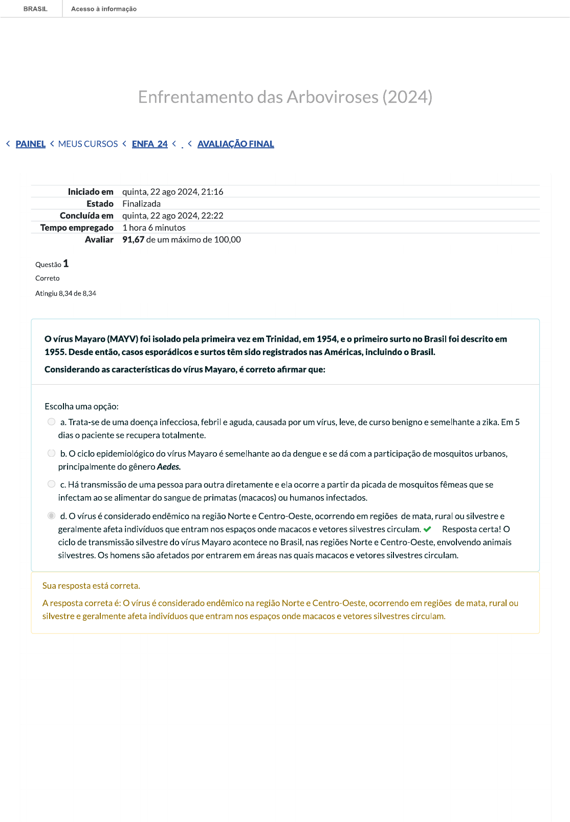 <p>BRASIL Acesso à informação Enfrentamento das Arboviroses (2024) < PAINEL < MEUS CURSOS < ENFA 24 < < AVALIAÇÃO FINAL Iniciado em quinta, 22 ago 2024, 21:16 Estado Finalizada Concluída em quinta, 22 ago 2024, 22:22 Tempo empregado 1 hora 6 minutos Avaliar 91,67 de um máximo de 100,00 Questão 1 Correto Atingiu 8,34 de 8,34 o vírus Mayaro (MAYV) foi isolado pela primeira vez em Trinidad, em 1954, e o primeiro surto no Brasil foi descrito em 1955. Desde então, casos esporádicos e surtos têm sido registrados nas Américas, incluindo o Brasil. Considerando as características do vírus Mayaro, é correto afirmar que: Escolha uma opção: a. Trata-se de uma doença infecciosa, febril e aguda, causada por um vírus, leve, de curso benigno e semelhante a zika. Em 5 dias o paciente se recupera totalmente. b. ciclo epidemiológico do vírus Mayaro é semelhante ao da dengue e se dá com a participação de mosquitos urbanos, principalmente do gênero Aedes. Há transmissão de uma pessoa para outra diretamente e ela ocorre a partir da picada de mosquitos fêmeas que se infectam ao se alimentar do sangue de primatas (macacos) ou humanos infectados. d. vírus é considerado endêmico na região Norte e Centro-Oeste, ocorrendo em regiões de mata, rural ou silvestre e geralmente afeta indivíduos que entram nos espaços onde macacos e vetores silvestres circulam. Resposta certa! ciclo de transmissão silvestre do vírus Mayaro acontece no Brasil, nas regiões Norte e Centro-Oeste, envolvendo animais silvestres. Os homens são afetados por entrarem em áreas nas quais macacos e vetores silvestres circulam. Sua resposta está correta. A resposta correta é: vírus é considerado endêmico na região Norte e Centro-Oeste, ocorrendo em regiões de mata, rural ou silvestre e geralmente afeta indivíduos que entram nos espaços onde macacos e vetores silvestres circulam.</p><p>BRASIL Acesso à informação Correto Atingiu 8,34 de 8,34 Com base em estudos recentes, a encefalite do Oeste do Nilo tem sido relatada em ambientes em que não havia registros de casos. Em relação às características da encefalite do Oeste do Nilo, é correto afirmar que: Escolha uma opção: a. vírus é transportado por aves e transmitido entre pássaros por mosquitos e, da mesma forma, para humanos e cavalos. A afirmação apresenta o ciclo de transmissão do vírus. b. Trata-se de um vírus comum na América do Norte, sendo transmitido por cervos infectados e por morcegos de regiões tropicais. C. A Encefalite do Nilo Ocidental se caracteriza por gerar principalmente tosse, desconforto respiratório e falta de ar. d. diagnóstico da Encefalite do Nilo Ocidental é feito apenas pela avaliação dos sintomas gerados pela infecção. Sua resposta está correta. A resposta correta é: vírus é transportado por aves e transmitido entre pássaros por mosquitos e, da mesma forma, para humanos e cavalos. Questão 3 Correto Atingiu 8,34 de 8,34 No cenário de circulação simultânea de várias arboviroses, o processo de vigilância e controle se torna cada vez mais importante. Considerando essas medidas de vigilância, é correto afirmar que: Escolha uma opção: a. Os óbitos suspeitos por arboviroses só podem ser confirmados com critério laboratorial e realização de uma autópsia completa, que precisa ser autorizada pela família. b. diagrama de controle é uma importante ferramenta da vigilância no monitoramento da situação epidemiológica e quando os casos ultrapassam a média móvel caracteriza a ocorrência de uma epidemia. C. Em relação aos óbitos por arboviroses, eles devem ser notificados a partir da suspeita e investigados o mais rápido possível, pois podem direcionar adequação da assistência para evitar novos óbitos. Correto! A notificação não apenas dos casos suspeitos, mas dos óbitos, se faz necessária para identificação precoce de circulação viral e gerar medidas de vigilância e controle, evitando novos óbitos. d. coeficiente de letalidade é uma medida que expressa o risco de adoecer da população, em um determinado período. Sua resposta está correta. A resposta correta é: Em relação aos óbitos por arboviroses, eles devem ser notificados a partir da suspeita e investigados o mais rápido possível, pois podem direcionar adequação da assistência para evitar novos óbitos.</p><p>BRASIL Acesso à informação Correto Atingiu 8,33 de 8,33 A maioria das ações de vigilância ocorrem no município, ele é o responsável por alimentar o Sistema de Informação de Agravos de Notificação - Sinan, a partir da notificação e investigação dos casos, bem como é de sua responsabilidade a maioria das ações de controle ou prevenção das arboviroses. Considerando a vigilância da dengue pela esfera municipal, analise as afirmações. 1. As ações de vigilância são diferenciadas conforme cenário epidemiológico local, ou seja, algumas ações de vigilância são diferenciadas em cenários de transmissão endêmica e epidêmica. 2. É necessário aguardar a confirmação laboratorial de pelo menos 60% dos casos notificados para reconhecer a epidemia, direcionar medidas de controle e orientar a condução clínica dos casos. 3. Nos períodos epidêmicos recomenda-se a implantação da sala de situação para permitir maior diálogos entre todos os envolvidos na resposta à epidemia, priorizar a realização dos exames específicos para determinados grupos, como crianças, gestantes, idosos, casos graves, atípicos e óbitos, evitando a sobrecarga dos laboratórios. 4. Nos períodos não epidêmicos a vigilância deve investigar e encerrar rapidamente os casos, identificar o agente etiológico, e acompanhar oportunamente a curva de casos, e qualquer mudança no padrão de ocorrência, para reduzir assim a ocorrência de epidemias, ou preparar a assistência para evitar óbitos. Sobre essas afirmações, está correto afirmar que: Escolha uma opção: a. As afirmações 1 e 