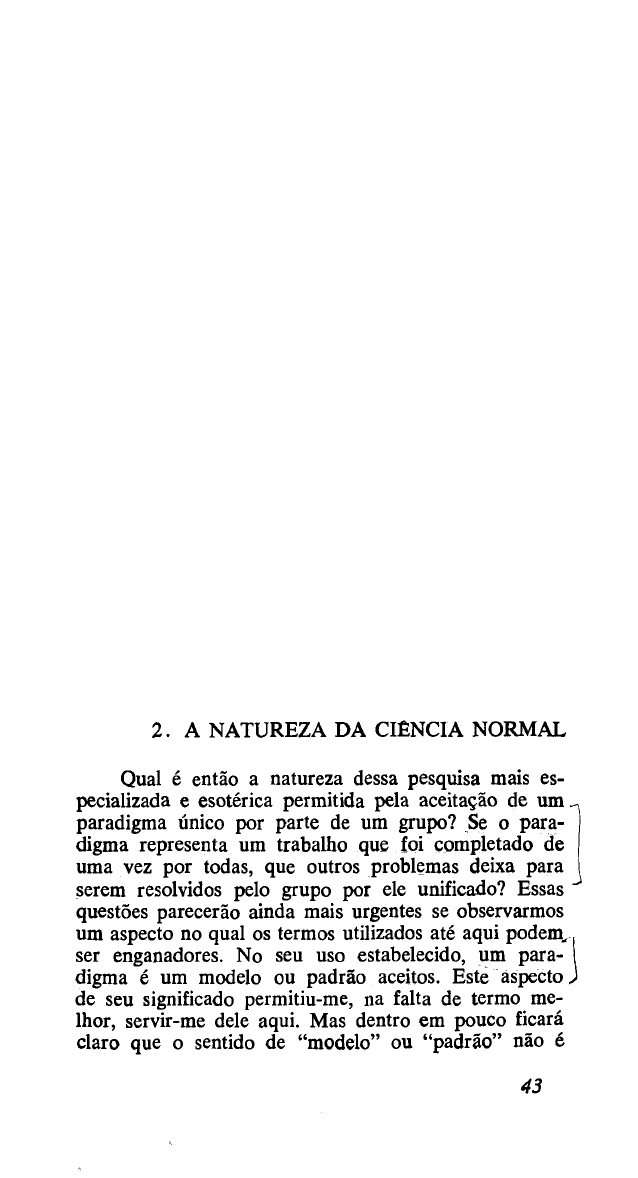 <p>2. A NATUREZA DA CIÊNCIA NORMAL</p><p>Qual é então a natureza dessa pesquisa mais es</p><p>pecializada e esotérica permitida pela aceitação de um -</p><p>paradigma único por parte de um grupo? Se o para</p><p>digma representa um trabalho que foi completado de</p><p>uma vez por todas, que outros problemas deixa para</p><p>serem resolvidos pelo grupo por ele unificado? Essas</p><p>questões parecerão ainda mais urgentes se observarmos</p><p>um aspecto no qual os termos utilizados até aqui podem,,</p><p>ser enganadores. No seu uso estabelecido, um para- I</p><p>digma é um modelo ou padrão aceitos. Este aspecto)</p><p>de seu significado permitiu-me, na falta de termo me</p><p>lhor, servir-me dele aqui. Mas dentro em pouco ficará</p><p>claro que o sentido de “modelo” ou “padrão” não é</p><p>43</p><p>o mesmo que o habitualmente empregado na definição</p><p>de “paradigma”. Por exemplo, na Gramática, “amo,</p><p>amas, amat” é um paradigma porque apresenta um</p><p>padrão a ser usado na conjugação de um grande nú</p><p>mero de outros verbos latinos — para produzir, entre</p><p>outros, “laudo, laudas, laudat”. Nesta aplicação costu</p><p>meira, o paradigma funciona ao permitir a reprodução</p><p>de exemplos, cada um dos quais poderia, em princípio,</p><p>substituir aquele. Por outro lado, na ciência, um para</p><p>digma raramente é suscetível de reprodução. Tal como</p><p>uma decisão judicial aceita no direito costumeiro, o</p><p>paradigma é um objeto a ser melhor articulado e pre</p><p>cisado em condições novas ou mais rigorosas.</p><p>Para que se compreenda como isso é possível, deve</p><p>mos reconhecer que um paradigma pode ser muito limi</p><p>tado, tanto no âmbito como na precisão, quando de.</p><p>sua primeira aparição. Os paradigmas adquirem seu</p><p>staíus porque são mais bem sucedidos que seus com</p><p>petidores na resolução de alguns problemas que o gru</p><p>po de cientistas reconhece como graves. Contudo, ser</p><p>bem sucedido não significa nem ser totalmente bem su-r</p><p>cedido com um único problema, nem notavelmente</p><p>bem sucedido com um grande número. De início, o su</p><p>cesso de um paradigma — seja a análise aristotélica</p><p>do movimento, os cálculos ptolomaicos das posições</p><p>planetárias, o emprego da balança por Lavoisier ou a</p><p>matematização do campo eletromagnético por Maxwell</p><p>— é, em grande parte, uma promessa de sucesso que</p><p>pode ser descoberta em exemplos selecionados e ainda</p><p>incompletos. A ciência normal consiste na atualização</p><p>dessa promessa, atualização que se obtém ampliando-se</p><p>o conhecimento daqueles fatos que o paradigma apre</p><p>senta como particularmente relevantes, aumentando-se</p><p>a correlação entre esses fatos e as predições do para</p><p>digma e articúlando-se ainda mais o próprio paradigma.</p><p>Poucos dos que não trabalham realmente com uma</p><p>ciência amadurecida dão-se conta de quanto trabalho</p><p>de limpeza desse tipo resta por fazer depois do esta</p><p>belecimento do paradigma ou de quão fascinante é a</p><p>execução desse trabalho. Esses pontos precisam ser</p><p>bem compreendidos. A maioria dos cientistas, durante</p><p>toda a sua carreira, ocupa-se com operações de lim</p><p>peza. Elas constituem o que chamo de ciência normal.</p><p>Examinado de perto, seja historicamente, seja no labo</p><p>44</p><p>ratório contemporâneo, esse empreendimento parece</p><p>ser uma tentativa de forçar a natureza a encaixar-se</p><p>dentro dos limites preestabelecidos e relativamente in</p><p>flexíveis fornecidos pelo paradigma. A ciência normal</p><p>não tem como objetivo trazer à tona novas espécies de</p><p>fenômeno; na verdade, aqueles que não se ajustam aos</p><p>limites do paradigma freqüentemente nem são vistos.</p><p>Os cientistas também não estão constantemente pro- '</p><p>curando inventar novas teorias; freqüentemente mos</p><p>tram-se intolerantes com aquelas inventadas por ou</p><p>tros.1 Em vez disso, a pesquisa científica normal está</p><p>dirigida para a articulação daqueles fenômenos e teo</p><p>rias já fornecidos pelo paradigma.</p><p>Talvez essas características sejam defeitos. As</p><p>áreas investigadas pela ciência normal são certamente</p><p>minúsculas; ela restringe drasticamente a visão do cien</p><p>tista. Mas essas restrições, nascidas da confiança no</p><p>paradigma, revelaram-se essenciais para o desenvolvi</p><p>mento da ciência. Ao concentrar a atenção numa faixa</p><p>de problemas relativamente esotéricos, o paradigma</p><p>força os cientistas a investigar alguma parcela da na</p><p>tureza com uma profundidade e de uma maneira tão</p><p>detalhada que de outro modo seriam inimagináveis. E a</p><p>ciência normal possui um mecanismo interno que asse</p><p>gura o relaxamento das restrições que limitam a pes</p><p>quisa, toda vez que o paradigma do qual derivam deixa</p><p>de funcionar efetivamente. Nessa altura os cientistas co</p><p>meçam a comportar-se de maneira diferente e a natu</p><p>reza dos problemas de pesquisa muda. No intervalo, en</p><p>tretanto, durante o qual o paradigma foi bem sucedido,</p><p>os membros da profissão terão resolvido problemas que</p><p>mal poderiam ter imaginado e cuja solução nunca teriam</p><p>empreendido sem o comprometimento com o paradigma.</p><p>E pelo menos parte dessas realizações sempre demons</p><p>tra ser permanente. v</p><p>Para mostrar mais claramente o que entendemos ’</p><p>por pesquisa normal ou baseada em paradigma, tentarei</p><p>agora classificar e ilustrar os problemas que constituem</p><p>essencialmente a ciência normal. Por conveniência, adio ̂</p><p>o estudo da atividade teórica e começo com a coleta de</p><p>fatòs, isto é, com as experiências e observações descri-</p><p>1. Barber, Bemard. Resistance by Scientists to Scientific Discovery.</p><p>Science, CXXXIV, 