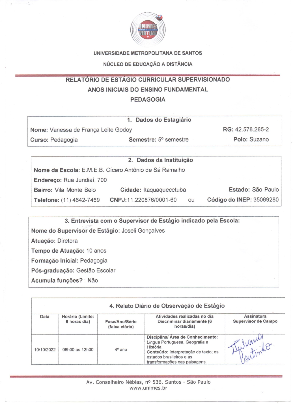 <p>UNIMES VIRTUA UNIVERSIDADE METROPOLITANA DE SANTOS NÚCLEO DE EDUCAÇÃO A DISTÂNCIA RELATÓRIO DE ESTÁGIO CURRICULAR SUPERVISIONADO ANOS INICIAIS DO ENSINO FUNDAMENTAL PEDAGOGIA 1. Dados do Estagiário Nome: Vanessa de França Leite Godoy RG: 42.578.285-2 Curso: Pedagogia Semestre: 5° semestre Polo: Suzano 2. Dados da Instituição Nome da Escola: E.M.E.B. Cícero Antônio de Sá Ramalho Endereço: Rua 700 Bairro: Vila Monte Belo Cidade: Itaquaquecetuba Estado: São Paulo Telefone: (11) 4642-7469 CNPJ:11.220876/0001-60 ou Código do INEP: 35069280 3. Entrevista com o Supervisor de Estágio indicado pela Escola: Nome do Supervisor de Estágio: Joseli Gonçalves Atuação: Diretora Tempo de Atuação: 10 anos Formação Inicial: Pedagogia Pós-graduação: Gestão Escolar Acumula funções? : Não 4. Relato Diário de Observação de Estágio Data Horário (Limite: Atividades realizadas no dia Assinatura 6 horas dia) Fase/Ano/Série Discriminar diariamente (6 Supervisor de Campo (faixa etária) horas/dia) Disciplina/ Area de Conhecimento: Língua Portuguesa, Geografia e 10/10/2022 08h00 às 12h00 ano Conteúdo: Interpretação de texto; os estados brasileiros e as transformações nas paisagens. Av. Conselheiro Nébias, 536. Santos São Paulo www.unimes.br</p><p>UNIMES VIRTUA UNIVERSIDADE METROPOLITANA DE SANTOS NÚCLEO DE EDUCAÇÃO A DISTÂNCIA Atividades desenvolvidas: Na aula de Língua Portuguesa os alunos interpretaram texto: "Passarinho no ninho"; nas aulas de Geografia e História os alunos observaram o mapa do Brasil, as regiões, o maior e menor estado brasileiro e onde está localizada a capital do Brasil. Disciplina/ Área de Conhecimento: Língua Portuguesa e Matemática Conteúdo: Sons do X, gramática, leitura e interpretação de texto; prisma 11/10/2022 08h00 às 12h00 3° ano e Pirâmide. Atividades desenvolvidas: Leitura e interpretação do texto história do X, exercícios de fixação. Confecção de sólidos geométricos. Ação "Nossa Roda de Conversa". com mães e familiares de crianças público- alvo da Educação Especial. A articulação entre a família e a escola foi feita pela professora do Atendimento Educacional Especializado, Naliane Lage. No encontro foi possível compartilhar ideias, acolher e trocar experiências por intermédio da palestrante e mãe de 13/10/2022 08h00 às 12h00 ano autista, Carola Giovana Salcedo Caballero e pela professora Especialista em Autismo, Carolina Também tivemos um momento de sensibilização, conduzido pela fisioterapeuta, Ana Paula, que pode envolver os familiares por meio da música "Laços" de Nando Reis, em um momento de relaxamento. Reunião de Acolhimento no pátio da escola para os responsáveis. Reunião com professores em sala de aula. Acompanhei 4° ano. A professora passou alguns informes 14/10/2022 08h00 às 12h00 4° ano referente ao projeto pedagógico, sobre o desenvolvimento dos alunos nas suas atividades e projetos propostos. Também foi falado sobre regras a serem cumpridas dentro do ambiente escolar. Disciplina/ Área de Conhecimento: Ciências e Matemática. Conteúdo: solo; divisão com dois numerais. 17/10/2022 08h00 às 12h00 3° ano Atividades desenvolvidas: Na aula de Ciências os alunos copiaram no caderno os tipos de solo e houve explicação oral; na aula de Av. Conselheiro Nébias, n° 536. Santos São Paulo www.unimes.br</p><p>UNIMES VIRTUA UNIVERSIDADE METROPOLITANA DE SANTOS NÚCLEO DE EDUCAÇÃO A DISTÂNCIA Matemática foram realizados exercícios de divisão para fixação. Disciplina/ Área de Conhecimento: Língua Portuguesa e Geografia. Conteúdo: Identificação das regiões brasileiras, sistemas de transportes e meios de comunicação; interpretação de texto. 18/10/2022 08h00 às 12h00 3° ano Atividades desenvolvidas: Na aula de Portuguesa os alunos leram um texto da apostila e depois responderam um questionário relacionado com texto; na aula de Geografia foi estudado o mapa do Brasil. Disciplina/ Area de Conhecimento: Matemática e Língua Inglesa. Conteúdo: Exercícios de divisão e multiplicação; where is the cat? 19/10/2022 08h00 às 12h00 ano Atividade desenvolvida: Foram aplicados exercícios de divisão, multiplicação; na aula de Língua Inglesa, foi feita a revisão do verbo "to Disciplina/ Area de Conhecimento: Língua Portuguesa e Matemática. Conteúdo: Exercícios de fixação para prova que será aplicada pela Secretaria Municipal de Educação. 20/10/2022 08h00 às 12h00 ano Atividades desenvolvidas: Na aula de Língua Portuguesa houve explicação sobre artigo pronome e adjetivo; na aula de Matemática as crianças realizaram exercícios de divisão, multiplicação, fração e soma. Disciplina/ Area de Conhecimento: Matemática e Artes. Conteúdo: Quadro de centenas; formas geométricas. 21/10/2022 08h00 às 12h00 ano Atividades desenvolvidas: Quadro de centenas para achar o dobro, triplo, quíntuplo e sêxtuplo; na aula de artes as crianças fizeram formas em diferentes papéis e tamanhos. Disciplina/ Área de Conhecimento: Matemática e Artes. Conteúdo: Horas e minutos, relembrando cores primárias e secundárias. 24/10/2022 08h00 às 12h00 3° ano Atividade desenvolvida: A professora relembrou com os alunos sobre o tema horas e minutos; na aula de artes pediu que os alunos formassem grupos e distribuiu para cada aluno, folha, giz de cera das Av. Conselheiro Nébias, 536. Santos São Paulo www.unimes.br</p><p>UNIVERSIDADE METROPOLITANA DE SANTOS NÚCLEO DE EDUCAÇÃO A DISTÂNCIA cores primárias e que fizessem uma pintura da preferência livre para ser colado num cartaz da sala. Disciplina/ Área de Conhecimento: Língua Portuguesa e Ciências Conteúdo: Uso do cê-cedilha; nosso corpo. Atividades desenvolvidas: Na aula de Língua Portuguesa foram colocadas na lousa várias palavras com C e as crianças leram para que observassem se som era o mesmo, 25/10/2022 08h00 às 12h00 2° ano foi explicado que em nossa língua, não usamos em frente às vo