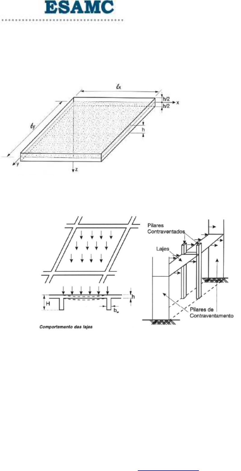 <p>1</p><p>Construções de Concreto II</p><p>Júlia Borges dos Santos | julia.borges@esamc.br |</p><p>1. Lajes maciças</p><p>1.1 Definição</p><p>Elementos planos com duas dimensões muito maiores que a terceira. As lajes recebem as</p><p>cargas verticais que ocorrem nas edificações, transferindo-as para as vigas.</p><p>Além de distribuir carregamentos verticais, as lajes possuem um papel importante no esquema</p><p>resistente para as ações horizontais, comportando-se como diafragmas rígidos ou chapas,</p><p>compatibilizando o deslocamento os pilares em cada piso (contraventando-os).</p><p>As lajes podem ser armadas em duas direções ou em uma direção. Isto dependerá da relação</p><p>entre os vãos da laje, dada pela letra grega “λ”.</p><p>2</p><p>Construções de Concreto II</p><p>Júlia Borges dos Santos | julia.borges@esamc.br |</p><p>Sendo:</p><p>OBS: o vão teórico das lajes é definido como a distância entre eixos dos apoios</p><p>Na figura a seguir pode-se observar o comportamento de uma laje armada em uma direção (a)</p><p>e armada em duas direções (b)</p><p>Nas lajes armadas em uma direção, os esforços solicitantes de maior magnitude ocorrem</p><p>segundo a direção do menor vão, chamada direção principal. Na outra direção, chamada</p><p>secundária, os esforços solicitantes são bem menores e, por isso, são comumente desprezados</p><p>nos cálculos. Os esforços solicitantes e as flechas são calculados supondo-se a laje como uma</p><p>viga com largura de 1 m, segundo a direção principal da laje.</p><p>3</p><p>Construções de Concreto II</p><p>Júlia Borges dos Santos | julia.borges@esamc.br |</p><p>Nas lajes armadas em duas direções, os esforços solicitantes são importantes segundo as</p><p>duas direções da laje, chamadas de direção principal e direção secundária, as quais irão</p><p>depender da ordem de grandeza dos esforços.</p><p>1.2 Vinculação</p><p>As lajes podem ter três tipos de vínculos em suas bordas, conforme tabela a seguir:</p><p>Como adotar o tipo de vinculação?</p><p>As vinculações são adotadas para proporcionar uma solução mais econômica, e também, um</p><p>comportamento estrutural adequado.</p><p>Quando há continuidade no painel de lajes e as lajes possuem vãos próximos, adota-se as lajes</p><p>engastadas entre si.</p><p>Lajes que possuem vãos menores são engastadas nas lajes com vãos maiores, visando uma</p><p>melhor distribuição de esforços. Desse modo a laje menor engasta na maior, e esta fica</p><p>simplesmente apoiada.</p><p>Esta avaliação pode ser feita comparando a ordem de grandeza dos momentos negativos das</p><p>lajes, ou então, comparando a ordem de grandeza dos vãos.</p><p>Quando ocorrer diferença de altura significativa (caso a) entre as lajes, ou rebaixo (caso b),</p><p>não é possível engastar as lajes entre si, mesmo que os valores dos vãos sejam próximos.</p><p>4</p><p>Construções de Concreto II</p><p>Júlia Borges dos Santos | julia.borges@esamc.br |</p><p>Caso (a)</p><p>Caso (b)</p><p>Pode ocorrer que uma borda da laje seja parte engastada e parte apoiada. Neste caso deverá</p><p>ser analisado se a parte engastada é significativa, utilizando as relações a seguir:</p><p>1.3 Espessuras mínimas</p><p>De acordo com a ABNT NBR 6118:2014, os limites mínimos para espessura nas lajes</p><p>maciças são:</p><p>5</p><p>Construções de Concreto II</p><p>Júlia Borges dos Santos | julia.borges@esamc.br |</p><p>1.4 Cobrimentos mínimos</p><p>6</p><p>Construções de Concreto II</p><p>Júlia Borges dos Santos | julia.borges@esamc.br |</p><p>1.5 Esforços</p><p>As lajes são solicitadas essencialmente por momentos fletores e forças cortantes. A</p><p>determinação dos esforços pode ser feitas por vários processos, conforme descritos a seguir.</p><p>1.5.1 Processo das grelhas</p><p>O cálculo pelo processo das grelhas fornece resultados bons para os momentos negativos e</p><p>para as reações de apoio. Os momentos positivos e as flechas são exagerados.</p><p>1.5.2 Teoria da Elasticidade</p><p>O método elástico se baseia na teoria clássica de placas delgadas, supondo material</p><p>homogêneo, isótropo, elástico e linear.</p><p>A equação fundamental que rege o problema das placas é a equação de Lagrange.</p><p>7</p><p>Construções de Concreto II</p><p>Júlia Borges dos Santos | julia.borges@esamc.br |</p><p>1.5.3 Processo de Marcus</p><p>Marcus, comparando os momentos positivos com os resultados obtidos pela teoria da</p><p>elasticidade, obteve coeficientes de correção corretos. (Utilizar tabelas).</p><p>1.5.4 Linhas de ruptura</p><p>O procedimento de cálculo proposto pela ABNT NBR 6118:2014 baseia-se na teoria das</p><p>charneiras plásticas, a partir da aproximação das linhas de ruptura de plastificação, e pode ser</p><p>utilizado para calcular-se as reações de apoio.</p><p>Ocorrem linhas de ruptura: ao longo de todos os bordos engastados, em todas as quinas</p><p>formadas pelos apoios das lajes.</p><p>Considera-se, para cada apoio, uma carga correspondente às áreas de triângulos ou trapézios</p><p>obtidos traçando-se, a partir dos vértices, retas inclinadas de:</p><p>1.6 Compatibilização de momentos fletores</p><p>Após determinados os esforços nas lajes, deve realizar a redistribuição dos momentos. Isto é</p><p>necessário, pois as lajes foram resolvidas como placas isoladas, mas na realidade encontram-</p><p>se conectadas, e os momentos negativos diferentes nas ligações devem ser equilibrados,</p><p>alterando-se os momentos positivos iniciais.</p><p>8</p><p>Construções de Concreto II</p><p>Júlia Borges dos Santos | julia.borges@esamc.br |</p><p>1.7 Dimensionamento das armaduras</p><p>O dimensionamento de armaduras para lajes é feito da mesma forma que para vigas,</p><p>admitindo-se a largura b=1m. Obtém-se, assim, uma armadura por metro linear.</p><p>No domínio 3, a ruína se dá por ruptura o concreto com deformaç