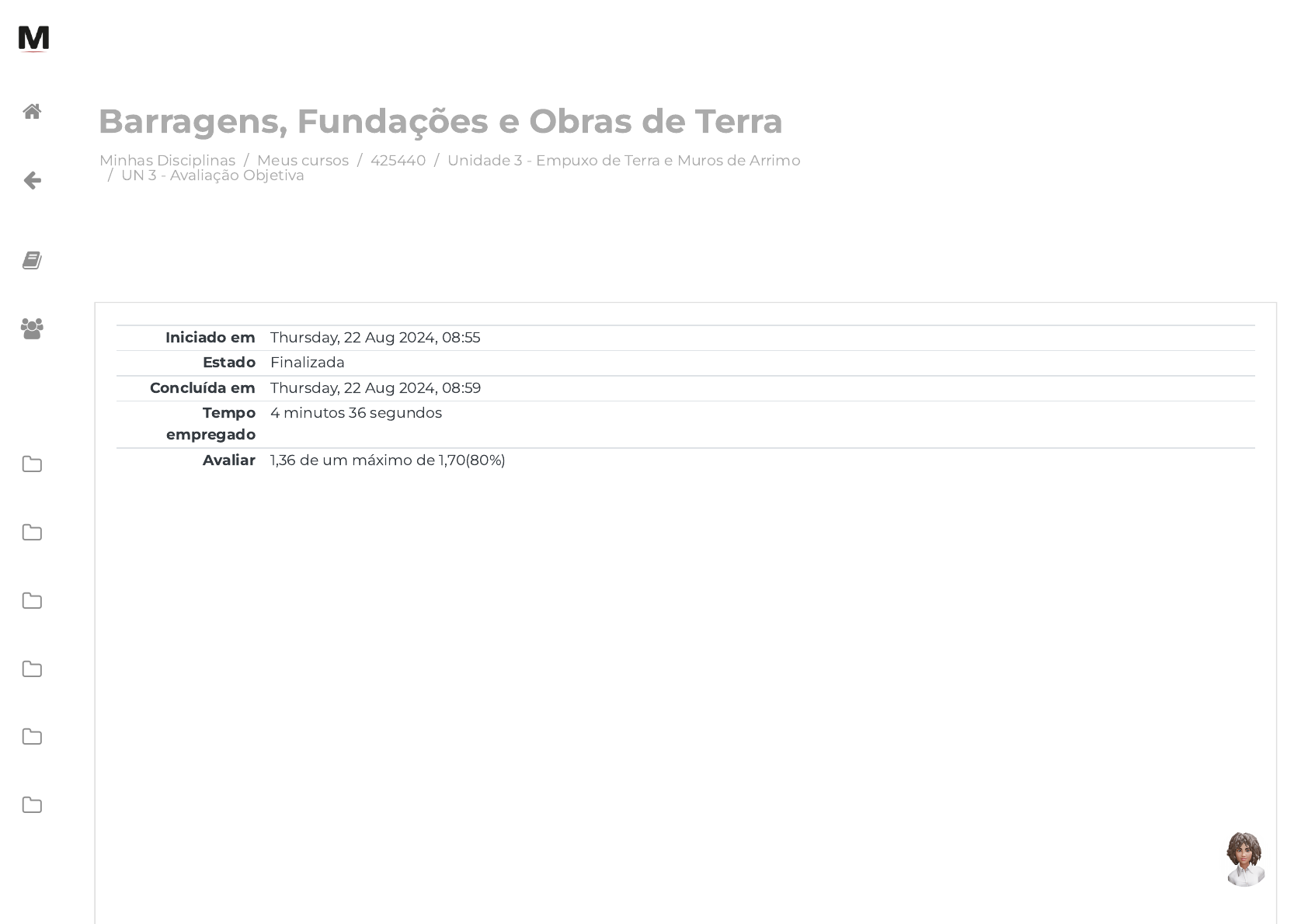 <p>Minhas Disciplinas / Meus cursos / 425440 / Unidade 3 - Empuxo de Terra e Muros de Arrimo</p><p>/ UN 3 - Avaliação Objetiva</p><p>Barragens, Fundações e Obras de Terra</p><p>Iniciado em Thursday, 22 Aug 2024, 08:55</p><p>Estado Finalizada</p><p>Concluída em Thursday, 22 Aug 2024, 08:59</p><p>Tempo</p><p>empregado</p><p>4 minutos 36 segundos</p><p>Avaliar 1,36 de um máximo de 1,70(80%)</p><p></p><p></p><p></p><p></p><p></p><p></p><p></p><p></p><p></p><p></p><p></p><p>https://avap.multivix.edu.br/my/</p><p>https://avap.multivix.edu.br/course/view.php?id=29796</p><p>https://avap.multivix.edu.br/course/view.php?id=29796§ion=4</p><p>https://avap.multivix.edu.br/mod/quiz/view.php?id=1723472</p><p>https://avap.multivix.edu.br/my/</p><p>https://avap.multivix.edu.br/course/view.php?id=29796</p><p>https://avap.multivix.edu.br/user/index.php?id=29796</p><p>https://avap.multivix.edu.br/course/view.php?id=29796§ion=1</p><p>https://avap.multivix.edu.br/course/view.php?id=29796§ion=2</p><p>https://avap.multivix.edu.br/course/view.php?id=29796§ion=3</p><p>https://avap.multivix.edu.br/course/view.php?id=29796§ion=4</p><p>https://avap.multivix.edu.br/course/view.php?id=29796§ion=5</p><p>https://avap.multivix.edu.br/course/view.php?id=29796§ion=6</p><p>https://avap.multivix.edu.br/course/view.php?id=29796§ion=7</p><p>https://avap.multivix.edu.br/course/view.php?id=29796§ion=8</p><p>https://avap.multivix.edu.br/</p><p>https://avap.multivix.edu.br/</p><p>https://avap.multivix.edu.br/</p><p>https://avap.multivix.edu.br/</p><p>https://avap.multivix.edu.br/</p><p>Questão 1</p><p>Incorreto</p><p>Atingiu 0,00</p><p>de 0,34</p><p>Questão 2</p><p>Correto</p><p>Atingiu 0,34</p><p>de 0,34</p><p>As condições de estabilidade de muros de arrimo deverão ser veri�cadas a �m de manter a segurança da construção. Os</p><p>deslizamentos super�ciais de terra deverão ser impedidos, a �m de garantir a segurança da edi�cação que estiver próxima ao</p><p>talude, assim como das pessoas que estiverem também utilizando tal edi�cação. Algumas condições devem ser veri�cadas. Qual</p><p>seria uma delas?</p><p>Escolha uma opção:</p><p>a. Segurança contra a drenagem. </p><p>b. Segurança contra o alargamento.</p><p>c. Segurança contra o embasamento.</p><p>d. Segurança contra o aterramento.</p><p>e. Segurança contra o tombamento.</p><p>Os muros de arrimo são muito usados para combater o deslizamento de taludes, trazendo maior segurança ao redor dos taludes.</p><p>Podem ser adotados para tipos diversos de construções, como é o caso das relacionadas a pavimentações, por exemplo, em que</p><p>deverão ser construídos muros de talude para impedir o deslizamento de terra para as estradas. Com base nisso, quais as</p><p>características de um muro de fogueira?</p><p>Escolha uma opção:</p><p>a. A disposição como são postos sobre os taludes, não usando o concreto.</p><p>b. O preenchimento dos espaços, feito com arames farpados.</p><p>c. O tipo de material é diferenciado, pois pode ser feito utilizando madeiras. </p><p>d. O jeito como são executados, utilizando apenas grama.</p><p>e. A forma como são executados, com placas de concreto.</p><p>https://avap.multivix.edu.br/</p><p>https://avap.multivix.edu.br/</p><p>https://avap.multivix.edu.br/</p><p>https://avap.multivix.edu.br/</p><p>https://avap.multivix.edu.br/</p><p>Questão 3</p><p>Correto</p><p>Atingiu 0,34</p><p>de 0,34</p><p>Questão 4</p><p>Correto</p><p>Atingiu 0,34</p><p>de 0,34</p><p>O solo poderá ter ações atuantes quando é instalado o muro de arrimo em contato com ele. Todas as forças atuantes no solo</p><p>deverão ser levadas em consideração para base de cálculo, a �m de saber como se comportará esse solo mediante a ação dessas</p><p>forças. Portanto, é necessário saber quais são as principais forças atuantes no solo. Com base nisso, qual empuxo provoca a expansão</p><p>do solo?</p><p>Escolha uma opção:</p><p>a. Empuxo ativo. </p><p>b. Empuxo em repouso.</p><p>c. Empuxo passivo.</p><p>d. Empuxo �nal.</p><p>e. Empuxo inicial.</p><p>Os muros de arrimo são estruturas construídas com o objetivo de conter determinada quantidade de solo, podendo ser postos por</p><p>meio de taludes, que são quantidades de terras inclinadas e dispostas em um local, criando montes que poderão ter problemas de</p><p>deslizamento devido ao escoamento de água que poderá percolar sobre esses taludes. Com base nisso, quais as características de</p><p>um muro de arrimo �exível?</p><p>Escolha uma opção:</p><p>a. Poder realizar a contenção com o auxílio de tirantes e contraforte. </p><p>b. Poder realizar a contenção somente em alturas inferiores a quatro metros.</p><p>c. Poder realizar a contenção com seu próprio peso.</p><p>d. Poder realizar a contenção somente por sua geometria.</p><p>e. Poder realizar a contenção usando peças de madeira.</p><p>https://avap.multivix.edu.br/</p><p>https://avap.multivix.edu.br/</p><p>https://avap.multivix.edu.br/</p><p>https://avap.multivix.edu.br/</p><p>https://avap.multivix.edu.br/</p><p>Questão 5</p><p>Correto</p><p>Atingiu 0,34</p><p>de 0,34</p><p>Além da instabilidade dos muros de arrimo e dos taludes que serão contidos por ele, a drenagem deverá ser veri�cada. O</p><p>escoamento de água, quando em grande quantidade, pode causar problemas, como deslizamento de terras, que podem ocasionar</p><p>graves tragédias, além de impactar diretamente na construção civil. Com base nisso, como é feita a drenagem na contenção?</p><p>Escolha uma opção:</p><p>a. Podem ser usados solos como um sistema e�ciente de drenagem.</p><p>b. Podem ser usadas barreiras de madeira como um sistema e�ciente de drenagem.</p><p>c. Podem ser usadas placas metálicas como um sistema e�ciente de drenagem.</p><p>d. Pode ser usado concreto como um sistema e�ciente de drenagem.</p><p>e. Podem ser usados barbacãs como um sistema e�ciente de drenagem. </p><p>◄ Conteúdo 