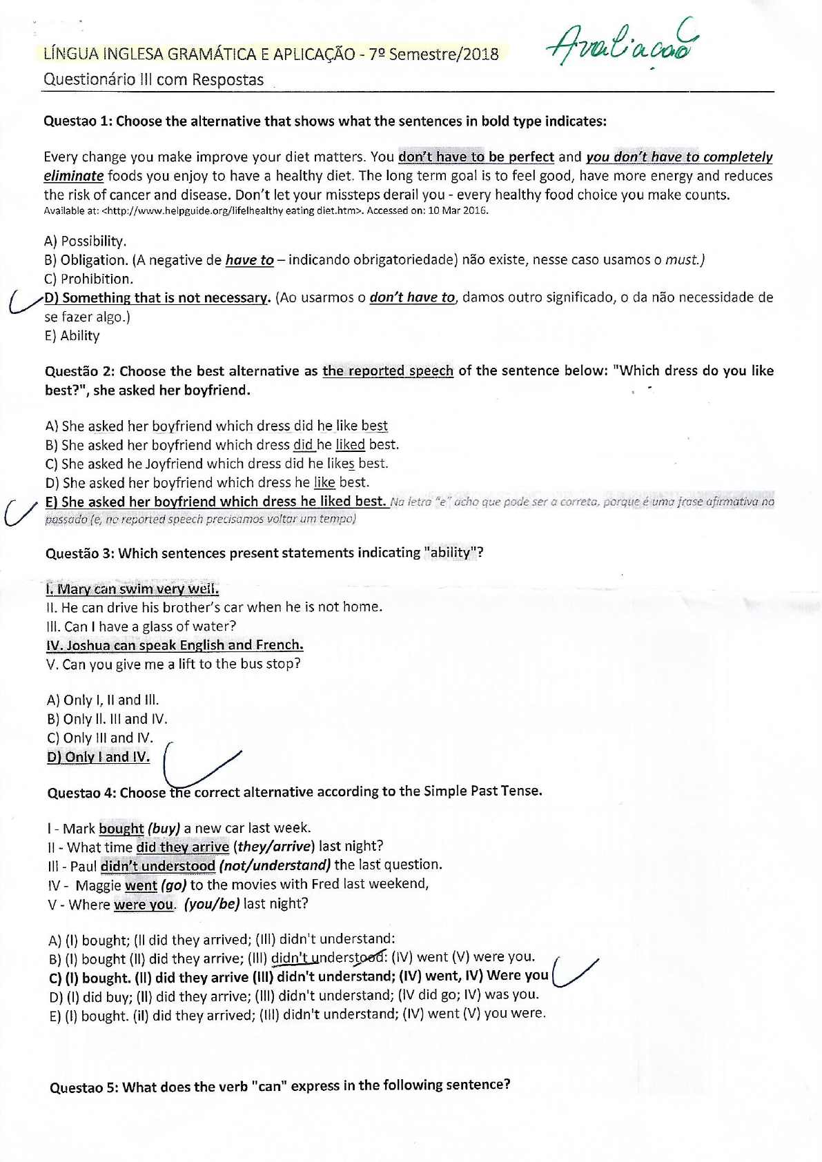 <p>LÍNGUA INGLESA GRAMÁTICA E APLICAÇÃO - Semestre/2018 Questionário III com Respostas Questao 1: Choose the alternative that shows what the sentences in bold type indicates: Every change you make improve your diet matters. You don't have to be perfect and you don't have to completely eliminate foods you enjoy to have a healthy diet. The long term goal is to feel good, have more energy and reduces the risk of cancer and disease. Don't let your missteps derail you - every healthy food choice you make counts. Available at: http://www.helpguide.org/lifelhealthy eating diet.htm>. Accessed on: 10 Mar 2016. A) Possibility. B) Obligation. (A negative de have to - indicando obrigatoriedade) não existe, nesse caso usamos must.) C) Prohibition. D) Something that is not necessary. (Ao usarmos o don't have to, damos outro significado, o da não necessidade de se fazer algo.) E) Ability Questão 2: Choose the best alternative as the reported speech of the sentence below: "Which dress do you like best?", she asked her boyfriend. A) She asked her boyfriend which dress did he like best B) She asked her boyfriend which dress did he liked best. C) She asked he Joyfriend which dress did he likes best. D) She asked her boyfriend which dress he like best. E) She asked her boyfriend which dress he liked best. Na letra "e" acho que pode ser a correta, porque é uma frase afirmativa no passado (e, no reported speech precisamos voltar um tempo) Questão 3: Which sentences present statements indicating "ability"? Mary can swim very well. II. He can drive his brother's car when he is not home. III. Can have a glass of water? IV. Joshua can speak English and French. V. Can you give me a lift to the bus stop? A) Only I, II and III. B) Only II. III and IV. C) Only III and IV. D) Only I and IV. Questao 4: Choose the correct alternative according to the Simple Past Tense. I - Mark bought (buy) a new car last week. - What time did they arrive (they/arrive) last night? III - Paul didn't understood (not/understand) the last question. IV - Maggie went (go) to the movies with Fred last weekend, V - Where were you. (you/be) last night? A) (I) bought; did they arrived; (III) didn't understand: B) (I) bought (II) did they arrive; (III) didn't understood: (IV) went (V) were you. (I) bought. (II) did they arrive (III) didn't understand; (IV) went, IV) Were you D) (I) did buy; (II) did they arrive; (III) didn't understand; (IV did go; IV) was you. E) (I) bought. (il) did they arrived; (III) didn't understand; (IV) went (V) you were. Questao 5: What does the verb "can" express in the following sentence?</p>