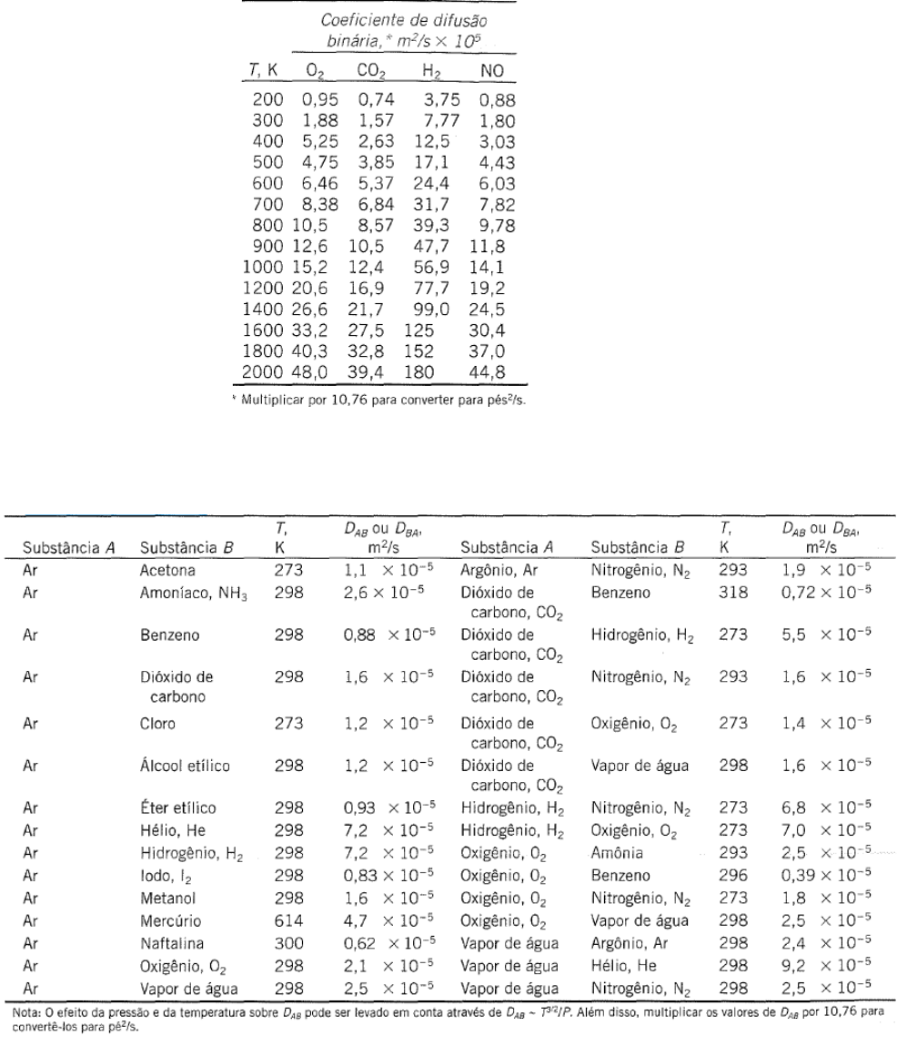 <p>ANEXO 1</p><p>Tabela 1. Os coeficientes de difusão binária de alguns gases no ar a 1 atm de pressão</p><p>Fonte: Çengel, 2011. Pág. 802.</p><p>Tabela 2. Os coeficientes de difusão binária de misturas de gases diluídos a 1 atm.</p><p>Fonte: Çengel, 2011. Pág. 803.</p><p>Tabela 3. Os coeficientes de difusão binária de soluç��es de líquidos diluídos e soluções sólidas</p><p>a 1 atm.</p><p>Fonte: Çengel, 2011. Pág. 804.</p><p>Tabela 4. Em uma mistura binária de gás ideal de espécies A e B, o coeficiente de difusão de A</p><p>em B é igual ao coeficiente de difusão de B em A, e ambos aumentam com a temperatura</p><p>Fonte: Çengel, 2011. Pág. 804.</p>