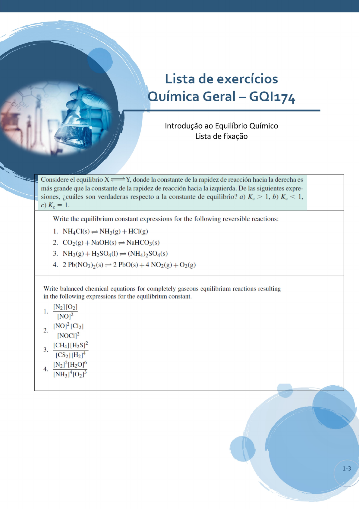 <p>Lista de exercícios - Introdução ao Equilíbrio Químico Lista de fixação Considere el equilibrio X Y, donde la constante de la rapidez de reacción hacia la derecha es más grande que la constante de la rapidez de reacción hacia la izquierda. De las siguientes expre- siones, ¿cuáles son verdaderas respecto a la constante de equilibrio? < 1, c) = 1. Write the equilibrium constant expressions for the following reversible reactions: 1. NH4Cl(s) NH3(g) + 2. + NaOH(s) = NaHCO3(s) 3. NH3(g) + 4. 2 + 4 + Write balanced chemical equations for completely gaseous equilibrium reactions resulting in the following expressions for the equilibrium constant. 1. 2. [CH4][H2S]2 3. [CS2][H2]4 4. 1-3</p><p>A 1 -liter - reaction vessel containing SO2 gas and O2 gas was equilibrated at 300°C. The equilibrium concentrations of SO2, O2, and SO3 in the gaseous mixture were 0.229 M, 0.115 M, and 0.0373 M, respectively. Determine Kc for the reaction 2 SO2 (g) + O2 (g) = 2 SO3 (g). For the following reactions, give a qualitative description of the position of equilibrium. Also, predict the relative concentrations of the products and reactants at 298 K. 1. 2. 2 NOCI(g) NO(g) + Cl2(g) 3. CS2(g) +4 H2(g) = CH4(g) + 2 H2S(g) 4. 4 NH3(g) + 3 = N2(g) + 6 Table 17.1 Relationship between the magnitude of K, equilibrium position, and the concentra- tions of reactants and products Value of Keq Range Keq Equilibrium position Relative concentration of products and reactants Very large Far to the right. Reaction Mainly all products proceeds almost 100% to completion Large To the right Products > reactants Unity Neither to the left nor to right Almost the same Small To the left Reactants > products Very small 10-20 - 10-30 Far to the left Mainly all reactants La constante de equilibrio para la reacción A2 + 2AB es de 3 a cierta temperatura. ¿Cuál de los siguientes diagramas corresponde a la reacción en equilibrio? Para aquellas mezclas que no están en equilibrio ¿el movimiento de la reacción neta será hacia la derecha o a la inversa para alcanzar el equilibrio? a) b) c) 2-3</p><p>La constante de equilibrio para la reacción A B es K = 10 a cierta temperatura. 1) Si se empieza sólo con el reactivo A, ¿cuál de los diagramas mostrados aquí representa mejor el sistema en equilibrio? 2) ¿Cuál de los diagramas representa mejor el sistema en equili- brio si = 0.10? Explique por qué se puede calcular en cada caso sin saber el volumen del contenedor. a) b) c) d) Las esferas grises representan las moléculas A y las esferas verdes representan las moléculas B. Los siguientes diagramas representan el estado de equi- librio para tres diferentes reacciones del tipo A + X AX (X = B, C o D): a) ¿Cuál reacción tiene la constante de equilibrio mayor? b) ¿Cuál reacción tiene la constante de equili- brio menor? AC AD Ate aqui 3-3</p><p>Phosgene, is a very toxic gas that was used extensively during the First World War. It decomposes to carbon monoxide and chlorine on heating, according to 0.75 mole of was heated in a sealed 1-liter vessel at 373 K. The equilibrium concentration of Cl2 was found to be 0.25 M. Calculate the equilibrium constant for the reaction. (Note: 0.75 mole in 1 L is 0.75 M.) Consider the following: CH4(g)+H2O(g) = CO(g) +3 H2(g) The reaction starts with a mixture of 0.15 M CH4, 0.30 M 0.40 M CO, and 0.60M H2, and is allowed to reach equilibrium. At equilibrium, the concentration of CH4 is found to be 0.05 M. Calculate Kc for the reaction. 4-3</p>