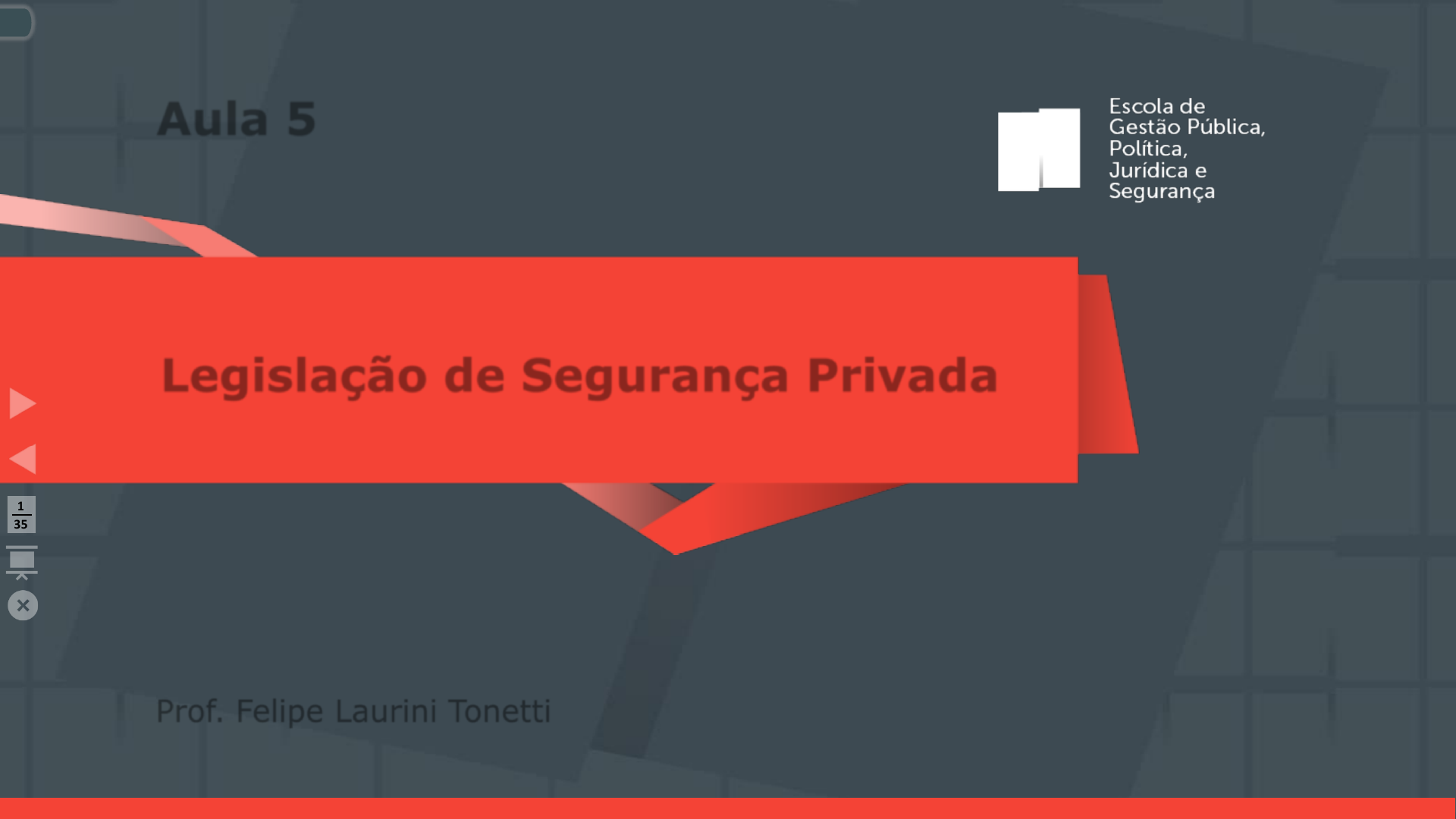 <p>35</p><p>1</p><p>Prof. Felipe Laurini Tonetti</p><p>Legislação de Segurança Privada</p><p>Aula 5</p><p>35</p><p>2</p><p>Conversa Inicial</p><p>35</p><p>3</p><p>Requisitos normativos – autorização</p><p>Certificado de segurança – requisitos</p><p>instalações físicas</p><p>Conceito da atividade</p><p>Requisitos profissionais vigilante</p><p>Cursos homologados e cursos correlatos</p><p>Constituição das empresas</p><p>de segurança: cursos de formação</p><p>35</p><p>4</p><p>Requisitos de autorização</p><p>35</p><p>5</p><p>Mesmo tratamento – empresa especializada</p><p>Oferta de alimentação e hospedagem</p><p>Fornecimento de materiais didáticos,</p><p>materiais escolares e uniformes</p><p>Cessão de espaço físico para ser utilizado em</p><p>processos de recrutamento e seleção de</p><p>vigilantes, no interesse de empresas de</p><p>segurança</p><p>Objeto social – novidades</p><p>da Portaria n. 18.045</p><p>35</p><p>6</p><p>A CGCSP/DPA/PF definirá, em ato normativo</p><p>do Coordenador-Geral de Controle de</p><p>Serviços e Produtos, o procedimento para</p><p>que a Polícia Federal realize a avaliação</p><p>nacional da qualidade do ensino ministrado</p><p>aos vigilantes pelas empresas de curso de</p><p>formação</p><p>Anexo I – Portaria n. 3.233/2012</p><p>Matriz curricular</p><p>35</p><p>7</p><p>São eles</p><p>Capital social integralizado 100 mil UFIRs</p><p>Sócios e/ou administradores não podem ter</p><p>condenação criminal registrada</p><p>Recolhimento das taxas</p><p>Ter instalações físicas comprovadas</p><p>mediante certificado de segurança</p><p>35</p><p>8</p><p>Certificado de</p><p>segurança – requisitos</p><p>para instalações físicas</p><p>35</p><p>9</p><p>Uso e acesso exclusivos ao estabelecimento</p><p>Setor administrativo</p><p>Sala de armas e caixa de areia – mesmas</p><p>especificações tratadas na Aula 2</p><p>Requisitos – instalações físicas da empresa</p><p>35</p><p>10</p><p>Vigilância patrimonial ou equipamentos elétricos,</p><p>eletrônicos ou de filmagem, funcionando</p><p>ininterruptamente</p><p>No mínimo três salas de aula adequadas, com</p><p>projetor multimídia, com capacidade mínima</p><p>para formação mensal simultânea de 100</p><p>vigilantes, limitando-se o número de 60 alunos</p><p>por sala de aula</p><p>Local adequado para treinamento físico e de</p><p>defesa pessoal</p><p>Sala de instrutores</p><p>Estande de tiro próprio ou conveniado</p><p>35</p><p>11</p><p>Atividade de curso de formação</p><p>35</p><p>12</p><p>Matricular apenas alunos que preenchem os</p><p>requisitos profissionais</p><p>Informar à Policia Federal relação nominal e</p><p>a qualificação dos alunos</p><p>Em até 5 dias úteis, contados do início dos</p><p>cursos de formação</p><p>Em até 3 dias úteis, contados do início dos</p><p>cursos de extensão ou reciclagem</p><p>Processos de turmas</p><p>35</p><p>13</p><p>Informar à Policia Federal a relação nominal</p><p>e a qualificação dos alunos aprovados em até</p><p>10 dias úteis contados da data de conclusão</p><p>de cada curso de formação, extensão ou</p><p>reciclagem</p><p>Homologação: certificado – DELESP ou UCV</p><p>Documentação de alunos – a escola deve</p><p>manter em arquivo físico ou digital – no</p><p>mínimo 6 meses</p><p>35</p><p>14</p><p>Equipadas com projetores de multimídia</p><p>Manter em sala de aula no máximo 60 alunos,</p><p>sendo permitida a presença de até 15 alunos</p><p>excedentes que</p><p>Tenham sido reprovados em alguma disciplina,</p><p>desde que não supere um terço do total de</p><p>disciplinas do curso</p><p>Estejam frequentando o curso, desde que</p><p>iniciado dentro do prazo máximo de três</p><p>meses da conclusão do curso anterior</p><p>Salas de aula</p><p>35</p><p>15</p><p>Armas de propriedade da escola</p><p>Coletes</p><p>Munições – aquisição ou receber em</p><p>doação das empresas de segurança</p><p>Material controlado</p><p>35</p><p>16</p><p>Requerimento eletrônico – GESP</p><p>Validade de cinco anos</p><p>Abrangência</p><p>Renovação 30 dias antes do vencimento</p><p>Requisitos da Portaria n. 14/2023 – CGCSP</p><p>Documentos pessoais e certidões criminais</p><p>negativas</p><p>Credenciamento dos instrutores</p><p>35</p><p>17</p><p>Legislação Aplicada e Direitos Humanos</p><p>Noções de Segurança Privada</p><p>Papel do Vigilante na Estrutura de Segurança</p><p>em Recintos de Grandes Eventos</p><p>Gerenciamento de Público</p><p>Controle de Acesso</p><p>Gestão de Multidões e Manutenção de Um</p><p>Ambiente Harmônico</p><p>Gestão de segurança privada – disciplinas</p><p>35</p><p>18</p><p>Resolução de Situações de Emergência</p><p>Vigilância</p><p>Segurança Pessoal Privada</p><p>35</p><p>19</p><p>Requisitos profissionais</p><p>do vigilante</p><p>35</p><p>20</p><p>Ser brasileiro nato ou naturalizado</p><p>Ter idade mínima de 21 anos</p><p>Ter instrução correspondente ao 5º ano do</p><p>ensino fundamental</p><p>Ter sido aprovado em curso de formação de</p><p>vigilante, realizado por empresa de curso de</p><p>formação devidamente autorizada</p><p>35</p><p>21</p><p>Ter sido aprovado em exames de saúde</p><p>física, mental e de aptidão psicológica</p><p>Apresentar certidões negativas de</p><p>antecedentes criminais sem registros de ter</p><p>sido condenado em processo criminal</p><p>Estar quite com as obrigações eleitorais e</p><p>militares</p><p>Ter CPF</p><p>35</p><p>22</p><p>indiciamento ou processo criminal instaurado</p><p>por crimes culposos</p><p>Condenação criminal quando obtida</p><p>reabilitação criminal fixada em sentença</p><p>Condenação criminal quando decorrido</p><p>período superior a cinco anos contados da</p><p>data de cumprimento ou de extinção da pena</p><p>Não constituem óbice à profissão</p><p>35</p><p>23</p><p>Instauração de termo circunstanciado</p><p>Ocorrência de transação penal</p><p>Suspensão condicional do pro