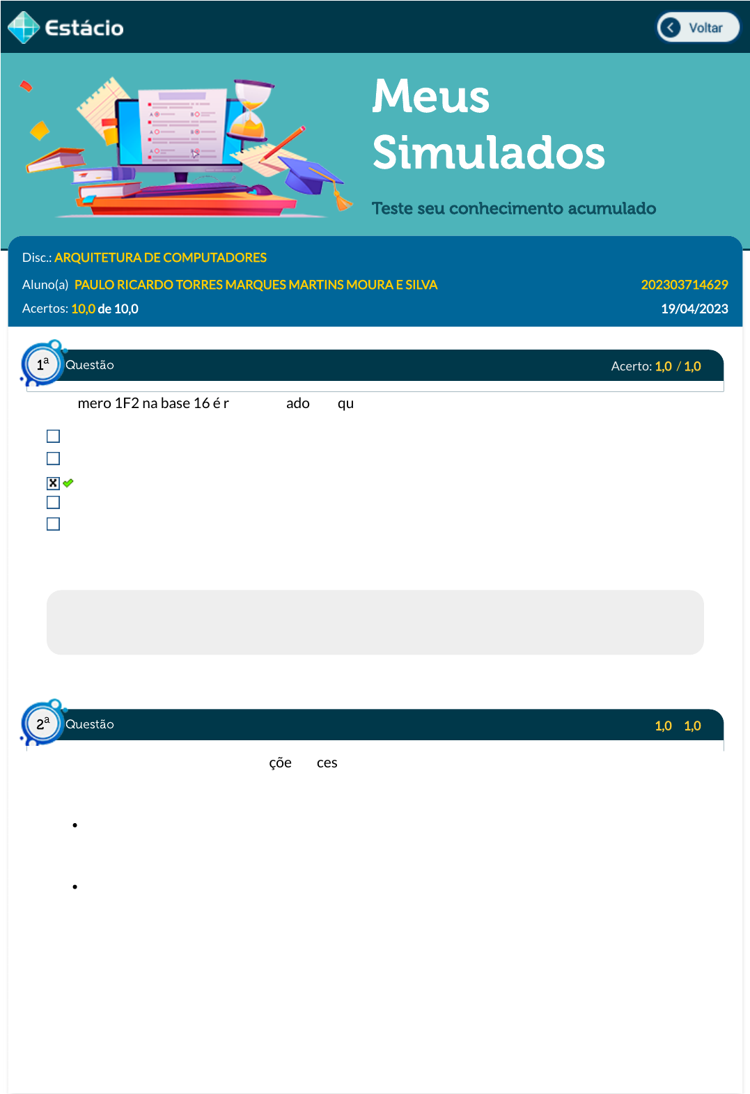 <p>19/04/2023, 14:53 Estácio: Alunos</p><p>https://simulado.estacio.br/alunos/ 1/5</p><p>Meus</p><p>Simulados</p><p>Teste seu conhecimento acumulado</p><p>Disc.: ARQUITETURA DE COMPUTADORES</p><p>Aluno(a): PAULO RICARDO TORRES MARQUES MARTINS MOURA E SILVA 202303714629</p><p>Acertos: 10,0 de 10,0 19/04/2023</p><p>Acerto: 1,0 / 1,0</p><p>O número 1F2 na base 16 é representado por qual número na base 2?</p><p>100000001101</p><p>111100100001</p><p>000111110010</p><p>001111110001</p><p>110000001110</p><p>Respondido em 19/04/2023 14:45:17</p><p>Explicação:</p><p>A resposta correta é: 000111110010</p><p>Acerto: 1,0 / 1,0</p><p>Para realizar as conversões e operações necessárias, considere:</p><p>Os valores como potências da base 10;</p><p>Os resultados expressos com os números escritos por extenso (não usar notação cientí�ca, como,</p><p>por exemplo, 1 x 103).</p><p>Dica: calcular usando a unidade de medida padrão como base de cálculo (bits ou Bytes).</p><p>A operação 128 Mbits - 2MBytes é igual a:</p><p>Questão1</p><p>a</p><p>Questão2</p><p>a</p><p>https://simulado.estacio.br/alunos/inicio.asp</p><p>javascript:voltar();</p><p>19/04/2023, 14:53 Estácio: Alunos</p><p>https://simulado.estacio.br/alunos/ 2/5</p><p>126 KB</p><p>14.000 KB</p><p>130 KB</p><p>2128 KB</p><p>1282 KB</p><p>Respondido em 19/04/2023 14:46:46</p><p>Explicação:</p><p>A resposta correta é: 14.000 KB</p><p>Acerto: 1,0 / 1,0</p><p>Uma determinada porta lógica possui duas entradas, X e Y. Quando X e Y são 0 a saída é 0. Quando X e Y são 1 a</p><p>saída também é 0. Qual é a porta lógica que possui esta tabela verdade?</p><p>OR</p><p>NOR</p><p>NAND</p><p>AND</p><p>XOR</p><p>Respondido em 19/04/2023 14:47:24</p><p>Explicação:</p><p>A resposta correta é: XOR</p><p>A B XOR</p><p>0 0 0</p><p>0 1 1</p><p>1 0 1</p><p>1 1 0</p><p>Acerto: 1,0 / 1,0</p><p>A partir da expressão: A + (B . C). Escolha a única alternativa que representa uma expressão equivalente.</p><p>(A . B) + (A . C)</p><p>A + B</p><p>A</p><p>(A + B) . (A + C)</p><p>A + C</p><p>Respondido em 19/04/2023 14:48:26</p><p>Explicação:</p><p>A resposta correta é: (A + B) . (A + C)</p><p>Questão3</p><p>a</p><p>Questão4</p><p>a</p><p>19/04/2023, 14:53 Estácio: Alunos</p><p>https://simulado.estacio.br/alunos/ 3/5</p><p>A B C A∨(B∧C) (A∨B)∧(A∨C)</p><p>1 1 1 1 1</p><p>1 1 0 1 1</p><p>1 0 1 1 1</p><p>0 1 1 1 1</p><p>0 0 1 0 0</p><p>0 1 0 0 0</p><p>1 0 0 1 1</p><p>0 0 0 0 0</p><p>Acerto: 1,0 / 1,0</p><p>Em relação à classi�cação das arquiteturas paralelas de�nida como Taxonomia de Flynn, em uma delas é tratada</p><p>a execução síncrona de instrução para todos os dados, correspondendo ao caso das arquiteturas vetoriais. A</p><p>a�rmação acima está relacionada a qual das classes de�nidas por Flynn?</p><p>DISM</p><p>SIMD</p><p>SISD</p><p>MIMD</p><p>MISD</p><p>Respondido em 19/04/2023 14:49:05</p><p>Explicação:</p><p>A resposta correta é: SIMD</p><p>Acerto: 1,0 / 1,0</p><p>Selecione o processador que segue a arquitetura RISC dentre os processadores teóricos cujas</p><p>especi�cações técnicas são apresentadas a seguir:</p><p>Processador A: 16 registradores, 30 instruções de 2 a 4 bytes de tamanho.</p><p>Processador E: 4 registradores, 64 instruções de 2 a 4 bytes de tamanho.</p><p>Processador D: 16 registradores, 30 instruções de 4 bytes de tamanho.</p><p>Processador B: 8 registradores, 128 instruções de 4 a 7 bytes de tamanho.</p><p>Processador C: 8 registradores, 32 instruções de 2 a 5 bytes de tamanho.</p><p>Respondido em 19/04/2023 14:50:33</p><p>Explicação:</p><p>A resposta correta é: Processador D: 16 registradores, 30 instruções de 4 bytes de tamanho.</p><p>As abordagens RISC utilizam tamanho �xo de instrução de 4 bytes.</p><p>Acerto: 1,0 / 1,0</p><p>Questão5</p><p>a</p><p>Questão6</p><p>a</p><p>Questão</p><p>7</p><p>a</p><p>19/04/2023, 14:53 Estácio: Alunos</p><p>https://simulado.estacio.br/alunos/ 4/5</p><p>Os componentes que formam o cerne da infraestrutura da internet, responsáveis por cobrir as enormes</p><p>distâncias intercontinentais e transportar os datagramas pelo mundo, são chamados de:</p><p>Roteadores.</p><p>Infraestrutura de circuitos virtuais.</p><p>World Wide Web.</p><p>Servidores.</p><p>Modems.</p><p>Respondido em 19/04/2023 14:50:10</p><p>Explicação:</p><p>A resposta correta é: Roteadores.</p><p>Os Sistemas Autônomos e os roteadores de Backbone são responsáveis por permitir a interconexão e a troca de</p><p>pacotes (também chamados de datagramas) no ambiente de roteamento global.</p><p>Acerto: 1,0 / 1,0</p><p>A tecnologia de SSD veio para substituir os discos rígidos. Sem partes móveis, é menos propensa a falhas, além</p><p>de ser mais rápida que seus antecessores.</p><p>Os discos rígidos e os SSD não são fundamentais, de forma conceitual, para os computadores. Entretanto, são</p><p>peças muito importantes, na prática, para os computadores pessoais. Isso se deve ao fato de:</p><p>O processador não possuir armazenamento para os programas.</p><p>O disco ser responsável por receber os dados do teclado e do mouse.</p><p>A energia consumida pelo disco ser muito menor que a consumida pela memória RAM.</p><p>O barramento entre o processador e a memória RAM ser muito lento.</p><p>A memória RAM ser volátil.</p><p>Respondido em 19/04/2023 14:50:51</p><p>Explicação:</p><p>A memória RAM é uma memória do tipo volátil, ou seja, todos os dados são imediatamente apagados quando o</p><p>sistema �ca sem energia.</p><p>Acerto: 1,0 / 1,0</p><p>Um processador possui resumidamente duas funções principais: Processamento e controle. Nesse contexto, em</p><p>que área da UCP (processador) se realiza a movimentação de dados e de instruções de E/S para o processador?</p><p>Registrador de Endereço - REM.</p><p>Unidade de Controle - UC.</p><p>Registrador de Dados de Memória - RDM.</p><p>Registrador de instrução - RI.</p><p>Contador de