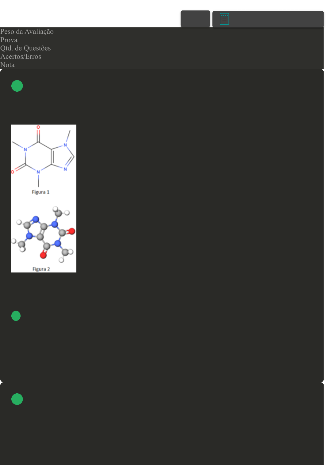 <p>Prova Impressa</p><p>GABARITO | Avaliação I - Individual (Cod.:989739)</p><p>Peso da Avaliação 2,00</p><p>Prova 85192887</p><p>Qtd. de Questões 10</p><p>Acertos/Erros 9/1</p><p>Nota 9,00</p><p>A cafeína se apresenta na forma de um pó branco, sem cheiro, apresentando sabor amargo e</p><p>extremamente solúvel em água quente. É encontrada em certas plantas, como o café, o guaraná e a</p><p>erva-mate, servindo para o consumo de bebidas, na forma de infusão, como estimulante. A figura a</p><p>seguir mostra algumas formas de representação da molécula de cafeína:</p><p>Considerando a cafeína e essas representações, assinale a alternativa CORRETA:</p><p>A A partir das representações da molécula de cafeína é possível determinar que sua fórmula</p><p>molecular é C9H12N3O1.</p><p>B A representação condensada (Figura 1) deixa implícita a presença dos átomos de carbono e de</p><p>hidrogênio.</p><p>C A representação por bolas e varetas (Figura 2) é útil para se ter uma ideia da estrutura molecular</p><p>no plano do papel.</p><p>D A cafeína é formada por duas cadeias carbônicas fechadas e heterogêneas, possuindo apenas</p><p>ligações saturadas entre átomos de carbono.</p><p>Na área da química, bem como na química orgânica, se procura compreender como as moléculas são</p><p>formadas e como é a estrutura desses compostos. Sendo assim, uma das formas de se estudar a</p><p>estrutura dos compostos orgânicos é por meio da classificação da cadeia de carbônica do composto</p><p>em análise. Observe a figura a seguir que mostra a estrutura do 3,3-dimetil-penteno:</p><p>VOLTAR</p><p>A+ Alterar modo de visualização</p><p>1</p><p>2</p><p>27/08/2024, 17:08 Avaliação I - Individual</p><p>about:blank 1/5</p><p>Com base na figura exposta, classifique V para as sentenças verdadeiras e F para as falsas:</p><p>( ) Os átomos de carbono 2 e 4 são terciários, pois estão ligados a quatro átomos.</p><p>( ) Os átomos de carbonos 1 e 5 são primários, pois estão ligados a apenas um outro átomo de</p><p>carbono.</p><p>( ) O carbono 3 é quaternário, pois está ligado a quatro outros átomos de carbono.</p><p>( ) Apenas o átomo de carbono 2 é secundário, pois só ele está ligado a outros dois átomos de</p><p>carbono.</p><p>Assinale a alternativa que apresenta a sequência CORRETA:</p><p>A V - F - V - F.</p><p>B F - V - F - V.</p><p>C V - F - F - V.</p><p>D F - V - V - F.</p><p>Segundo os princípios da mecânica quântica, os orbitais atômicos dos elétrons só podem ser definidos</p><p>se forem conhecidos os seus quatro números quânticos. Isso porque cada elétron de um átomo possui</p><p>uma identidade única e bem definida. Sobre os números quânticos, classifique V para as sentenças</p><p>verdadeiras e F para as falsas:</p><p>( ) O número quântico principal (n) indica a camada de energia do orbital, definindo seu tamanho.</p><p>( ) O número quântico azimutal (l) indica a subcamada ocupada pelo elétron, definindo a forma do</p><p>orbital.</p><p>( ) O número quântico magnético (ml) indica o sentido da rotação do elétron no orbital atômico.</p><p>( ) O número quântico magnético de spin (ms) indica a orientação do momento angular do orbital</p><p>(orientação cartesiana xyz do orbital atômico).</p><p>Assinale a alternativa que apresenta a sequência CORRETA:</p><p>A F - F - V - V.</p><p>B F - V - F - V.</p><p>C V - V - F - F.</p><p>D V - F - V - F.</p><p>De acordo com a definição da IUPAC, os alcanos são compostos orgânicos que apresentam apenas</p><p>átomos de hidrogênio e de carbono, nos quais há apenas ligações simples. Além disso, os alcanos</p><p>podem ter cadeias de carbono acíclicas ou cíclicas, e podem ter ou não ramificações. Nesse contexto,</p><p>analise a cadeia de carbono a seguir:</p><p>3</p><p>4</p><p>27/08/2024, 17:08 Avaliação I - Individual</p><p>about:blank 2/5</p><p>Com base na cadeia de carbono exposta, analise as sentenças a seguir:</p><p>I- A nomenclatura correta para esse composto é 3-metilhexano.</p><p>II- O composto apresenta uma ramificação no carbono 3.</p><p>III- A cadeia carbônica é cíclica e saturada.</p><p>IV- Não há heteroátomo presente nessa cadeia carbônica.Assinale a alternativa CORRETA:</p><p>A As sentenças II, III e IV estão corretas.</p><p>B As sentenças I, II e IV estão corretas.</p><p>C As sentenças I, II e III estão corretas.</p><p>D As sentenças I, III e IV estão corretas.</p><p>August Wilhelm von Hoffmann foi quem introduziu o termo "aromático" para se referir a uma classe</p><p>de moléculas que possuía odores característicos, como o benzeno, que apresenta odor do carvão</p><p>destilado. No entanto, com o avanço do conhecimento científico, se observou que esses compostos</p><p>tinham estruturas e propriedades químicas que os diferenciavam dos outros compostos orgânicos.</p><p>Com base nisso, analise a figura a seguir:</p><p>Sobre o nome desse composto aromático, assinale a alternativa CORRETA:</p><p>A 1,4-dietil-benzeno.</p><p>B 1,4-dimetil-benzeno.</p><p>C 1,2-dimetil-benzeno.</p><p>D 1,3-dietil-benzeno.</p><p>Os ácidos graxos apresentam o grupo funcional ácido carboxílico e longas cadeias de</p><p>hidrocarbonetos, as quais podem chegar a ter 36 átomos de carbono. Um exemplo de ácido graxo é o</p><p>ácido palmitoleico, que está presente no tecido adiposo e no fígado. Sobre a classificação das cadeias</p><p>carbônicas, analise a figura a seguir:</p><p>5</p><p>6</p><p>27/08/2024, 17:08 Avaliação I - Individual</p><p>about:blank 3/5</p><p>Com base na figura exposta, classifique V para as sentenças verdadeiras e F para as falsas:</p><p>( ) A cadeia carbônica do ácido palmitoleico é classificada como insaturada.</p><p>( ) A cadeia carbônica do ácido palmitoleico é classificada como aromática.</p><p>( ) A cadeia carbônica do ácido palmitoleico é classificada como ramificada.</p><p>( ) A cadeia carbônica do ácido palmi