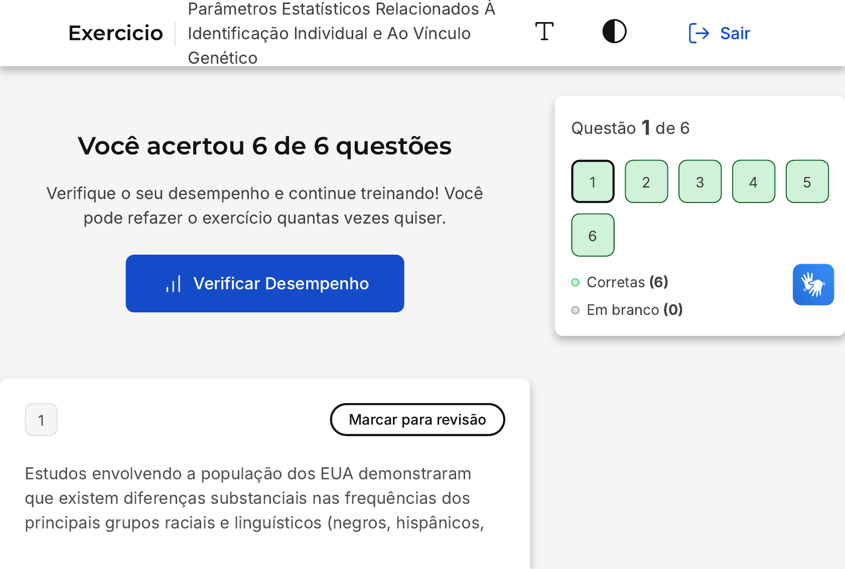 <p>Você acertou 6 de 6 questões</p><p>Verifique o seu desempenho e continue treinando! Você</p><p>pode refazer o exercício quantas vezes quiser.</p><p>Verificar Desempenho</p><p>1 Marcar para revisão</p><p>Estudos envolvendo a população dos EUA demonstraram</p><p>que existem diferenças substanciais nas frequências dos</p><p>principais grupos raciais e linguísticos (negros, hispânicos,</p><p>Questão 1 de 6</p><p>Corretas �6�</p><p>Em branco �0�</p><p>1 2 3 4 5</p><p>6</p><p>Exercicio</p><p>Parâmetros Estatísticos Relacionados À</p><p>Identificação Individual e Ao Vínculo</p><p>Genético</p><p>Sair</p><p>A</p><p>B</p><p>C</p><p>índios, asiáticos, brancos). Com base nesta afirmação,</p><p>podemos afirmar que:</p><p>Em virtude dessas diferenças, devem ser feitos</p><p>bancos de dados separados para cada</p><p>subpopulação.</p><p>É proibida mundialmente a criação de bancos de</p><p>dados de DNA.</p><p>As frequências alélicas para cada grupo</p><p>populacional são imutáveis.</p><p>D</p><p>E</p><p>Essa afirmação é válida somente para casos</p><p>criminais, mas não para investigações de vínculo</p><p>genético.</p><p>As diferenças só valem para indivíduos que não são</p><p>miscigenados.</p><p>Resposta correta</p><p>Parabéns, você selecionou a alternativa correta.</p><p>Confira o gabarito comentado!</p><p>Gabarito Comentado</p><p>A questão aborda as diferenças substanciais nas</p><p>frequências dos principais grupos raciais e linguísticos</p><p>nos EUA. Diante dessas diferenças, é importante que</p><p>sejam feitos bancos de dados separados para cada</p><p>subpopulação. Isso permite uma análise mais precisa e</p><p>detalhada das características genéticas de cada grupo,</p><p>A</p><p>B</p><p>contribuindo para estudos e pesquisas na área da</p><p>genética e da biologia populacional.</p><p>2 Marcar para revisão</p><p>Em relação a um laudo de genética forense, é correto</p><p>afirmar:</p><p>Os métodos usados podem ser omitidos.</p><p>Quando a tipagem genética de amostras é igual,</p><p>torna-se necessário expressar numericamente a</p><p>significância do evento somente em casos de</p><p>identificação de vínculo genético.</p><p>C</p><p>D</p><p>E</p><p>O número de marcadores empregados, a presença</p><p>de subestruturas na população e a mistura de</p><p>amostras podem interferir nos resultados em</p><p>determinadas situações.</p><p>O fato de duas ou mais amostras terem o mesmo</p><p>perfil para um grupo de marcadores genéticos em</p><p>especial não significa, obrigatoriamente, que elas</p><p>tenham a mesma origem (mesmo doador).</p><p>A expressão numérica do valor do resultado é</p><p>apenas uma informação adicional, pois, havendo</p><p>coincidência entre os perfis, o dado já é forte</p><p>suficiente, uma vez que é tido como "prova</p><p>suficiente".</p><p>Resposta correta</p><p>Parabéns, você selecionou a alternativa correta.</p><p>Confira o gabarito comentado!</p><p>Gabarito Comentado</p><p>O fato de duas ou mais amostras terem o mesmo perfil</p><p>para um grupo de marcadores genéticos em especial</p><p>não significa, obrigatoriamente, que elas tenham a</p><p>mesma origem (mesmo doador). Isso ocorre porque a</p><p>genética é complexa e a coincidência de alguns</p><p>marcadores não garante a origem comum. É necessário</p><p>um estudo mais aprofundado e a análise de um maior</p><p>número de marcadores para confirmar a origem das</p><p>amostras.</p><p>3 Marcar para revisão</p><p>A</p><p>B</p><p>O estudo das populações e a criação de modelos teóricos</p><p>são muito importantes para a genética de populações e a</p><p>genética forense. Existem diversas premissas devem ser</p><p>consideradas para uma população se enquadrar ao princípio</p><p>de Hardy-Weinberg. A este respeito, destas premissas,</p><p>analise as afirmativas abaixo.</p><p>I � Deve haver mais fêmeas que machos na população, em</p><p>razão de um individuos do sexo masculino poder fecundar</p><p>várias fêmeas simultaneamente, gerando um ganho a</p><p>variabilidade genética.</p><p>II � Em uma população em equilíbrio de Hardy-Weinberg, não</p><p>podem ocorrer mutações e fluxo gênico.</p><p>III � Todos os cruzamentos devem se dar de modo aleatório.</p><p>Marque a alternativa que apresenta a(s)</p><p>afirmativa(s) correta(s).</p><p>Apenas a afirmativa II está correta.</p><p>Apenas as afirmativas I e II estão corretas.</p><p>C</p><p>D</p><p>E</p><p>Apenas as afirmativas II e III estão corretas.</p><p>As afirmativas I, II e III estão corretas.</p><p>Apenas as afirmativas I e III estão corretas.</p><p>Resposta correta</p><p>Parabéns, você selecionou a alternativa correta.</p><p>Confira o gabarito comentado!</p><p>Gabarito Comentado</p><p>A afirmativa I está incorreta pois algumas premissas</p><p>devem ser consideradas para uma população se</p><p>enquadrar no princípio de Hardy-Weinberg, como</p><p>apresentar o mesmo número de machos e fêmeas.</p><p>A</p><p>B</p><p>4 Marcar para revisão</p><p>Identifique a afirmação incorreta:</p><p>A tipagem genética de indivíduos baseada na</p><p>análise de regiões hipervariáveis do DNA possui</p><p>alto poder de discriminação.</p><p>Se o perfil genético encontrado em uma evidência</p><p>biológica é igual ao de um suspeito, isto pode</p><p>representar que a evidência tem como fonte aquela</p><p>pessoa, dependendo da frequência na população</p><p>dos alelos tipados, ou ainda, pode representar que</p><p>houve um emparelhamento (igualdade de perfis) ao</p><p>acaso entre indivíduos distintos.</p><p>C</p><p>D</p><p>E</p><p>A probabilidade de emparelhamento indica a</p><p>possibilidade de se encontrar dois indivíduos com o</p><p>mesmo perfil genético.</p><p>Em um tribunal, a apresentação do perfil genético</p><p>de uma evidência geralmente vem acompanhada de</p><p>proposições numéricas apenas de forma ilustrativa,</p><p>já que a força da t