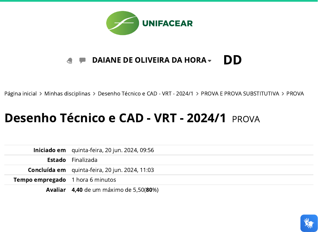 <p>DD</p><p>Desenho Técnico e CAD - VRT - 2024/1 PROVA</p><p>Iniciado em quinta-feira, 20 jun. 2024, 09:56</p><p>Estado Finalizada</p><p>Concluída em quinta-feira, 20 jun. 2024, 11:03</p><p>Tempo empregado 1 hora 6 minutos</p><p>Avaliar 4,40 de um máximo de 5,50(80%)</p><p>DAIANE DE OLIVEIRA DA HORA </p><p>Página inicial Minhas disciplinas Desenho Técnico e CAD - VRT - 2024/1 PROVA E PROVA SUBSTITUTIVA PROVA</p><p>https://ava.unifacear.edu.br/</p><p>https://ava.unifacear.edu.br/</p><p>https://ava.unifacear.edu.br/user/view.php?id=97278&course=132402</p><p>https://ava.unifacear.edu.br/</p><p>https://ava.unifacear.edu.br/my/courses.php</p><p>https://ava.unifacear.edu.br/course/view.php?id=132402§ion=0</p><p>https://ava.unifacear.edu.br/course/view.php?id=132402§ion=8</p><p>https://ava.unifacear.edu.br/mod/quiz/view.php?id=980073</p><p>Questão 1 Incorreto Atingiu 0,00 de 0,55</p><p>Nas Figuras abaixo, V1, V2, V3 e V4 são vistas de peças, onde estão indicados os cortes correspondentes.</p><p>X-I, X-II, X-III e X-IV são representações dos cortes.</p><p>O par em que há a correta correspondência entre a peça e sua vista em corte é:</p><p>Escolha uma opção:</p><p>a. V3 E X-II Resposta errada!</p><p>b. V1 E X-II</p><p>c. V4 E X-IV</p><p>d. V4 E X-III</p><p>e. V2 E X-I</p><p>Sua resposta está incorreta.</p><p>O único par que representa correspondência correta é V2 E X-1.</p><p>PG. 05 – TEXTO BASE 04</p><p>Questão 2 Correto Atingiu 0,55 de 0,55</p><p>A �gura representa um sólido em perspectiva isométrica.</p><p>As �guras I, II e III a seguir representam as três vistas ortogonais principais (sem escala e com</p><p>proporções aproximadas) desse sólido.</p><p>Considerando-se as informações apresentadas, é correto a�rmar que a �gura</p><p>Escolha uma opção:</p><p>a. II representa a vista superior e a �gura III, a vista frontal do sólido.</p><p>b. II representa a vista inferior e a �gura III, a vista frontal do sólido.</p><p>c. I representa a vista superior e a �gura II, a vista frontal do sólido. Resposta correta!</p><p>d. I representa a vista frontal e a �gura II, a vista lateral esquerda do sólido.</p><p>e. II representa a vista frontal e a �gura III, a vista superior do sólido.</p><p>Sua resposta está correta.</p><p>Pela observação das imagens é possível veri�car que I representa a vista superior e a �gura II, a vista frontal</p><p>do sólido.</p><p>PG. 08 – TEXTO BASE 03</p><p>Questão 3 Incorreto Atingiu 0,00 de 0,55</p><p>Sobre as vistas representadas abaixo, analise as a�rmações:</p><p>I - O corte A-A é resultado de um corte composto.</p><p>II - A vista superior e a vista em corte são su�cientes para representar a peça.</p><p>III - Não é necessário o corte composto, pois as dimensões do rasgo na vista superior são evidentes.</p><p>Está correto o que se a�rma em:</p><p>Escolha uma opção:</p><p>a. II e III, apenas.</p><p>b. I, apenas.</p><p>c. Nenhuma das a�rmações está correta.</p><p>d. I, II e III. Resposta errada!</p><p>e. I e II, apenas.</p><p>Sua resposta está incorreta.</p><p>O corte A-A é resultado de um corte composto.</p><p>A vista superior e a vista em corte são su�cientes para representar a peça.</p><p>É necessário o corte composto, pois as dimensões do rasgo na vista superior não são evidentes.</p><p>PG. 05 – TEXTO BASE 04</p><p>Questão 4 Correto Atingiu 0,55 de 0,55</p><p>Considerando as de�nições abaixo:</p><p>I. Taxa de ocupação: Relação percentual entre a projeção da edi�cação e a área do terreno.</p><p>II. Coe�ciente de aproveitamento: É um número que, multiplicado pela área do lote, indica a quantidade</p><p>máxima de metros quadrados que podem ser construídos em um lote, somando-se as áreas de todos</p><p>os pavimentos.</p><p>Pode se a�rmar que:</p><p>Escolha uma opção:</p><p>a. Apenas a de�nição II está correta.</p><p>b. São corretas as de�nições I e II. Resposta correta!</p><p>c. Apenas a de�nição I está correta.</p><p>d. Não é possível a�rmar se as de�nições estão corretas.</p><p>e. Nenhuma das de�nições é correta.</p><p>Sua resposta está correta.</p><p>Taxa de ocupação: é a porcentagem do terreno que pode ser ocupado pela projeção da edi�cação. O</p><p>objetivo da taxa de ocupação é limitar um crescimento urbano exagerado.</p><p>Coe�ciente de aproveitamento: o coe�ciente de aproveitamento é um número que, multiplicado pela área</p><p>do lote, indica a quantidade máxima de metros quadrados que podem ser construídos em um lote,</p><p>somando-se as áreas de todos os pavimentos.</p><p>PG. 13 – TEXTO BASE 05</p><p>Questão 5 Correto Atingiu 0,55 de 0,55</p><p>“Cria cópias múltiplas de objetos numa disposição de�nida.” Considerando o trecho, com base nos</p><p>comandos do AutoCAD, assinale a alternativa CORRETA:</p><p>Escolha uma opção:</p><p>a. HATCH</p><p>b. ARRAY Resposta correta!</p><p>c. ORTHO</p><p>d. CHAMFER</p><p>e. BLOCK</p><p>Sua resposta está correta.</p><p>Array (ARRAY)</p><p>Cria múltiplas cópias de um objeto obedecendo a um padrão.</p><p>PG. 06 – TEXTO BASE 06</p><p>Questão 6 Correto Atingiu 0,55 de 0,55</p><p>São verdadeiras as a�rmações:</p><p>I. O padrão internacional para tamanho de papéis ISO 216 é baseado no padrão alemão DIN 476.</p><p>II. Partindo do sistema métrico, o formato-base é uma folha de papel medindo 1 m² de área (A0).</p><p>III. A proporção entre os lados do papel se mantém quando a folha é cortada pela metade ou dobrada.</p><p>Escolha uma opção:</p><p>a. Nenhuma das alternativas é correta</p><p>b. I, II e III Resposta correta!</p><p>c. Somente II</p><p>d. Somente I</p><p>e. Somente I e II</p><p>Sua resposta está correta.</p><p>Os tamanhos de papel se baseiam em sistemas reconhecidos o�cialmente por convenções. Atualmente há</p><p>dois principais sistemas em vigor: o sistema internacional ISO 216, adotado na maiori