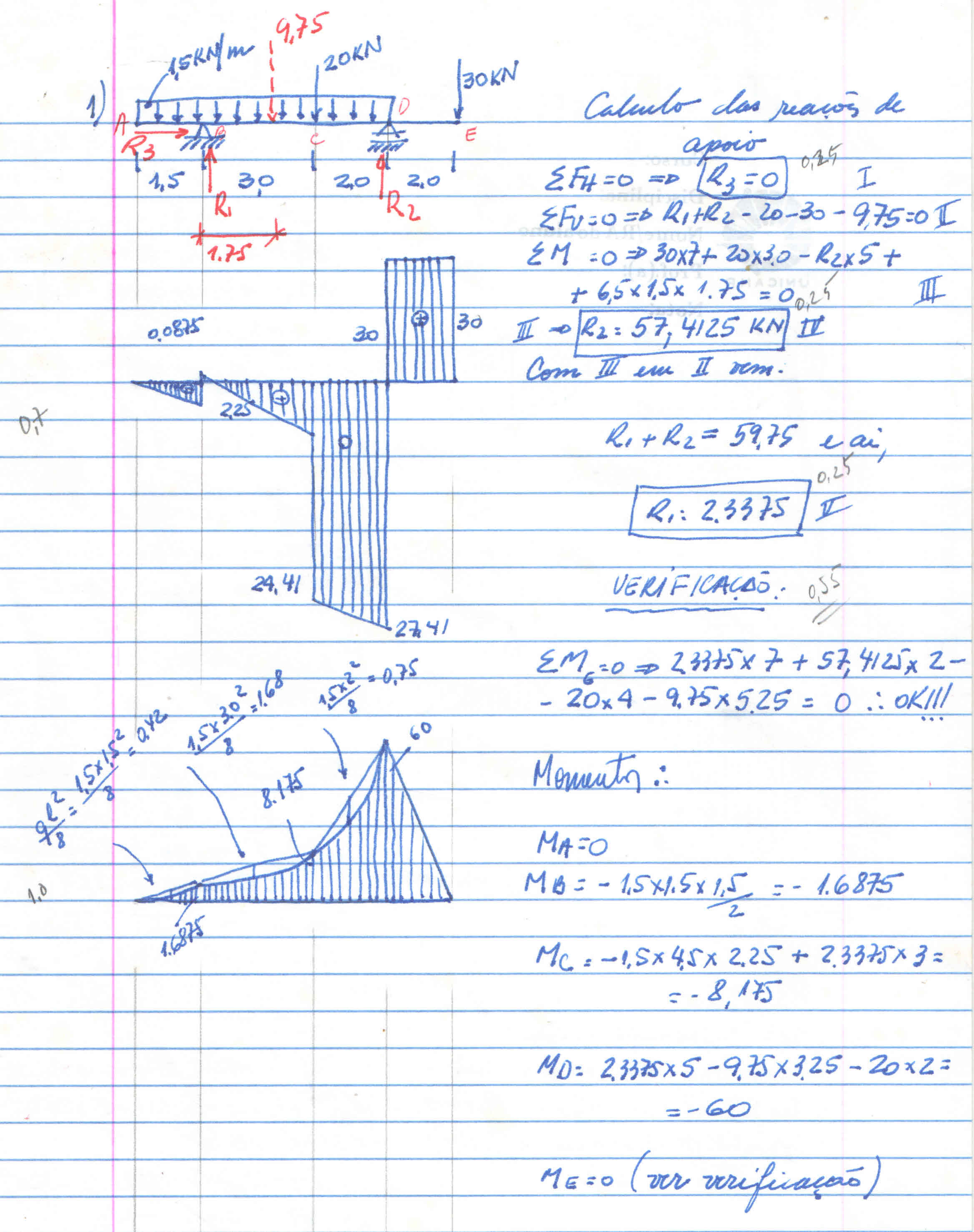 <p>30KN 1) das de N R3 apoio 30 2,0 EFH=0 =D I R2 - 1.75 EM =0 30x7+ 20x30 - to = III 0.0875 30 30 III KN II Com III em II 2,25 Q eai, 0,25 Ri: 2.3375 II 24,41 A 4125x2- 8 - = 60 MA=O 1.0 2 + MD: =-60 ME=O (ver</p>