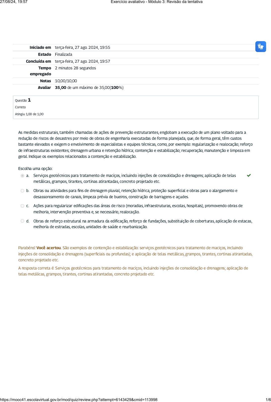 <p>Iniciado em terça-feira, 27 ago. 2024, 19:55</p><p>Estado Finalizada</p><p>Concluída em terça-feira, 27 ago. 2024, 19:57</p><p>Tempo</p><p>empregado</p><p>2 minutos 28 segundos</p><p>Notas 10,00/10,00</p><p>Avaliar 35,00 de um máximo de 35,00(100%)</p><p>Questão 1</p><p>Correto</p><p>Atingiu 1,00 de 1,00</p><p>As medidas estruturais, também chamadas de ações de prevenção estruturantes, englobam a execução de um plano voltado para a</p><p>redução de riscos de desastres por meio de obras de engenharia executadas de forma planejada, que, de forma geral, têm custos</p><p>bastante elevados e exigem o envolvimento de especialistas e equipes técnicas, como, por exemplo: regularização e realocação; reforço</p><p>de infraestruturas existentes; drenagem urbana e retenção hídrica; contenção e estabilização; recuperação, manutenção e limpeza em</p><p>geral. Indique os exemplos relacionados a contenção e estabilização.</p><p>Escolha uma opção:</p><p>a. Serviços geotécnicos para tratamento de maciços, incluindo injeções de consolidação e drenagens; aplicação de telas</p><p>metálicas, grampos, tirantes, cortinas atirantadas, concreto projetado etc.</p><p></p><p>b. Obras ou atividades para �ns de drenagem pluvial, retenção hídrica, proteção super�cial e obras para o alargamento e</p><p>desassoreamento de canais, limpeza prévia de bueiros, construção de barragens e açudes.</p><p>c. Ações para regularizar edi�cações das áreas de risco (moradias, infraestruturas, escolas, hospitais), promovendo obras de</p><p>melhoria, intervenção preventiva e, se necessário, realocação.</p><p>d. Obras de reforço estrutural na armadura da edi�cação, reforço de fundações, substituição de coberturas, aplicação de estacas,</p><p>melhoria de estradas, escolas, unidades de saúde e reurbanização.</p><p>Parabéns! Você acertou. São exemplos de contenção e estabilização: serviços geotécnicos para tratamento de maciços, incluindo</p><p>injeções de consolidação e drenagens (super�ciais ou profundas); e aplicação de telas metálicas, grampos, tirantes, cortinas atirantadas,</p><p>concreto projetado etc.</p><p>A resposta correta é: Serviços geotécnicos para tratamento de maciços, incluindo injeções de consolidação e drenagens; aplicação de</p><p>telas metálicas, grampos, tirantes, cortinas atirantadas, concreto projetado etc.</p><p>27/08/24, 19:57 Exercício avaliativo - Módulo 3: Revisão da tentativa</p><p>https://mooc41.escolavirtual.gov.br/mod/quiz/review.php?attempt=6143429&cmid=113998 1/6</p><p>Questão 2</p><p>Correto</p><p>Atingiu 1,00 de 1,00</p><p>Questão 3</p><p>Correto</p><p>Atingiu 1,00 de 1,00</p><p>Após ler e analisar a a�rmação, assinale se ela é verdadeira ou falsa: As ações não estruturais visam à redução de riscos e melhoria da</p><p>capacidade de resposta, sem a construção de infraestruturas ou adequação de habitações e outros elementos urbanos, mas sim pela</p><p>introdução de programas de conscientização e capacitação, normas e regulamentos. Essas medidas não estruturais destacam, também,</p><p>a necessidade de aproximação com as comunidades mais vulneráveis por meio de um processo contínuo de envolvimento e</p><p>participação efetiva em todas as fases de atuação da P&DC.</p><p>Escolha uma opção:</p><p>Verdadeiro </p><p>Falso</p><p>Parabéns! Você acertou, a a�rmação é verdadeira. As ações não estruturais visam à redução de riscos e melhoria da capacidade de</p><p>resposta, sem a construção de infraestruturas ou adequação de habitações e outros elementos urbanos, mas sim pela introdução de</p><p>programas de conscientização e capacitação, normas e regulamentos; e destacam a necessidade de aproximação com as comunidades</p><p>mais vulneráveis por meio de um processo contínuo de envolvimento e participação efetiva em todas as fases de atuação da P&DC.</p><p>A resposta correta é 'Verdadeiro'.</p><p>O CPRM disponibiliza estudos de Setorização de Risco e, como resultado, são apresentadas pranchas que indicam algumas</p><p>possibilidades de intervenção, de�nidas com base na avaliação de risco desenvolvida. Relacione as colunas com os exemplos de</p><p>intervenções referentes a eventos de “inundação” e de “deslizamento”.</p><p>Monitorar movimentações de terra na encosta em épocas de chuvas. </p><p>Evacuação da população. </p><p>Implantar políticas de controle urbano para inibir construções em áreas íngremes. </p><p>Implantação de sistema de alerta a nível de bacia hidrográ�ca. </p><p>Eventos de deslizamento</p><p>Eventos de inundação</p><p>Eventos de deslizamento</p><p>Eventos de inundação</p><p>Parabéns! Você acertou. São exemplos de intervenções em eventos de inundação: evacuação da população e implantação de sistema</p><p>de alerta a nível de bacia hidrográ�ca. São exemplos de intervenções em eventos de deslizamento: monitorar movimentações de terra</p><p>na encosta em épocas de chuvas e implantar políticas de controle urbano para inibir construções em áreas íngremes.</p><p>A resposta correta é: Monitorar movimentações de terra na encosta em épocas de chuvas. → Eventos de deslizamento, Evacuação da</p><p>população. → Eventos de inundação, Implantar políticas de controle urbano para inibir construções em áreas íngremes. → Eventos de</p><p>deslizamento, Implantação de sistema de alerta a nível de bacia hidrográ�ca. → Eventos de inundação.</p><p>27/08/24, 19:57 Exercício avaliativo - Módulo 3: Revisão da tentativa</p><p>https://mooc41.escolavirtual.gov.br/mod/quiz/review.php?attempt=6143429&cmid=113998 2/6</p><p>Questão 4</p><p>Correto</p><p>Atingiu 1,00 de 1,00</p><p>Questão 5</p><p>Correto</p><p>Atingiu 1,00 de 1,00</p><p>Após ler e analisar a a�rmação, assinale se ela é verdadeira ou falsa:</p><p>Sobre fontes de recurso