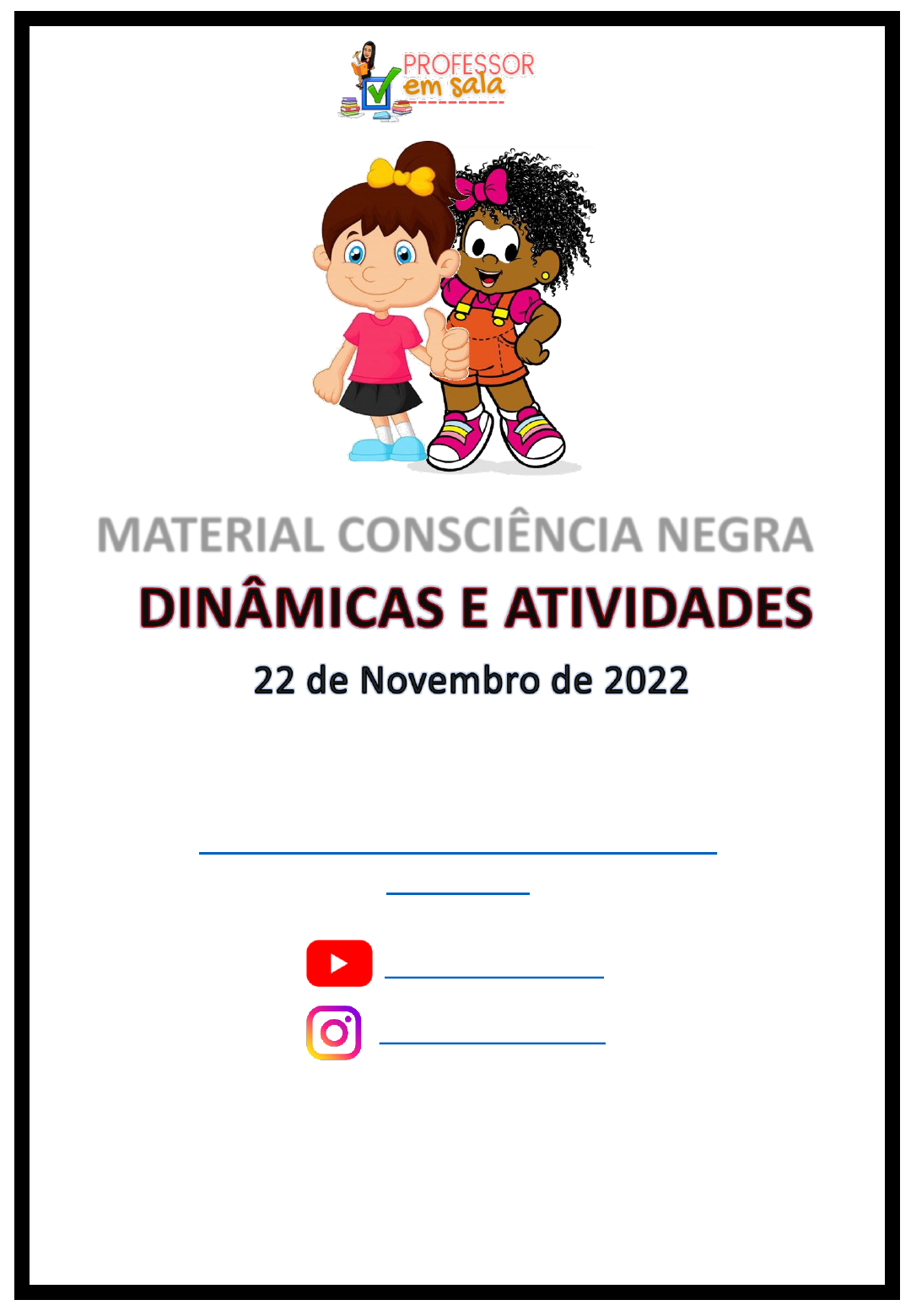 <p>LINK DO VÍDEO DE PASSO A PASSO:</p><p>Dia da Consciência Negra Dinâmicas e</p><p>Atividades</p><p>MATERIAL CONSCIÊNCIA NEGRA</p><p>Prof.ª Gesiane Meireles</p><p>Professor em Sala</p><p>@gesianemeireles</p><p>https://youtu.be/R43gb-4zOlI</p><p>https://www.youtube.com/channel/UChOI2P9UU1R60zQ-Yt-aazg</p><p>https://www.instagram.com/</p><p>Era uma vez um menino branco chamado</p><p>Miguel, que vivia numa terra de meninos</p><p>brancos e dizia:</p><p>É bom ser branco</p><p>Porque é branco o açúcar, tão doce,</p><p>Porque é branco o leite, tão saboroso,</p><p>Porque é branca a neve, tão linda.</p><p>Mas certo dia o menino partiu numa grande</p><p>viagem e chegou a uma terra onde todos os</p><p>meninos eram amarelos. Arranjou uma</p><p>amiga chamada Flor de Lótus, que, como</p><p>todos os meninos amarelos, dizia:</p><p>É bom ser amarelo</p><p>Porque é amarelo o Sol</p><p>E amarelo o girassol</p><p>Mais a areia da praia.</p><p>O menino branco meteu-se num barco para</p><p>continuar a sua viagem e parou numa terra</p><p>onde todos os meninos são pretos. Fez-se</p><p>amigo de um pequeno caçador chamado</p><p>Lumumba que, como os outros meninos</p><p>pretos, dizia:</p><p>É bom ser preto</p><p>Como a noite</p><p>Preto como as azeitonas</p><p>Preto como as estradas que nos levam para</p><p>Toda a parte.</p><p>O menino branco entrou depois num avião,</p><p>que só parou numa terra onde todos os</p><p>meninos são vermelhos.</p><p>Escolheu para brincar aos índios um</p><p>menino chamado Pena de Águia. E o</p><p>menino vermelho dizia:</p><p>É bom ser vermelho</p><p>Da cor das fogueiras</p><p>Da cor das cerejas</p><p>E da cor do sangue bem encarnado.</p><p>O menino branco foi correndo mundo até</p><p>uma terra onde todos os meninos são</p><p>castanhos. Aí fazia corridas de camelo com</p><p>um menino chamado Ali-Babá, que dizia:</p><p>É bom ser castanho</p><p>Como a terra do chão</p><p>Os troncos das árvores</p><p>São tão bom ser castanho como um</p><p>chocolate.</p><p>Quando o menino voltou à sua terra de</p><p>meninos brancos, dizia:</p><p>É bom ser branco como o açúcar</p><p>Amarelo como o Sol</p><p>Preto como as estradas</p><p>Vermelho como as fogueiras</p><p>Castanho da cor do chocolate.</p><p>Enquanto, na escola, os meninos brancos</p><p>pintavam em folhas brancas desenhos de</p><p>meninos brancos, ele fazia grandes rodas</p><p>com meninos sorridentes de todas as</p><p>cores.</p><p>(Luísa Ducla Soares)</p><p>MENINOS DE TODAS AS CORES</p><p>sddd</p><p>________________</p><p>Não deixe que a cor</p><p>da pele impeça de</p><p>enxergar quem somos.</p><p>Eu quero um mundo</p><p>cheio de:</p><p>sddd</p><p>________________</p><p>Eu quero um mundo</p><p>cheio de:</p><p>sd</p><p>d</p><p>d</p><p>__</p><p>__</p><p>__</p><p>__</p><p>__</p><p>__</p><p>Eu</p><p>q</p><p>u</p><p>er</p><p>o</p><p>u</p><p>m</p><p>m</p><p>u</p><p>n</p><p>d</p><p>o</p><p>c</p><p>h</p><p>ei</p><p>o</p><p>d</p><p>e:</p><p>R</p><p>es</p><p>p</p><p>ei</p><p>to</p><p>n</p><p>ão</p><p>te</p><p>m</p><p>c</p><p>o</p><p>r</p><p>te</p><p>m</p><p>co</p><p>n</p><p>sc</p><p>iê</p><p>n</p><p>ci</p><p>a</p><p>A cor da pele não</p><p>define a alma de</p><p>um ser humano</p><p>________________</p><p>Meu cabelo não é</p><p>ruim, ruim é seu</p><p>racismo</p><p>Eu quero um mundo</p><p>cheio de:</p><p>sddd</p><p>________________</p><p>A cor da pele pode</p><p>variar, mas o sangue</p><p>que corre nas veias é</p><p>vermelho</p><p>Eu quero um mundo</p><p>cheio de:</p><p>sddd</p><p>________________</p><p>Eu quero um mundo</p><p>cheio de:</p><p>sd</p><p>d</p><p>d</p><p>__</p><p>__</p><p>__</p><p>__</p><p>__</p><p>__</p><p>Eu</p><p>q</p><p>u</p><p>er</p><p>o</p><p>u</p><p>m</p><p>m</p><p>u</p><p>n</p><p>d</p><p>o</p><p>c</p><p>h</p><p>ei</p><p>o</p><p>d</p><p>e:</p><p>O preconceito não</p><p>está na cor da pele</p><p>e sim nos olhos</p><p>________________</p><p>A diferença nos</p><p>enriquece o respeito</p><p>nos une.</p><p>Eu quero um mundo</p><p>cheio de:</p><p>Po</p><p>r</p><p>d</p><p>en</p><p>tr</p><p>o,</p><p>to</p><p>d</p><p>o</p><p>s</p><p>so</p><p>m</p><p>o</p><p>s</p><p>d</p><p>a</p><p>m</p><p>es</p><p>m</p><p>a</p><p>co</p><p>r!</p><p>sddd</p><p>________________</p><p>A cor da pele de nada</p><p>importa, a maldade é</p><p>que muda tudo.</p><p>Eu quero um mundo</p><p>cheio de:</p><p>sddd</p><p>________________</p><p>Eu quero um mundo</p><p>cheio de:</p><p>sd</p><p>d</p><p>d</p><p>_</p><p>_</p><p>_</p><p>_</p><p>_</p><p>_</p><p>_</p><p>_</p><p>_</p><p>_</p><p>_</p><p>_</p><p>Eu</p><p>q</p><p>u</p><p>er</p><p>o</p><p>u</p><p>m</p><p>m</p><p>u</p><p>n</p><p>d</p><p>o</p><p>c</p><p>h</p><p>ei</p><p>o</p><p>d</p><p>e:</p><p>A</p><p>p</p><p>re</p><p>n</p><p>d</p><p>am</p><p>a</p><p>v</p><p>iv</p><p>er</p><p>co</p><p>m</p><p>a</p><p>d</p><p>ife</p><p>re</p><p>n</p><p>ça</p><p>,</p><p>is</p><p>so</p><p>s</p><p>im</p><p>é</p><p>s</p><p>er</p><p>h</p><p>u</p><p>m</p><p>an</p><p>o</p><p>O amor não pode</p><p>ser definido pela</p><p>cor da pele.</p><p>________________</p><p>Quem tem preconceito</p><p>não enxerga a beleza</p><p>do negro</p><p>Eu quero um mundo</p><p>cheio de:</p><p>Nós merecemosmaisrespeito</p><p>__________________</p><p>Eu quero um mundo</p><p>cheio de:</p><p>________________</p><p>Eu quero um mundo</p><p>cheio de:</p><p>Amo minha pele negra</p><p>________________</p><p>Eu quero um mundo cheio</p><p>de:________________</p><p>Eu quero um mundo cheio</p><p>de:</p><p>__________________</p><p>Eu quero um mundo cheio</p><p>de:</p><p>__________________</p><p>Eu quero um mundo cheio de:</p><p>Lutecontraoracismo!</p><p>________________</p><p>Eu quero um mundo cheio</p><p>de:</p><p>________________</p><p>Eu quero um mundo cheio</p><p>de:</p><p>Tenho orgulho da</p><p>minha cor</p><p>Devemos amare</p><p>respeitar a todossem</p><p>distinçãodecor.</p><p>Racismo aqui Jamais</p><p>Sou apaixonada pela</p><p>minha raça</p>