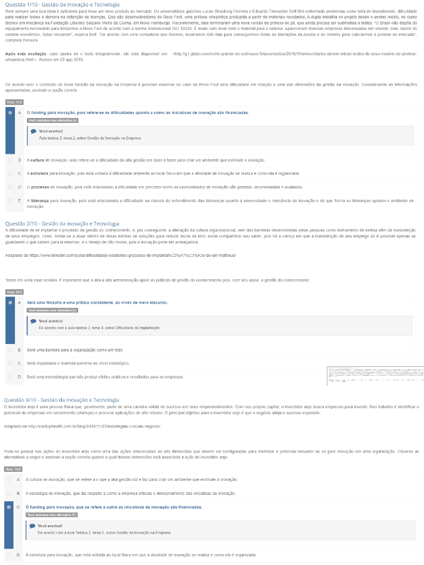 <p>Questão 1/10 Gestão da Inovação e Tecnologia Nem sempre uma boa ideia é suficiente para levar um novo produto ao Os universitários Lucas Strasburg Ferreira e Eduardo Trierweiler Boff têm enfrentado problemas como falta de dificuldade para realizar testes e demora na obtenção de Eles são desenvolvedores do Revo uma prótese ortopédica produzida partir de materiais reciclados. A dupla trabalha no projeto desde ensino médio, no curso técnico em mecânica da Fundação Liberato Salzano Vieira da em Novo eles terminaram uma nova versão da prótese de que ainda precisa ser submetida "O Brasil não dispõe do equipamento necessário para testarmos Revo Foot de acordo com norma internacional ISO É muito caro levar todo material para Apareceram diversas empresas interessadas em investir, mas, diante do cenário todas recuaram", explica Boff. "De acordo com uma consultoria que fizemos, levariamos 690 dias para conseguirmos todas as liberações da Anvisa e do Inmetro para colocarmos a no mercado". completa Após esta caso queira ler texto integralmente, ele está disponível em: <http://g1 ortopedica html Acesso em 23 ago De acordo com o conteúdo do tema Gestão da Inovação na Empresa é possível observar no caso da Revo Foot uma dificuldade em relação uma das dimensões da gestão da Considerando as informações apresentadas, assinale opção Nota A O funding para inovação, pois refere-se as dificuldades quanto como as iniciativas de inovação são financiadas. Você acertou! Aula tema sobre Gestão da Inovação na Empresa B A cultura de pois refere- se a dificuldade da alta gestão em dizer fazer para criar um ambiente que estimule a C A estrutura para pois está voltada à dificuldade referente ao local em que a atividade de inovação se realiza como ela é organizada D processo de pois está relacionado a dificuldade em perceber como as oportunidades de inovação são geradas, desenvolvidas e avaliadas E A liderança para pois está relacionada a dificuldade na clareza do entendimento das lideranças quanto à necessidade e relevância da inovação e de que forma as lideranças apoiam ambiente de inovação. Questão 2/10 Gestão da Inovação e Tecnologia A dificuldade de se implantar processo de gestão do por a alteração da cultura organizacional, vem das barreiras desenvolvidas pelas pessoas como instrumento de defesa afim da manutenção de seus empregos, como: limitar-se a atuar dentro de faixas estritas de soluções para reduzir riscos de erro; evitar compartilhar seu saber, pois crença em que a manutenção de seu emprego só é possível apenas se guardarem que sabem para si mesmas; desejo de não pois a inovação pode ser ameaçadora. Adaptado de Tendo em vista esse é importante que alta a alta administração apoie as de gestão do conhecimento pois, com seu apoio, a gestão do conhecimento: A Será uma filosofia uma prática consistente, ao invés de mero discurso. Você acertou! De acordo com aula teorica tema 4. sobre Dificuldade de Implantação B Será uma barreira para organização como um todo C Será implantada e mantida somente no nível D Será uma metodologia que não produz efeitos práticos e resultados para as empresas. Questão 3/10 Gestão da Inovação e Tecnologia investidor anjo é uma pessoa fisica que, geralmente, parte de uma carreira sólida de sucesso em seus Com seu próprio capital, investidor anjo busca empresas para Seu trabalho é identificar potencial de empresas em crescimento (startups) e procurar aplicações de alto principal objetivo para investidor anjo que negócio atinja sucesso esperado. Adaptado de Pode pensar nas ações do investidor anjo como uma das ações relacionadas às oito dimensões que devem ser configuradas para melhorar potencial inovador ao se gerir inovação em uma organização. Observe as alternativas a seguir e assinale a opção correta quanto qual dessas dimensões está associada a ação do investidor anjo: Nota 10.0 A A cultura de que se refere que a alta gestão diz faz para criar um ambiente que estimule a inovação. B A estratégia de que diz respeito a como a empresa articula direcionamento das iniciativas de C funding para inovação, que se refere a como as iniciativas de inovação são financiadas. Você acertou! De acordo com Aula 2 tema 2. sobre Gestão de Inovação na Empresa D A estrutura para que está voltada ao local em que a atividade de inovação se realiza como ela é organizada.</p><p>Questão 4/10 Gestão da Inovação e Tecnologia Organizar, interpretar e direcionar estrategicamente todo know-how de uma empresa exige uma série de e Para facilitar essas tarefas, as soluções da tecnologia da informação (TI) têm sido importantes aliadas da gestão do conhecimento, oferecendo sistemas de gerenciamento do conhecimento, ferramentas indispensáveis em qualquer negócio. Esses softwares são capazes de identificar, criar, apresentar distribuir conhecimento dentro do contexto Em outras todas as informações produzidas nos diferentes setores são avaliadas estruturadas para atender às estratégias vinculadas aos objetivos do empreendimento. Como observa -se a melhora na performance o desenvolvimento de vantagens competitivas, a inovação estímulo a uma cultura A finalidade é criar um canal pelo qual conhecimento, considerado um possa Após esta caso queira ler texto ele está disponível em: https o texto comprova que muitos autores afirmam sobre a gestão do conhecimento Assinale opção correta quanto essa situação informada por esses autores Nota 10.0 A Muitos autores consideram que gestão do conhecimento se tornou possível a partir do uso de groupware B Muitos autores consideram que gestão do conhecimento se tornou possível partir da inserção de dados nas empresas. C Muitos autores consideram que gestão do conhecimento se tornou possível partir da disseminação de documentos impressos dentro da empresa. D Muitos autores consideram que gestã