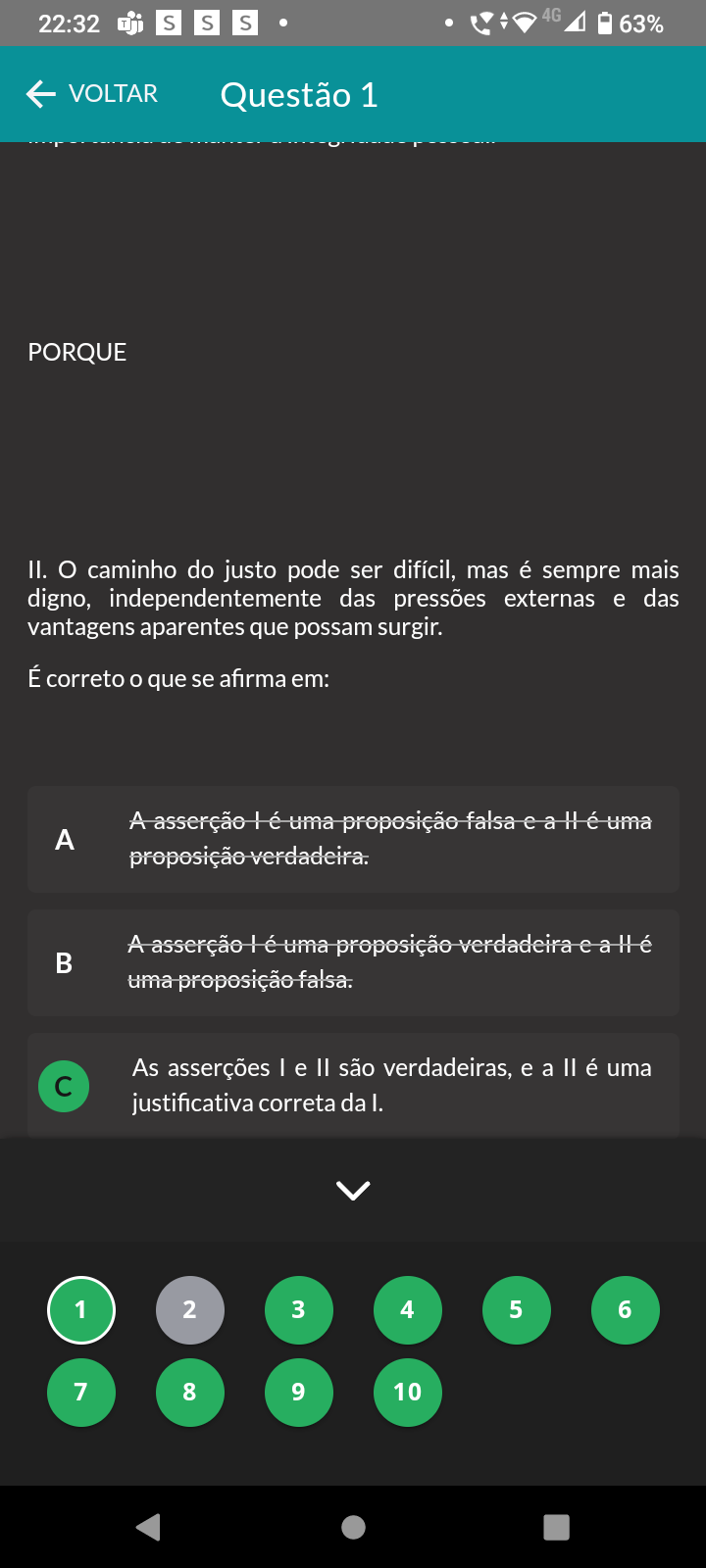 <p>22:32 S S S 4G 63% VOLTAR Questão 1 PORQUE II. O caminho do justo pode ser difícil, mas é sempre mais digno, independentemente das pressões externas e das vantagens aparentes que possam surgir. É correto que se afirma em: A asserção lé uma proposição falsa A proposição verdadeira. A asserção uma proposição verdadeira e a uma proposição falsa. As asserções I e II são verdadeiras, e a II é uma C justificativa correta da I. V 1 2 3 4 5 6 7 8 9 10</p>