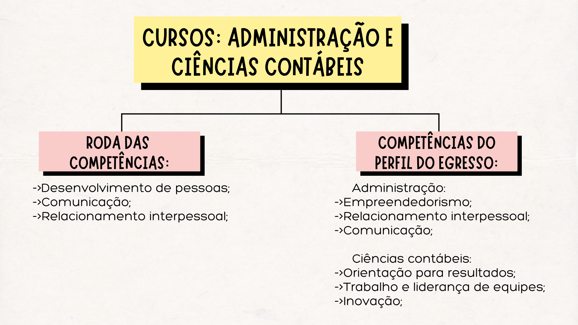 <p>CURSOS: ADMINISTRAÇÃO E CIÊNCIAS CONTÁREIS RODA DAS COMPETÊNCIAS DO PERFIL DO EGRESSO: Desenvolvimento de pessoas; Administração: -> Empreendedorismo; interpessoal; -> Relacionamento interpessoal; -> Ciências contábeis: -> Orientação para resultados; -> Trabalho e liderança de equipes; -> Inovação;</p>