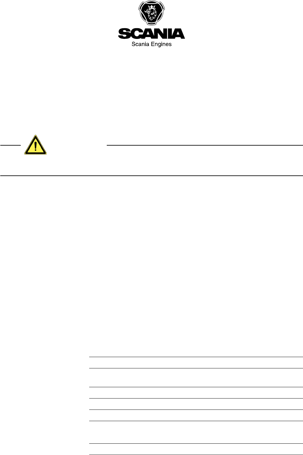 <p>Manual de instruções</p><p>D13</p><p>PDE</p><p>Informação importante</p><p>Sério risco de ferimento</p><p>Quando está trabalhando no motor, por exemplo, fazendo ajuste nas correias de transmissão, trocando o óleo</p><p>ou ajustando a embreagem, é importante não dar partida no motor. O motor poderá ser danificado, mas aci-</p><p>ma de tudo, existe um sério risco de ocorrer ferimentos.</p><p>Por esse motivo, sempre bloqueie o dispositivo de partida ou desconecte o cabo da bateria antes de trabalhar</p><p>no motor. Isso é especialmente importante quando o motor conta com uma partida remota ou automática.</p><p>ADVERTÊNCIA!</p><p>Este símbolo de advertência e texto podem ser encontrados ao lado daqueles pontos de inspeção onde é es-</p><p>pecialmente importante ficar alerta para riscos de ferimentos.</p><p>Motor industrial</p><p>pt-BR 2006931</p><p>Edição 1.0</p><p>Relatório de comissionamento - Garantia</p><p>Quando você preencher o relatório de comissionamento e enviá-lo para a Scania, terá direito à garantia de</p><p>um ano a partir da data do comissionamento. Preencha também as informações específicas abaixo para fa-</p><p>cilitar as coisas, caso precise entrar em contato com uma oficina, por exemplo.</p><p>O tipo de motor e a variante são indicados na placa de identificação do motor</p><p>Número de série do motor</p><p>Data de início da garantia</p><p>Nome e endereço do proprie-</p><p>tário</p><p>Assinatura</p><p>Tipo de motor</p><p>Variante</p><p>Prefácio</p><p>Este Manual de instruções contém a descrição de operação e ma-</p><p>nutenção dos motores industriais Scania.</p><p>Os motores são do tipo diesel com turbocompressor, quatro cur-</p><p>sos, injeção direta e arrefecidos por líquido. Certos motores tam-</p><p>bém são equipados com o SCR para controle de emissões.</p><p>Os motores estão disponíveis em diferentes configurações de po-</p><p>tência e rotação. A configuração normal de potência do motor</p><p>(código de desempenho) é indicada na placa de identificação.</p><p>Nota:</p><p>Somente os componentes padrão são descritos no Manual de ins-</p><p>truções. Informações sobre equipamento especial estão disponí-</p><p>veis nas instruções de vários fabricantes.</p><p>Para assegurar o máximo de desempenho e maior vida útil do mo-</p><p>tor, lembre-se do seguinte:</p><p>• Leia o Manual de instruções antes de começar a usar o motor.</p><p>Até mesmo usuários frequentes de motores Scania obterão no-</p><p>vas informações no Manual de instruções.</p><p>• Sempre siga as instruções de manutenção.</p><p>• Leia atentamente a seção sobre segurança.</p><p>• Familiarize-se com o motor, assim você saberá o que ele faz e</p><p>como funciona.</p><p>• Sempre contate uma oficina autorizada da Scania.</p><p>As informações contidas neste manual estavam corretas no mo-</p><p>mento da impressão. Scania reserva-se o direito de fazer altera-</p><p>ções sem aviso prévio.</p><p>Nota:</p><p>Sempre use peças de reposição Scania para serviço e reparo.</p><p>2</p><p>© Scania CV AB 2010, Sweden</p><p>Prefácio . . . . . . . . . . . . . . . . . . . . . . . . . . . . . . . . 2</p><p>Ambiente e segurança . . . . . . . . . . . . . . . . . . . . 4</p><p>Responsabilidade ambiental . . . . . . . . . . . . . . 4</p><p>Segurança . . . . . . . . . . . . . . . . . . . . . . . . . . . . 4</p><p>Advertências e notas . . . . . . . . . . . . . . . . . . . . 6</p><p>Certificação . . . . . . . . . . . . . . . . . . . . . . . . . . 15</p><p>Designações de tipo . . . . . . . . . . . . . . . . . . . . . 16</p><p>Unidade de comando do motor . . . . . . . . . . . 18</p><p>Diagnóstico de falhas com códigos de piscadas</p><p>para a unidade de comando do motor e coordena-</p><p>dor do EMS . . . . . . . . . . . . . . . . . . . . . . . . . . 18</p><p>Leitura dos códigos de falha usando o painel de</p><p>instrumentos Scania . . . . . . . . . . . . . . . . . . . 19</p><p>Exclusão de códigos de falha . . . . . . . . . . . . 19</p><p>Códigos de piscadas para a unidade de comando</p><p>do motor . . . . . . . . . . . . . . . . . . . . . . . . . . . . 20</p><p>Códigos de piscadas para o coordenador . . . 22</p><p>Partida e funcionamento . . . . . . . . . . . . . . . . . 23</p><p>Verificações antes de colocar o motor em fun-</p><p>cionamento . . . . . . . . . . . . . . . . . . . . . . . . . . 23</p><p>Partida do motor . . . . . . . . . . . . . . . . . . . . . . 24</p><p>Em funcionamento . . . . . . . . . . . . . . . . . . . . 25</p><p>Desligamento do motor . . . . . . . . . . . . . . . . . 28</p><p>Verificações após o funcionamento . . . . . . . 29</p><p>Manutenção . . . . . . . . . . . . . . . . . . . . . . . . . . . 30</p><p>Motores com poucas horas de operação . . . . 31</p><p>Intervalo de manutenção . . . . . . . . . . . . . . . . 32</p><p>Sistema de lubrificação . . . . . . . . . . . . . . . . . . 34</p><p>Qualidade do óleo . . . . . . . . . . . . . . . . . . . . . 34</p><p>Análise do óleo . . . . . . . . . . . . . . . . . . . . . . . 35</p><p>Verificação do nível de óleo . . . . . . . . . . . . . 35</p><p>Troca do óleo . . . . . . . . . . . . . . . . . . . . . . . . 36</p><p>Limpeza do filtro de óleo centrífugo. . . . . . . 37</p><p>Substituição do filtro de óleo . . . . . . . . . . . . 40</p><p>Sistema de arrefecimento . . . . . . . . . . . . . . . . 41</p><p>Líquido de arrefecimento . . . . . . . . . . . . . . . 41</p><p>Verificação do nível de líquido de arrefecimento</p><p>44</p><p>Verificação do nível de anticongelante . . . . . 45</p><p>Troca de líquido de arrefecimento . . . . . . . . 47</p><p>Limpeza do sistema de arrefecimento. . . . . . 49</p><p>Purificador de ar . . . . . . . . . . . . . . . . . . . . . . . 51</p><p>Leitura do vacuômetro . . . . . . . . . . . . . . . . . 51</p><p>Limpeza ou troca do elemento do filtro . . . . 51</p><p>Substituição do cartuc