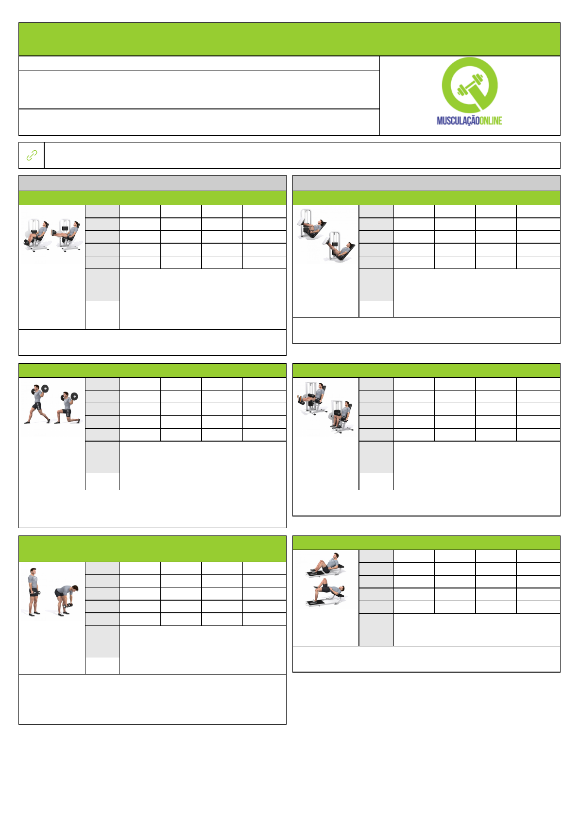/ Plano de treino TMO - TREINO DE HIPERTROFIA FEMININO AVANÇADO - 1 - SÉRIE A Meta Ganhe Músculo Data de início Hora 1 Data de término da fatura Instruções TMO - HFM5 TREINO DE HIPERTROFIA MIOFIBRILAR E METABÓLICA Activities marked with this sign and with the same number, belong together as a Superset or Circuit. Ask your coach for further explanation in case of any questions. Exercícios Data / / / / 1. Extensão de Perna Sentado Quadríceps Set 1 48 s kg Set 2 48 s kg Set 3 48 s kg Set 4 Set 5 ObservaçãoNota o trainador: Esse exercício é por tempo, faça a 1º série para aquecer! As demais com a carga pesada por 48seg. (ISSO VAI DOER). Ajuste o equipamento às suas medidas. Ajuste o peso. Sente-se na plataforma. Estique ambas as pernas. Exercícios Data / / / / 2. Leg Press 45º Quadríceps, Glúteos Set 1 4 x kg Set 2 4 x kg Set 3 4 x kg Set 4 4 x kg Set 5 ObservaçãoNota o trainador: Faça com a carga progressiva para chegar no seu máximo nas 2 últimas séries!. Ajuste o equipamento às suas medidas. Ajuste o peso. Coloque os pés à largura das ancas. Dobre os joelhos. Estique ambas as pernas. 3. Split squat, left - Barbell Quadríceps, Glúteos Set 1 10 x kg Set 2 8 x kg Set 3 6 x kg Set 4 4 x kg Set 5 ObservaçãoNota o trainador: Faça com a carga progressiva para chegar no seu máximo nas 2 últimas séries!. Coloque os pés em posição de agachamento dividido. Agarre na barra. Barra no pescoço. Mantenha as costas em uma posição neutra. Mova o joelho posterior na direção do chão. 4. Flexão de Perna Sentado Músculos isquiotibiais Set 1 10 x kg Set 2 8 x kg Set 3 6 x kg Set 4 4 x kg Set 5 ObservaçãoNota o trainador: Faça com a carga progressiva para chegar no seu máximo nas 2 últimas séries!. Ajuste o equipamento às suas medidas. Ajuste o peso. Sente-se na plataforma. Dobre as pernas. 5. Deadlift, stiffed legs - DBs Glúteos, Lombar, Músculos isquiotibiais Set 1 10 x kg Set 2 10 x kg Set 3 10 x kg Set 4 Set 5 ObservaçãoNota o trainador: Faça com a carga progressiva para chegar no seu máximo na última série!. Coloque os pés a uma distância superior à largura das ancas. Mantenha o haltere em frente às tíbias. Descontraia os glúteos. Mantenha os joelhos ligeiramente dobrados. Mantenha as costas em uma posição neutra. Estique os joelhos, ancas e costas. 6. Hip thrust one leg, right Glúteos Set 1 12 x kg Set 2 15 x kg Set 3 20 x kg Set 4 Set 5 Observação Coloque os ombros na plataforma. Levante uma perna. Coloque as mãos por trás da cabeça. Levante as ancas. / Plano de treino TMO - TREINO DE HIPERTROFIA FEMININO AVANÇADO - 2 - SÉRIE B Meta Ganhe Músculo Data de início Hora 1 Data de término da fatura Instruções TMO - HFM5 TREINO DE HIPERTROFIA MIOFIBRILAR E METABÓLICA Activities marked with this sign and with the same number, belong together as a Superset or Circuit. Ask your coach for further explanation in case of any questions. Exercícios Data / / / / 1. Panturrilha no Aparelho Panturrilha Set 1 12 x kg Set 2 12 x kg Set 3 12 x kg Set 4 12 x kg Set 5 ObservaçãoNota o trainador: Faça 2seg de isometria no �nal de cada rep. Ajuste o equipamento às suas medidas. Ajuste o peso. Coloque os dedos dos pés na plataforma. Apoie-se nos dedos dos pés. Exercícios Data / / / / 2. Calf raise incline leg press machine Panturrilha Set 1 20 s kg Set 2 20 s kg Set 3 20 s kg Set 4 20 s kg Set 5 ObservaçãoNota o trainador: Faça 10 rep com os pés || e 10 com os pés \/. Ajuste o equipamento às suas medidas. Ajuste o peso. Sente-se contra o banco inclinado a aproximadamente 45 graus. Coloque os pés contra a plataforma. Suporte seu peso nos dedos dos pés. 3. Pulley Frente Grande dorsal Set 1 12 x kg Set 2 10 x kg Set 3 8 x kg Set 4 Set 5 Observação Sente-se na plataforma. Mantenha as costas em uma posição neutra. Coloque as mãos na barra distantes uma da outra. Puxe os braços para baixo. Baixe a barra até ao peito. 4. Supino - inclinado, Barra Musculatura torácica superior Set 1 12 x kg Set 2 12 x kg Set 3 12 x kg Set 4 Set 5 Observação Coloque-se de costas no banco inclinado (20 a 45 graus). Agarre na barra. Coloque as mãos à largura dos ombros. Baixe a barra até ao peito. 5. Remada Articulada Horizontal no Aparelho Parte superior das costas Set 1 10 x kg Set 2 12 x kg Set 3 15 x kg Set 4 Set 5 Observação Ajuste o equipamento às suas medidas. Ajuste o peso. Agarre nas pegas. Puxe os braços para trás. 6. Supino - pegada neutra, Halter Peito Set 1 12 x kg Set 2 15 x kg Set 3 20 x kg Set 4 Set 5 Observação 1 Coloque-se de costas no banco horizontal. Segure os halteres. Coloque as mãos à largura dos ombros. Palmas das mãos viradas para dentro. Baixe as mãos até à altura do peito. / 7. Crunch weight behind head - Plate Abdominais - Abdominais lisos Set 1 20 x kg Set 2 20 x kg Set 3 20 x kg Set 4 Set 5 Observação 1 Agarre na placa. Coloque-se de costas no chão. Puxe os joelhos. Hold the plate behind your head. Mova o tronco para a frente. 8. Side raise seated - DBs Ombros Set 1 12 x kg Set 2 15 x kg Set 3 20 x kg Set 4 Set 5 Observação 2 Sente-se na plataforma. Mantenha as costas em uma posição neutra. Segure os halteres. Mantenha os braços ligeiramente dobrados. Levante os braços para os lados. Mãos à altura dos ombros. 9. Triceps Puxador com Cabo Tríceps Set 1 6 x kg Set 2 6 x kg Set 3 6 x kg Set 4 Set 5 Observação 2 Coloque os pés em posição de passada. Mantenha as costas em uma posição neutra. Agarre a barra da polia. Mova o tronco ligeiramente para a frente. Mantenha os ombros em uma posição �xa. Estique o cotovelo. 10. Rosca martelo, Halter Bíceps Set 1 6 x kg Set 2 6 x kg Set 3 6 x kg Set 4 Set 5 Observação 3 Coloque os pés em posição de passada. Mantenha as costas em uma posição neutra. Segure o haltere. Palmas das mãos viradas para fora. Mantenha um ombro em uma posição �xa. Dobre um cotovelo. Alterne entre os braços. 11. Side plank elbow foot time, right Oblíquo