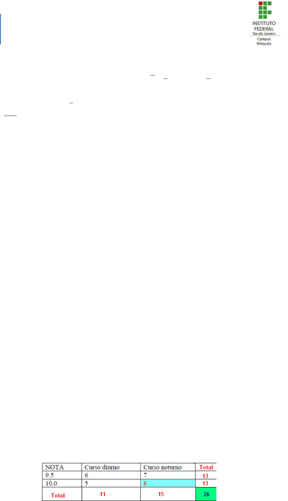 <p>Unidade V: Probabilidade</p><p>Professora: Aline Farves</p><p>Período: 4°</p><p>Lista de Exercícios Probabilidade</p><p>1) Em determinado experimento constatou-se que e , onde A e B são mutuamente exclusivos. De acordo com essas informações, calcule:</p><p>a) b) c) d) e)</p><p>2) Numa urna existem bolas de plástico, todas de mesmo tamanho e peso, numeradas de 2 a 21 sem repetição. A probabilidade de se sortear um número primo ao pegarmos uma única bola, aleatoriamente, é de: a) 45% b) 40% c) 35% d) 30% e) 25%</p><p>3) Uma urna contém 20 boas numeradas de 1 a 20. Seja o experimento: retirada de uma bola. Considere os eventos: A = {a bola retirada ser múltiplo de 2} ; B= { a bola retirada ser múltiplo de 5}. Então a probabilidade de se ocorrer o evento A ou B é: a) 13/20 b) 4/5 c) 7/10 d) 3/5 e) 11/20</p><p>4) A probabilidade de você ganhar uma bicicleta numa rifa de 100 números na qual você comprou quatro números é: a) 2/5 b) 1/10 c) 1/25 d) 1/30 e) 1/50</p><p>5) Em uma pesquisa realizada em uma faculdade foram feitas duas perguntas aos alunos. 120 responderam sim a ambas; 300 responderam sim à primeira; 250 responderam sim à segunda e 200 responderam não a ambas. Se um aluno for escolhido ao acaso, qual é a probabilidade de ele ter respondido “não” à primeira pergunta?</p><p>a) 1/7 b) 1/2 c) 3/8 d) 11/21 e) 4/25</p><p>7) Um soldado tenta desativar um certo artefato explosivo que possui 5 fios expostos. Para desativá-lo, o soldado precisa cortar 2 fios específicos, um de cada vez, em uma determinada ordem. Se cortar o fio errado ou na ordem errada, o artefato explodirá. Se o soldado escolher aleatoriamente 2 fios para cortar, numa determinada ordem, a probabilidade do artefato não explodir ao cortá-los é igual a :</p><p>a) 2/25 b) 1/20 c) 2/5 d) 1/10 e) 9/20</p><p>8) Um lote com 20 peças contém 2 defeituosas. Sorteando-se 3 peças deste lote, sem reposição, a probabilidade de que todas sejam não defeituosas é:</p><p>a) 68/95 b) 70/95 c) 72/95 d) 74/95 e) 76/95</p><p>9) Uma turma tem 25 alunos dos quais 40% são mulheres. Escolhendo-se ao acaso, um dentre todos os grupos de 2 alunos que se pode formar com os alunos dessa turma, a probabilidade de que seja composto por uma menina e um menino é:</p><p>a) 1/6 b) 1/5 c) 1/4 d) 1/3 e) 1/2</p><p>10) O grupo de pretendentes aos cargos de presidente e vice-presidente de um clube é constituído por 6 advogados e 2 engenheiros, todos eles com chances iguais de serem escolhidos para uma dessas funções. Nessas condições, a probabilidade de que certo eleitor escolherá um advogado para presidente e um engenheiro para vice-presidente é:</p><p>a) 1/8 b) 2/9 c) 3/14 d) 5/16 e) 6/16</p><p>11) Os alunos do curso diurno e curso noturno de uma faculdade se submeteram a uma prova de seleção, visando à participação numa olimpíada internacional. Dentre os que tiraram nota 9.5 ou 10.0, será escolhido um aluno por sorteio.</p><p>Com base nessa tabela, a probabilidade de que o aluno sorteado tenha tirado nota 10.0 e seja do curso noturno é: a) 12/26 b) 6/14 c) 4/13 d) 12/52 e) 1/6</p><p>12) Um casal pretende ter 3 filhos. Qual a probabilidade de que os 3 filhos sejam do mesmo sexo? a) 1/8 b) 1/6 c) 1/3 d) 1/4 e) 2/3</p><p>13) Contra certa doença podem ser aplicadas as vacinas I ou II. A vacina I falha em 10% dos casos e a vacina II em 20% dos casos, sendo esses eventos totalmente independentes. Nessas condições, se todos os habitantes de uma cidade receberem doses adequadas das duas vacinas, a probabilidade de um indivíduo não estar imunizado contra a doença é:</p><p>a) 30% b) 10% c) 3% d) 2% e) 1%</p><p>14) Uma urna contém 10 bolas das quais 6 são brancas e 4 verdes. Fazem-se 2 extrações sucessivas sem reposição.</p><p>a) Qual a probabilidade de sair bola verde na segunda extração sabendo que na 1ª extração saiu bola branca?</p><p>b) Qual a probabilidade de sair bola branca na 1ª extração e bola verde na segunda?</p><p>c) Qual a probabilidade de sair bola verde na 2ª extração?</p><p>d) Qual a probabilidade de sair bola branca na 1ª extração?</p><p>15) (ENEM) O número de frutos de uma determinada espécie de planta se distribui de acordo com as probabilidades apresentadas no quadro. A probabilidade de que, em tal planta, existam, pelo menos, dois frutos é igual a: a) 3% b) 7% c) 13% d) 16% e) 20%</p><p>16). (UNIRIO) As probabilidades de três jogadores marcarem um gol cobrando um pênalti são, respectivamente, , e . Se cada um bater um único pênalti, a probabilidade de todos errarem é igual a: a) 3% b) 5% c) 17% d) 20% e) 25%</p><p>17) As probabilidades de três jogadores acertarem um pênalti são respectivamente , e . Se cada um chutar uma única vez, qual a probabilidade de:</p><p>a) Todos acertem b) Só um acerte c) Todos errarem</p><p>18) Uma urna contém 5 bolas vermelhas e 3 brancas. Uma bola é selecionada aleatoriamente da urna e abandonada, e duas de cores diferentes destas são colocadas na urna. Uma segunda bola é então selecionada da urna. Encontre a probabilidade de que:</p><p>a) a segunda bola seja vermelha</p><p>b) ambas as bolas sejam da mesma cor.</p><p>c) Se a segunda bola é vermelha, qual é a probabilidade de que a primeira bola seja vermelha.</p><p>d) Se ambas são da mesma cor, qual é a probabilidade de que sejam brancas.</p><p>19) De uma urna contendo quatro bolas verdes e duas amarelas serão extraídas sucessivamente, sem reposição, duas bolas.</p><p>a) Se a primeira bola sorteada for amarela, qual a probabilidade de a segunda ser também amarela?</p><p>b) Qual a probabilidade de ambas as bolas sorteadas serem amarelas?</p><p>c) Qual a probabilidade de ambas as bolas sorteadas serem verdes?</p><p>d) Qual a probabilidade de a primeira bola sorteada ser verde e a segunda amarela?</p><p>e) Qual a probabilidade de ser uma bola de cada cor?</p><p>20) Das 180 pessoas que trabalham em uma empresa, sabe-se que 40% têm nível universitário e 60% s