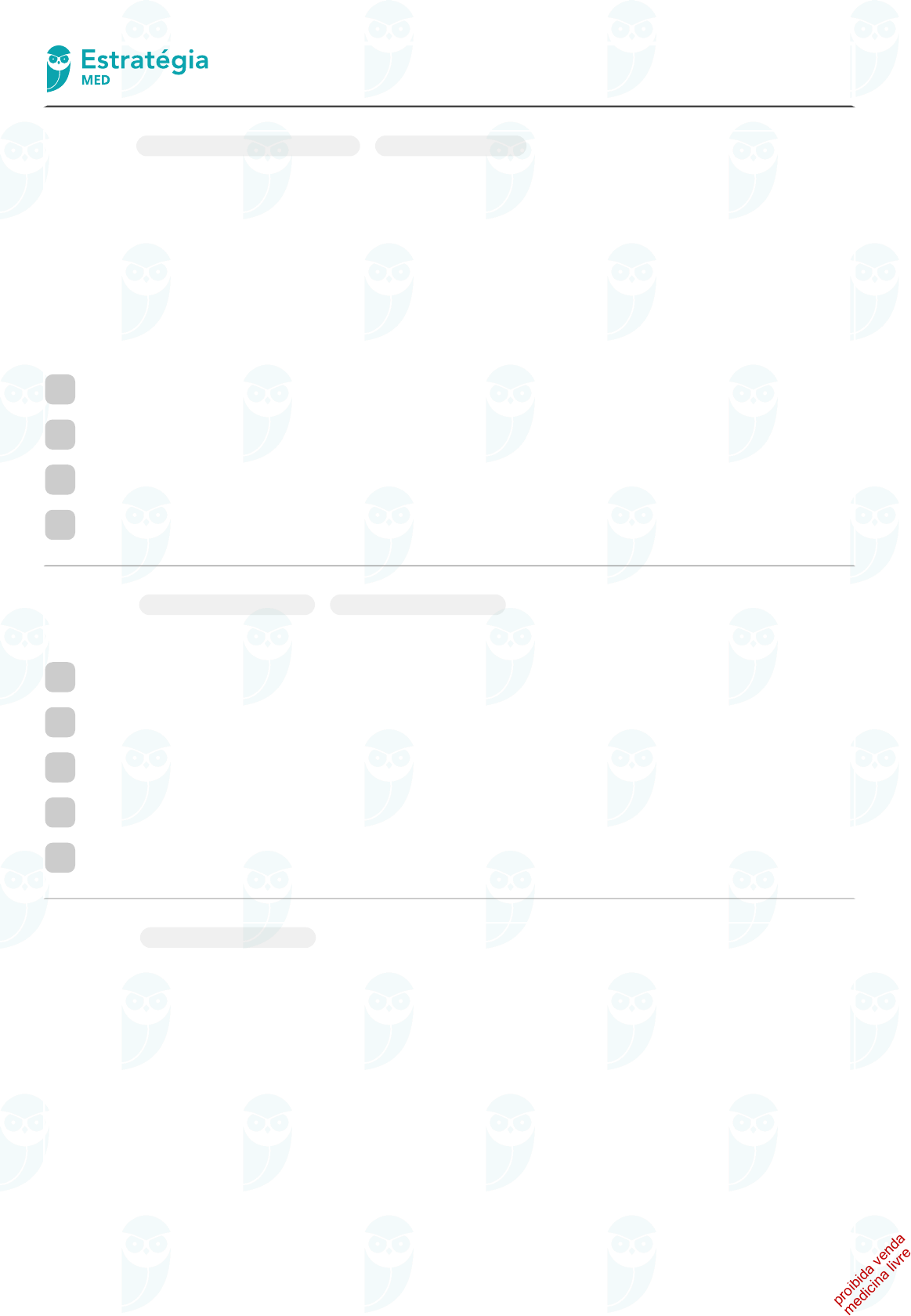 <p>Transtornos do Humor</p><p>At.me/medicinalivre cessar</p><p>Lista</p><p>Questão 1 Transtorno do Humor Bipolar THB Transtornos do Humor</p><p>Um estudante de biologia de 24 anos de idade é trazido por sua mãe e seu irmão ao pronto-socorro. Nas últimas duas</p><p>semanas, o estudante tem ficado progressivamente mais agitado, inquieto, dormindo menos e falando rápido, às vezes difícil</p><p>de entender. Há dois dias começou a falar que descobriu a cura para a covid-19, tendo enviado várias mensagens</p><p>eletrônicas para diferentes jornais, instituições públicas e embaixadas. Diz agora que aguarda a ligação de ministros da saúde</p><p>de vários países para conversar sobre sua descoberta. Quando questionado pelo irmão sobre esses fatos, cou muito</p><p>irritado e tentou agredi-lo sicamente. A família diz que o paciente sempre foi estudioso, trabalhador, carinhoso com os pais</p><p>e é amigo do irmão. Aos 20 anos de idade, apresentou quadro depressivo e foi tratado com medicamento, cujo nome os</p><p>familiares não se recordam. Não há antecedentes familiares mórbidos relevantes. Qual é a principal hipótese diagnóstica?</p><p>A Transtorno Obsessivo Compulsivo.</p><p>B Esquizofrenia Hebefrênica.</p><p>C Transtorno Afetivo Bipolar.</p><p>D Transtorno de Personalidade.</p><p>4000188947</p><p>Questão 2 Diagnóstico da Depressão Tratamento da Depressão</p><p>Sobre Depressão marque a resposta ERRADA:</p><p>A Pode causar incapacidade.</p><p>B É um fator de risco reversível para Demência.</p><p>C Inibidores da receptação da serotonina é uma das classes de anti-depressivo mais utilizadas para tratar depressão.</p><p>D Sintomas cognitivos podem estar presentes na depressão.</p><p>E Clonazepan e lorazepan são as drogas de escolha para tratamento da depressão.</p><p>4000187074</p><p>Questão 3 Diagnóstico da Depressão</p><p>Paciente, 67 anos, sexo feminino, professora aposentada, é trazida primeira vez à consulta com MFC da Estratégia Saúde</p><p>da Família (ESF), desde que se mudou para morar com o lho após falecimento do marido. Refere fazer tratamento para</p><p>hipertensão (enalapril 20 mg ao dia) e osteoartrite (condroitina - glicosamina). Questionada sobre seu estado de humor, a</p><p>paciente refere que já não vê graça na vida, pois não faz sentido viver com tantas dores. Além de medicação para dor,</p><p>solicitou também para insônia. Mesmo bem acolhida pelo lho, a paciente referiu sentir-se sozinha. Mostrou-se emotiva e</p><p>esboçou choro, pausando a fala. Sobre a depressão nos idosos, assinale a afirmativa correta.</p><p>med</p><p>ici</p><p>na</p><p>liv</p><p>re</p><p>pro</p><p>ibi</p><p>da</p><p>ve</p><p>nd</p><p>a</p><p>https://med.estrategia.com/cadernos-e-simulados/cadernos/baa817f2-b161-443d-be9b-8a21421cd182</p><p>A A relação do médico da APS com o paciente não influencia o tratamento.</p><p>B Os tricíclicos têm maior eficácia no tratamento da depressão em idosos do que os inibidores de recaptação de</p><p>serotonina.</p><p>C É mais frequente nos homens e o terceiro fator mais associado ao suicídio no idoso.</p><p>D A Escala de Depressão Geriátrica (GDS) é um instrumento de triagem confiável e pode ser útil para a detecção</p><p>dos sintomas de depressão nos idosos.</p><p>4000186179</p><p>Questão 4 Transtorno do Humor Bipolar THB</p><p>Paciente masculino, 20 anos, estudante do 2º ano do curso de economia, é levado ao pronto-socorro psiquiátrico após</p><p>uma mudança de comportamento nos últimos sete dias.</p><p>De acordo com os familiares, começou a car progressivamente mais agitado, querendo fazer várias coisas ao mesmo</p><p>tempo; houve aumento na velocidade da fala, por vezes elaborando frases sem nexo; houve diminuição do sono; e estava</p><p>alimentando-se muito mal e em pouca quantidade.</p><p>Relatam também que, há uns quatro meses, o paciente cou muito triste com o falecimento da avó, pois eram muito</p><p>próximos. Chorou muito e, por semanas, não queria sair do quarto, tendo emagrecido 6 kg.</p><p>O paciente sempre teve boa saúde e é responsável, bom aluno e sociável. Não tem história prévia de transtorno mental.</p><p>Antecedentes familiares: mãe, 44 anos, teve depressão depois do nascimento do último lho – que durou mais de um ano,</p><p>mas “foi passando aos poucos, sem tratamento”; tio materno bebia bastante e cometeu suicídio aos 40 anos de idade.</p><p>Qual a hipótese diagnóstica provável para o caso descrito acima?</p><p>A Transtorno de personalidade borderline.</p><p>B Transtorno depressivo reativo.</p><p>C Transtorno bipolar.</p><p>D Intoxicação por estimulantes.</p><p>4000184106</p><p>Questão 5 Tratamento da Depressão Depressão</p><p>Valéria, 21 anos, desempregada, solteira, relata quadro de angústia e tristeza diária iniciado há 5 meses, após o falecimento</p><p>de seus pais devido à COVID-19. Refere falta de vontade para realizar suas atividades diárias, crises de choro, sono</p><p>excessivo, falta de perspectiva para o futuro. Relata que tem vontade de sumir, mas nega pensamentos de morte ou de</p><p>autoagressão. Apresenta rede de apoio fragilizada, já que seus familiares moram em outro estado. Nesse caso, a melhor</p><p>conduta é iniciar</p><p>med</p><p>ici</p><p>na</p><p>liv</p><p>re</p><p>pro</p><p>ibi</p><p>da</p><p>ve</p><p>nd</p><p>a</p><p>A fluoxetina 20 mg e encaminhar para o psicólogo.</p><p>B lítio 300 mg, duas vezes ao dia, e encaminhar para o CAPS.</p><p>C amitriptilina 25 mg e encaminhar para o psiquiatra.</p><p>D práticas integrativas e complementares.</p><p>4000183931</p><p>Questão 6 Transtorno do Humor Bipolar THB Diagnóstico do Transtorno do Humor Bipolar THB</p><p>Transtorno do Humor Bipolar Tipo 1</p><p>Mulher de 30 anos procurou atendimento na UBS por insistência da família. Iniciou o uso de uoxetina 20 mg/dia há três</p><p>semanas por sentir-se muito triste, com redução do apetite e isolament