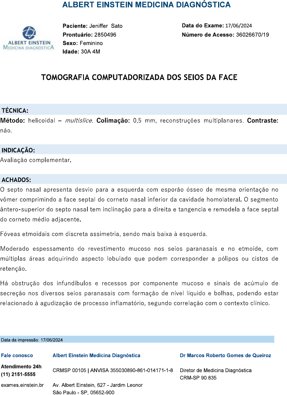 <p>ALBERT EINSTEIN MEDICINA DIAGNÓSTICA Paciente: Jeniffer Sato Data do Exame: 17/06/2024 Prontuário: 2850496 Número de Acesso: 36026670/19 ALBERT EINSTEIN Sexo: Feminino MEDICINA DIAGNÓSTICA Idade: 30A 4M TOMOGRAFIA COMPUTADORIZADA DOS SEIOS DA FACE TÉCNICA: Método: helicoidal - multislice. Colimação: 0,5 mm, reconstruções multiplanares. Contraste: não. INDICAÇÃO: Avaliação complementar. ACHADOS: O septo nasal apresenta desvio para a esquerda com esporão ósseo de mesma orientação no vômer comprimindo a face septal do corneto nasal inferior da cavidade homolateral. O segmento ântero-superior do septo nasal tem inclinação para a direita e tangencia e remodela a face septal do corneto médio adjacente. Fóveas etmoidais com discreta assimetria, sendo mais baixa à esquerda. Moderado espessamento do revestimento mucoso nos seios paranasais e no etmoide, com múltiplas áreas adquirindo aspecto lobulado que podem corresponder a pólipos ou cistos de retenção. Há obstrução dos infundíbulos e recessos por componente mucoso e sinais de acúmulo de secreção nos diversos seios paranasais com formação de nível líquido e bolhas, podendo estar relacionado à agudização de processo inflamatório, segundo correlação com o contexto clínico. Data da impressão: 17/06/2024 Fale conosco Albert Einstein Medicina Diagnóstica Dr Marcos Roberto Gomes de Queiroz Atendimento 24h CRMSP 00105 ANVISA 355030890-861-014171-1-8 Diretor de Medicina Diagnóstica (11) 2151-5555 CRM-SP 90.835 exames.einstein.br Av. Albert Einstein, 627 - Jardim Leonor São Paulo - SP, 05652-900</p><p>ALBERT EINSTEIN MEDICINA DIAGNÓSTICA Paciente: Jeniffer Sato Data do Exame: 17/06/2024 Prontuário: 2850496 Número de Acesso: 36026670/19 ALBERT EINSTEIN Sexo: Feminino MEDICINA DIAGNÓSTICA Idade: 30A 4M Aumento do componente mucoso das conchas e fossas nasais, podendo estar relacionado ao ciclo nasal ou a processo inflamatório (rinite). Os cornetos nasais à esquerda apresentam aumento volumétrico estreitando a coluna aérea dos meatos correspondentes, podendo representar hipertrofia ou ciclo nasal. Rinofaringe de contornos regulares. Bandas de nas coanas e faringe. Espessamento regular das paredes laterais da orofaringe, por provável aumento de tecido linfoide, com redução da coluna aérea adjacente. Revisado e Assinado Eletronicamente por: Dr. Murilo Bicudo Cintra - CRM 94333 Caso necessite de maiores informações em relação do seu exame, entre em contato por meio do endereço eletrônico: Doutor(a), aponte para o QR Code http://www.einstein.br/atendimento para falar com o médico responsável Acesse o campo "Área de Interesse", selecione a opção "Medicina por este laudo ou acesse: Diagnóstica" e preencha o formulário informando seu nome completo, telefone para contato, prontuário, modalidade e data do canalmedico.einstein.br exame realizado. Data da impressão: 17/06/2024 Fale conosco Albert Einstein Medicina Diagnóstica Dr Marcos Roberto Gomes de Queiroz Atendimento 24h CRMSP 00105 ANVISA 355030890-861-014171-1-8 Diretor de Medicina Diagnóstica (11) 2151-5555 CRM-SP 90.835 exames.einstein.br Av. Albert Einstein, 627 - Jardim Leonor São Paulo - SP, 05652-900</p>