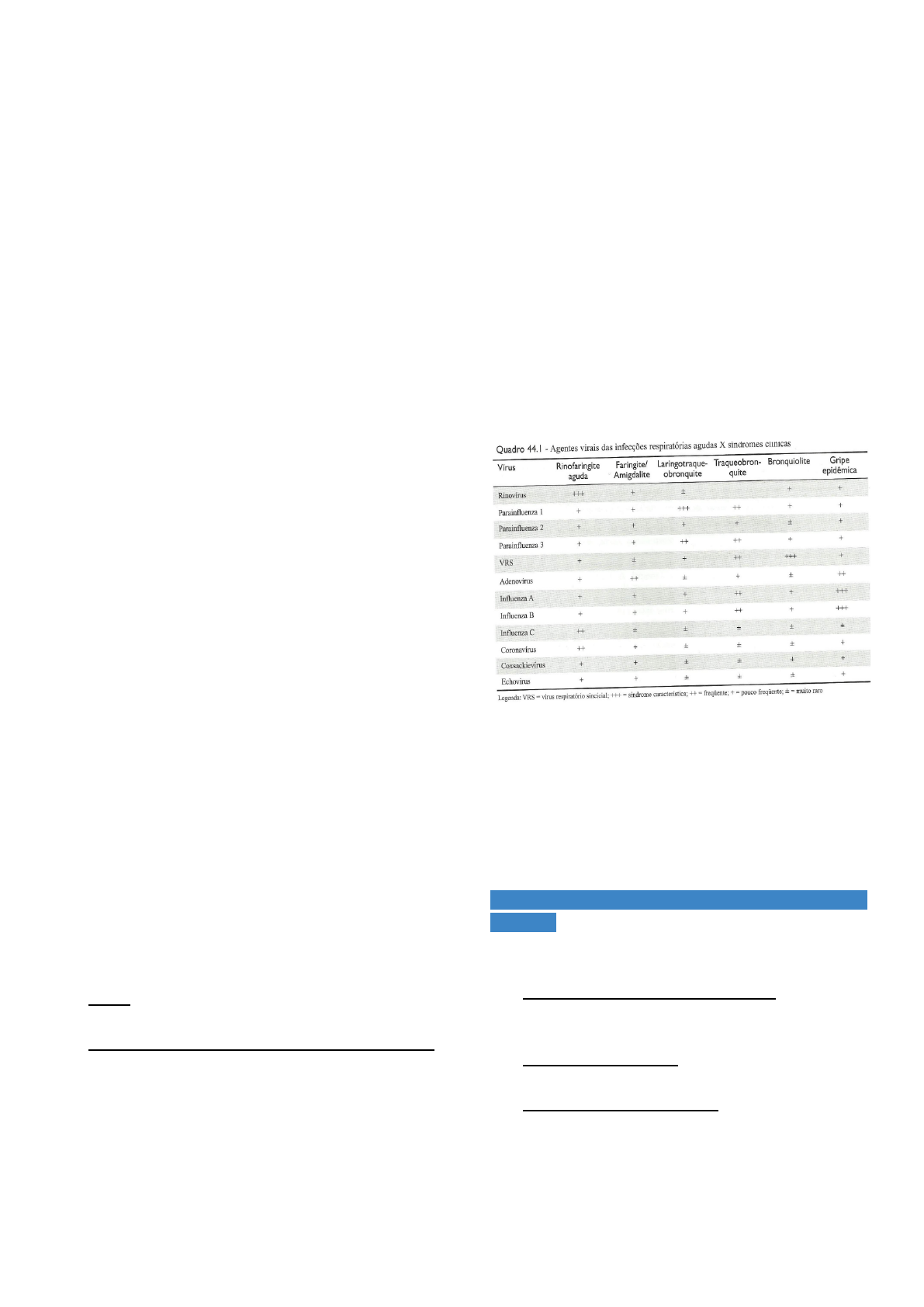 <p>Mariane Santos Antonieto - 10º período</p><p>IVAS</p><p>É uma causa significativa de consultas nos</p><p>ambulatórios de pediatria; muitas vezes vem</p><p>acompanhado de um quadro febril e nos</p><p>primeiros anos de vida, essas infecções se</p><p>repetem com alguma frequência, ao ponto de a</p><p>família procurar atendimento preocupada com a</p><p>imunidade da criança; mas sabe-se que na</p><p>maioria das vezes é um processo comum do</p><p>desenvolvimento.</p><p>Nos primeiros três anos de vida, não é raro as</p><p>crianças terem de 8 a 10 infecções por ano e na</p><p>maior parte das vezes são processos virais que</p><p>não estão relacionados com deficiência</p><p>imunológica.</p><p>Diante de uma criança que faz infecções de vias</p><p>aéreas superiores com alguma frequência, mas</p><p>mantém um bom estado geral, um bom</p><p>crescimento e desenvolvimento, não é para se</p><p>suspeitar de deficiência imunológica e indicar</p><p>investigação mais detalhada; a não ser em casos</p><p>mais específicos, por exemplo, se a criança teve:</p><p>● Mais de 2 pneumonias no último ano;</p><p>● 4 episódios de otite média no último ano;</p><p>● Se tem diarréia crônica ou de repetição.</p><p>Mas lembrar que a maioria são infecções virais</p><p>que fazem parte do processo de aprendizado do</p><p>sistema imunológico da criança.</p><p>As IVAS são uma causa importante de uso</p><p>abusivo e inadequado de antibioticoterapia, bem</p><p>como de outras medicações, como anti</p><p>inflamatórios e descongestionantes nasais, que</p><p>podem ter mais efeitos colaterais do que</p><p>vantagens.</p><p>As infecções de vias aéreas, de uma forma geral,</p><p>incluindo as de via superior e inferior</p><p>correspondem por até 40% das consultas</p><p>ambulatoriais e em torno de 12 a 13% das</p><p>internações.</p><p>A OMS diferencia:</p><p>● IVAS: aquelas que vão até a região da</p><p>laringe.</p><p>● Infecções do trato respiratório inferior:</p><p>ocorrem abaixo da laringe.</p><p>A maior parte dos agentes envolvidos são</p><p>quadros virais e sempre que estiver avaliando</p><p>clinicamente o paciente, tentar distinguir se é um</p><p>processo infeccioso viral ou bacteriano. Dentro</p><p>das infecções bacterianas, o Streptococcus é</p><p>uma causa importante de infecção na amigdalite.</p><p>Pneumococo, Haemophilus e Moraxella</p><p>catarrhalis são agentes importantes em otites e</p><p>sinusites. A anamnese e o exame físico que vão</p><p>ajudar a definir qual a melhor abordagem para o</p><p>paciente.</p><p>Diagrama mostrando a quantidade de vírus que</p><p>estão envolvidos nas várias doenças</p><p>respiratórias; desde o Rinovírus, como principal</p><p>agente etiológico do resfriado comum, também</p><p>chamado de rinofaringite aguda. Todos eles</p><p>podendo causar um maior ou com menor</p><p>importância um processo de faringite/amigdalite e</p><p>muitas vezes, a associação de febre alta com</p><p>infecção bacteriana não é sempre verdadeiro;</p><p>algumas viroses como Adenovírus podem causar</p><p>febre alta por 3 a 5 dias sem haver necessidade</p><p>de antimicrobiano.</p><p>→ Não é interessante fazer como hipótese</p><p>diagnóstica IVAS devido a quantidade de partes</p><p>do organismo que seriam afetadas, podendo ser:</p><p>rinite (com acometimento nasal), faringite,</p><p>sinusite, otite. Então ao invés de colocar IVAS, é</p><p>melhor descrever qual órgão está sendo afetado.</p><p>RINOFARINGITE AGUDA OU RESFRIADO</p><p>COMUM</p><p>● Frequência → é uma doença bastante</p><p>comum, sobretudo no inverno.</p><p>● Agente etiológico mais frequente: Rinovírus.</p><p>● Outros: Adenovírus, VSR, Influenza e</p><p>Parainfluenza.</p><p>● Sintomatologia leve: afebril, obstrução nasal,</p><p>sem acometimento do estado geral, rinorreia.</p><p>● Formas mais acentuadas: febre alta, cefaléia,</p><p>mialgia, mal estar, inapetência.</p><p>A característica da doença são manifestações</p><p>respiratórias com obstrução nasal, coriza, na</p><p>maioria das vezes o paciente não tem febre, mas</p><p>ela pode estar presente e ser mais baixa. A febre</p><p>mais alta pode estar presente em crianças mais</p><p>1</p><p>Mariane Santos Antonieto - 10º período</p><p>jovens. Podem ter algum grau de tosse e um</p><p>menor comprometimento sistêmico; em casos</p><p>mais acentuados podemos ter um acometimento</p><p>mais sistêmico, mas sobretudo em crianças</p><p>menores.</p><p>O termo gripe ou síndrome gripal é melhor</p><p>utilizado quando estamos falando de influenza,</p><p>que é um vírus que comumente causa sintomas</p><p>mais sistêmicos, como cefaléia, mialgia e algum</p><p>grau de comprometimento do estado geral.</p><p>Outro ponto de dúvida é se o aspecto da coriza</p><p>favorece a percepção de ser uma infecção viral</p><p>ou bacteriana e na verdade não.</p><p>● Aspecto da secreção e diagnóstico</p><p>diferencial: de uma forma geral, o resfriado</p><p>comum vai ter durante o curso de uma</p><p>semana da doença, uma mudança no</p><p>aspecto dessa secreção nasal.</p><p>→ De serosa, inicialmente, clarinha,</p><p>transparente; no meio do processo vai ficar</p><p>brancacenta com um aspecto mucoso e no final</p><p>pode até ter um aspecto muco purulento e aí</p><p>volta a ficar mais clara, gradativamente e</p><p>melhorando com a fluidificação com solução</p><p>fisiológica nasal.</p><p>Isso quer dizer que nem sempre que você ver</p><p>uma secreção amarela/esverdeada é uma</p><p>infecção bacteriana; tem que juntar outros dados</p><p>clínicos para fechar esse diagnóstico.</p><p>● Serosa: fase inicial das viroses, rinites</p><p>bacterianas primárias ou secundárias.</p><p>● Mucosa: fase intermediária e final das</p><p>viroses, alergias. Presença de ferimentos</p><p>superficiais na pele ao redor das narinas:</p><p>impetigo estreptocócico.</p><p>● Mucopurulenta: fase final d