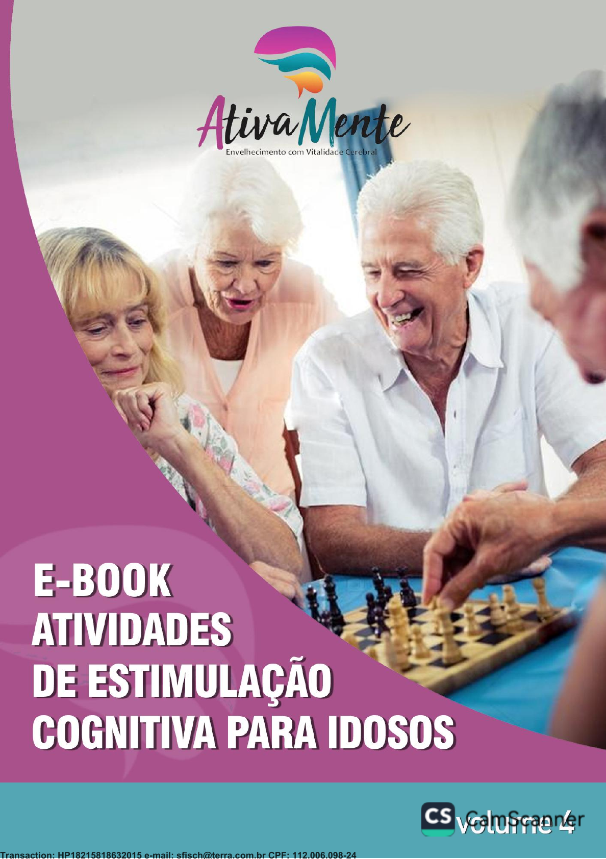 <p>E-BOOK</p><p>ESTIMULAÇÃO COGNITIVA</p><p>Volume 4</p><p>Transaction: HP18215818632015 e-mail: sfisch@terra.com.br CPF: 112.006.098-24</p><p>2</p><p>Sobre as autoras -------------------------------- 01</p><p>Sobre o Projeto Ativamente ------------------ 02</p><p>Orientações --------------------------------------- 03</p><p>Saúde Cognitiva no Envelhecimento ------ 05</p><p>Neuroplasticidade ------------------------------ 06</p><p>Reserva Cognitiva ------------------------------ 06</p><p>Reabilitação cognitiva, o que é? ------------ 07</p><p>Estimulação cognitiva -------------------------- 08</p><p>Etapas para organizar e criar atividades – 09</p><p>Psicoeducação ---------------------------------- 09</p><p>Por que grupo? ---------------------------------- 10</p><p>Domínios Cognitivos---------------------------- 11</p><p>Referências -------------------------------------- 16</p><p>Atividades ---------------------------------------- 17</p><p>Transaction: HP18215818632015 e-mail: sfisch@terra.com.br CPF: 112.006.098-24</p><p>1</p><p>Sobre as autoras</p><p>Rachel Dias, é psicóloga clínica e desde a sua formação já teve contato com o atendimento</p><p>ao idoso. Após se formar, o desejo de trabalhar com essa população só aumento e por isso foi</p><p>buscar mais preparo. Inicialmente, cursou a Especialização em Psicogeriatria pelo IPUB/UFRJ e ao</p><p>final, iniciou no grupo de pesquisa para fazer o Mestrado em Saúde Mental também pelo</p><p>IPUB/UFRJ. Almejando por mais conhecimentos buscou um dos melhores cursos de Avaliação</p><p>Neuropsicológica, na USP.</p><p>Shayenne N. Torres, também é psicóloga e tem uma trajetória um pouco diferente. Iniciou</p><p>sua prática pela infância, cursando a Especialização em Psicanálise com Crianças - Intervenção</p><p>Precoce, na Santa Casa/RJ. A partir da sua atuação como psicóloga clínica em uma instituição</p><p>psiquiátrica, fez a Especialização em Psicanálise e Psicopatologia Clínica pelo IFSM. Foi quando</p><p>nessa mesma instituição foi chamada para cobrir as férias de uma colega, no setor que era</p><p>destinado aos idosos. Desde então, seu amor por esse trabalho só aumentou, chegando a</p><p>coordenar a equipe do centro de convivência, durante 5 anos. E nesse período cursou a</p><p>Especialização em Gerontologia e Geriatria Interdisciplinar pela UFF.</p><p>Além desses cursos, estamos sempre participando de eventos, como congressos,</p><p>simpósios, palestras sobre o tema. É muito importante que os profissionais que atuam com os</p><p>idosos se mantenham atualizados com as informações sobre o envelhecimento e tudo o que</p><p>envolve o idoso.</p><p>Transaction: HP18215818632015 e-mail: sfisch@terra.com.br CPF: 112.006.098-24</p><p>2</p><p>Sobre o Projeto AtivaMente</p><p>Envelhecendo com Vitalidade Cognitiva</p><p>O Projeto AtivaMente, nasceu em nossos corações desde que iniciamos nossos trabalhos</p><p>com idosos. Nos conhecemos em 2011 quando trabalhamos juntas em uma outra instituição. Lá</p><p>aprendemos na prática o que é trabalhar com idosos ativos, com demência, e/ou deprimidos e/ou</p><p>com transtornos psiquiátricos diversos. Essa experiência fez com que buscássemos mais</p><p>informações e atualizações para aperfeiçoarmos nossa atuação e intervenções.</p><p>Em junho de 2017 iniciamos o projeto com um pequeno grupo de idosos ativos. E hoje</p><p>temos dois perfis de grupo: Idosos ativos e, idosos que possuem algum tipo de transtorno</p><p>neurodegenerativo. Também oferecemos outros serviços, como psicoterapia, avaliação</p><p>neuropsicológica e atendimento domiciliar (psicoterapia e estimulação cognitiva).</p><p>Além do trabalho direto com os idosos, outra frente de atuação importante é o compartilhar</p><p>as informações adquiridas e a prática do dia a dia com outros profissionais. Entendemos o quanto</p><p>o trabalho com idosos requer da nossa criatividade, pela diversidade de doenças e necessidades</p><p>que essa etapa de vida pode gerar no idoso. Por isso organizamos eventos como workshops e</p><p>palestras, além de publicações de diversos tipos em nossas redes sociais.</p><p>A proposta de elaborar os Ebooks surge para atender uma demanda dos nossos colegas de</p><p>profissão, proporcionando assim a outros profissionais que trabalham com idosos um pouco de</p><p>conhecimento teórico e atividades de qualidade. Assim colaboramos que mais idosos do Brasil</p><p>recebam atendimento eficaz. Além do Ebook, oferecemos supervisão online para profissionais da</p><p>saúde.</p><p>Para nos acompanhar conheça nossas redes sociais:</p><p>Facebook: @psicologiaAtivaMente</p><p>Instagram: @ativamente_vitalidadecerebral</p><p>Transaction: HP18215818632015 e-mail: sfisch@terra.com.br CPF: 112.006.098-24</p><p>3</p><p>Orientações</p><p>Vivenciar um declínio cognitivo que resulte em perda da independência funcional é uma das</p><p>perspectivas mais temidas do processo de envelhecimento. Nesse sentido, a fragilidade</p><p>neurocognitiva tem sido considerada o maior obstáculo para o envelhecimento bem-sucedido. A</p><p>identificação de estratégias preventivas capazes de preservar a saúde cognitiva é atualmente uma</p><p>prioridade para a redução de morbidade e incapacidade associadas ao envelhecimento.</p><p>Estima-se que aproximadamente metade dos casos de doença de Alzheimer em todo o</p><p>mundo possa ser atribuída a fatores de risco potencialmente modificáveis. Entre esses fatores</p><p>destacam-se diversos aspectos relacionados com o estilo de vida ativo que têm sido associados a</p><p>menor risco de transtornos cognitivos.</p><p>Alguns desses fatores são potencialmente modificáveis mesmo nas fases tardias da velhice,</p><p>principalmente as atividades e os hábitos com potencial para desacelerar o declínio cognitivo</p><p>devem ser conhecidos e estimulados em estratégias de promoção de saúde para a população</p><p>ido