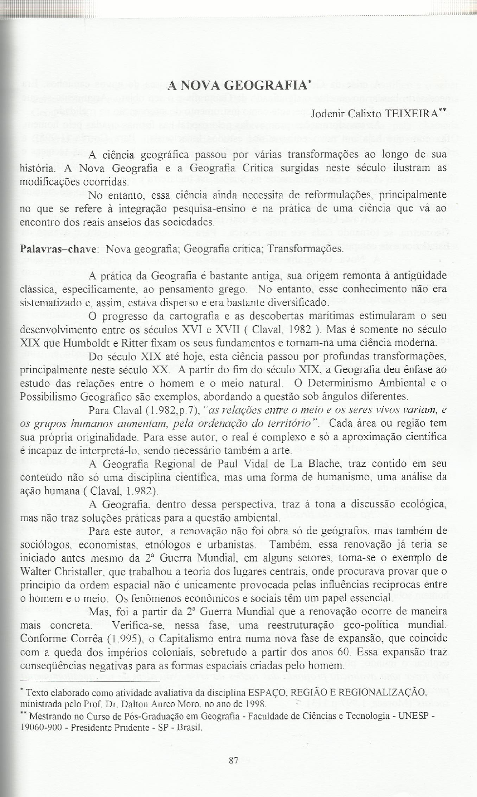 <p>A NOVA GEOGRAFIA* Jodenir Calixto TEIXEIRA** A ciência geográfica passou por várias transformações ao longo de sua história. A Nova Geografia e a Geografia Crítica surgidas neste século ilustram as modificações ocorridas. No entanto, essa ciência ainda necessita de reformulações, principalmente no que se refere à integração pesquisa-ensino e na prática de uma ciência que vá ao encontro dos reais anseios das sociedades. Nova geografia; Geografia crítica; Transformações. A prática da Geografia é bastante antiga, sua origem remonta à antiguidade clássica, especificamente, ao pensamento grego. No entanto, esse conhecimento não era sistematizado e, assim, estava disperso e era bastante diversificado. progresso da cartografia e as descobertas marítimas estimularam o seu desenvolvimento entre os séculos XVI e XVII ( Claval, 1982 ). Mas é somente no século XIX que Humboldt e Ritter fixam os seus fundamentos e tornam-na uma ciência moderna. Do século XIX até hoje, esta ciência passou por profundas transformações, principalmente neste século XX. A partir do fim do século XIX, a Geografia deu ênfase ao estudo das relações entre o homem e o meio natural. Determinismo Ambiental e o Possibilismo Geográfico são exemplos, abordando a questão sob ângulos diferentes. Para Claval (1.982,p.7), "as relações entre meio e os seres vivos variam, e os grupos humanos aumentam, pela ordenação do Cada área ou região tem sua própria originalidade. Para esse autor, o real é complexo e só a aproximação científica é incapaz de interpretá-lo, sendo necessário também a arte. A Geografia Regional de Paul Vidal de La Blache, traz contido em seu conteúdo não só uma disciplina mas uma forma de humanismo, uma análise da ação humana ( Claval, 1.982). A Geografia, dentro dessa perspectiva, traz à tona a discussão ecológica, mas não traz soluções práticas para a questão ambiental. Para este autor, a renovação não foi obra só de mas também de sociólogos, economistas, etnólogos e urbanistas. Também, essa renovação já teria se iniciado antes mesmo da Guerra Mundial, em alguns setores, toma-se o exemplo de Walter Christaller, que trabalhou a teoria dos lugares centrais, onde procurava provar que o princípio da ordem espacial não é unicamente provocada pelas influências recíprocas entre o homem e o meio. Os fenômenos econômicos e sociais têm um papel essencial. Mas, foi a partir da Guerra Mundial que a renovação ocorre de maneira mais concreta. Verifica-se, nessa fase, uma reestruturação geo-política mundial. Conforme Corrêa (1.995), o Capitalismo entra numa nova fase de expansão, que coincide com a queda dos impérios coloniais, sobretudo a partir dos anos 60. Essa expansão traz negativas para as formas espaciais criadas pelo homem. Texto elaborado como atividade avaliativa da disciplina ESPAÇO, REGIÃO E ministrada pelo Prof. Dr. Dalton Aureo no ano de 1998. Mestrando no Curso de Pós-Graduação em Geografia Faculdade de Ciências e Tecnologia UNESP 19060-900 Presidente Prudente SP Brasil. 87</p><p>A crise da Geografia Tradicional enseja a busca de novos caminhos. Era necessário buscar novamente significado da Geografia e o seu objeto. Argumenta-se que a Geografia Tradicional era inoperante como instrumento de intervenção na realidade. As transformações promovidas pelo capital nas formas criadas pelo homem, faz com que haja um novo enfoque nos estudos locacionais. Para Corrêa (1.995), a Geografia que surge tem um novo papel ideológico. É preciso buscar novas técnicas e nova linguagem, que dê conta das novas tarefas impostas pelas transformações ocorridas. A nova Geografia nasce na Suécia, na Inglaterra e nos onde, nesse último, apresenta-se como uma crítica à Geografia Hartshoriana, como difusão do sistema de planejamento do Estado Capitalista e uma neutralidade científica. A Nova Geografia passa a usar técnicas da Estatística, da Matemática, da Geometria, se tornando cada vez mais teórica. Para essa nova abordagem, o avanço da Estatística e da computação propiciam a explicação geográfica. A Nova Geografia aborda a questão regional sob um novo enfoque, rompendo com Determinismo e com o Possibilismo. Cada localização é um caso particular de classificação, possuindo potencialidades diferentes, de acordo com a ótica do capital. "Desenvolve nesse "clima", conceito de organização espacial resultante de decisões locacionais" (Corrêa, 1.995 p.19). Na realidade, a Nova Geografia ou Geografia Teorética ou Quantitativa, representou uma continuidade da Geografia Tradicional. Conforme Claval (1.982), ela não conseguiu resolver os problemas relativos ao ordenamento espacial do mundo e, sim, apresentou dificuldades em passar da explicação e da previsão para o estabelecimento de normas de ação. A GEOGRAFIA NO FINAL DO SÉCULO XX A partir da década de 70, a Nova Geografia e os paradigmas tradicionais são submetidos a severas críticas por geógrafos que passam a adotar a chamada Geografia Crítica, Radical ou Marxista. Percebe-se que a Geografia aplicada até então, não respondia aos anseios da sociedade e se comportava pacificamente frente aos problemas sociais, econômicos e ambientais que se agravaram após a Guerra Mundial. "No caso do Brasil, a Geografia nasce no final da década de 70, cujo marco foi 3° Encontro Nacional da Geógrafos, realizado em julho de 1.978 em Fortaleza-CE, sob os da Associação dos Geógrafos (Corrêa, 1.995, p.20). Com essa nova abordagem geográfica, a relação homem e meio é analisada sob o enfoque marxista. Procura-se ir além da simples descrição, e analisar a ação do homem sobre o meio dentro de um processo histórico. Moraes (1.997), ressalta que pensavam o saber como arma no processo social, como instrumento de libertação do homem na luta pela sociedade mais justa. Os autores dessa linha vão analisar as causas da crise. A renovação geográfi