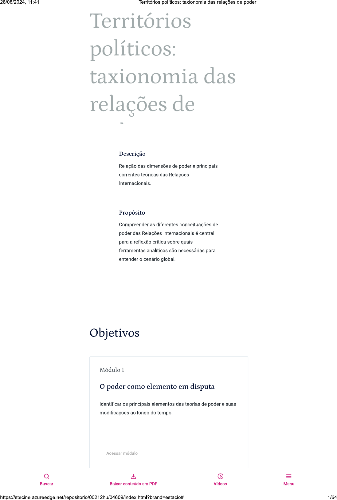 <p>28/08/2024, 11:41 Territórios políticos taxionomia das relações de poder Territórios políticos: taxionomia das relações de Descrição Relação das dimensões de poder e principais correntes teóricas das Relações Internacionais. Propósito Compreender as diferentes conceituações de poder das Relações Internacionais é central para a reflexão crítica sobre quais ferramentas analíticas são necessárias para entender o cenário global. Objetivos Módulo 1 poder como elemento em disputa Identificar os principais elementos das teorias de poder e suas modificações ao longo do tempo. Acessar módulo Q Buscar Baixar conteúdo em PDF Vídeos Menu 1/64</p><p>28/08/2024, 11:41 Territórios políticos: taxionomia das relações de poder Módulo 2 Escola Liberal e as possibilidades da globalização Analisar o papel de Estados e instituições internacionais nas teorias de poder das Relações Internacionais. Acessar módulo Módulo 3 poder das ideias e das identidades por meio do construtivismo Listar as narrativas sobre os interesses estatais e o papel das nações em temas sensíveis transnacionais. Acessar módulo 2/64</p><p>28/08/2024, 11:41 Territórios políticos: taxionomia das relações de poder Introdução Vamos tratar das formas de poder e da compreensão de que uma dinâmica internacional é viva para todos aqueles que necessitam de seu olhar. Sendo assim, é fundamental um exercício de compreensão do Estado e do poder na sociedade atual. Para isso, primeiramente, abordaremos os principais elementos das teorias de poder e suas transformações ao longo do tempo. Em seguida, analisaremos o papel de Estados e instituições internacionais nas teorias de poder das Por fim, trataremos das narrativas sobre os interesses estatais e o papel das nações em temas sensíveis transnacionais. 1 O poder como elemento em disputa Ao final deste módulo, você será capaz de identificar os principais elementos das teorias de poder e suas modificações ao longo do tempo. 3/64</p><p>28/08/2024, 11:41 Territórios políticos: taxionomia das relações de poder influência.na política internacional Poder nas dinâmicas internacionais Acompanhe um bate-papo sobre o poder nas dinâmicas internacionais. 4/64</p><p>28/08/2024, 11:41 Territórios políticos: taxionomia das relações de poder A estreita relação que existe entre a escola realista e o conceito de poder decorre de sua percepção básica: conflito e competição são intrínsecos à prática da política internacional. Assim, a aquisição e gestão do poder é a característica central da política entre as nações. Embora os realistas estejam de acordo quanto a isso, há uma variação em como entendem o conceito: Para os realistas Para os estruturais ou clássicos, a luta neorrealistas, é a permanente pelo poder arquitetura do sistema decorre de impulso X internacional que força humano fundamental os Estados a buscar o (Morgenthau, 1948). poder e maximizar sua posição de força (Mearsheimer; Glenn, 2001). Além disso, há divergências sobre como o poder deve ser concebido e medido. A primeira expressão analítica sobre o poder e o realismo se encontra nas considerações sobre o "equilíbrio de poder", expressão identificada nas reflexões do filósofo grego Tucídides, em V a.C., para explicar o início da Guerra do Peloponeso. A reflexão reforça que a política de poder funciona como uma espécie de lei do comportamento humano. Feras MAR EGEU Dodona TESSÁLIA BEOCIA MAR JÔNICO (424) LOCRIDA Tebas aristo ÁTICA Patras ACAIA Mega Miconos CICLADE Sérifo Zaquintos Sifno Nisiro (418) Esparta Esfacteria (425) Citera Creta Cidonia Guerra do Peloponeso: Esparta e a Liga do Peloponeso em rosa, Atenas e seus aliados em amarelo. o comportamento do Estado como um ator é entendido como um reflexo das características das pessoas que compõem o Estado. De 5/64</p><p>28/08/2024, 11:41 Territórios políticos: taxionomia das relações de poder condição de natureza humana é uma das características definidoras do realismo clássico e é mais famosamente representada em Morgenthau (1948) Morgenthau sustentou que a política é governada por leis objetivas que têm suas raízes na natureza humana. Era importante para Morgenthau reconhecer que essas leis existem e elaborar políticas consistentes com o fato de que os seres humanos possuem uma vontade de poder inerente. Tanto para Tucídides quanto para Morgenthau, a continuidade essencial do comportamento dos Estados é sua busca pelo poder, que está enraizada nos impulsos biológicos dos seres humanos. Essas discussões são relevantes ao pensarmos nas dimensões de Balança de Poder. termo implica que mudanças no poder político relativo podem ser observadas e medidas, principalmente ao analisar como diferentes potências lidam com rivais. A dinâmica de Balança de Poder está pautada em duas considerações: 1 sistema internacional é considerado anárquico, sem que nenhuma autoridade de todo o sistema seja formalmente imposta a seus agentes. 2 As grandes potências têm vários mecanismos para restaurar o equilíbrio, incluindo o acúmulo militar interno, sendo a riqueza econômica convertida em poder militar e formação de alianças. Como não existe um "governo mundial" para proteger os Estados uns dos outros, cada um tem que confiar em seus próprios recursos e estratégias para evitar ser conquistado, coagido ou ameaçado de outra forma. 6/64</p><p>28/08/2024, 11:41 Territórios políticos: taxionomia das relações de poder Ao enfrentar uma nação poderosa, um país pode mobilizar mais recursos próprios ou buscar uma aliança com outros Estados que enfrentam o mesmo perigo, a fim de mudar a balança mais a seu favor. Aqui, o poder é um elemento que confere liberdade ao Estado para buscar sua sobrevivência - o objetivo final de qualquer país. Elementos morais e direitos humanos podem ser considerações importantes, mas são subsidiárias da busca