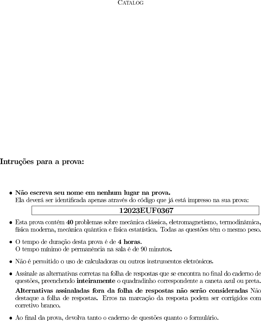 <p>L(q,q̇,t) =</p><p>✓</p><p>1</p><p>2</p><p>mq̇2 �</p><p>m!2q2</p><p>2</p><p>◆</p><p>e2�t,</p><p>m �</p><p>q̈ + 2�q̇ + !2q = 0</p><p>q̈ + !2q = 0</p><p>q̈ + �q̇ + !2q = 0</p><p>q̈ + �q̇ + 2!2q</p><p>q̈ + �q̇ + 4!2q = 0</p><p>L(q,</p><p>·</p><p>q,t) =</p><p>✓</p><p>1</p><p>2</p><p>mq̇2 �</p><p>m!2q2</p><p>2</p><p>◆</p><p>e3�t,</p><p>m �</p><p>q̈ + 3�q̇ + !2q = 0</p><p>q̈ + 1</p><p>3!</p><p>2q = 0</p><p>q̈ + �q̇ + 2!2q = 0</p><p>q̈ + �q̇ + 3!2q = 0</p><p>q̈ + �q̇ + 1</p><p>3!</p><p>2q</p><p>E</p><p>Fr = qE �mg � bv.</p><p>q</p><p>m g b</p><p>t = 0</p><p>qE �mg</p><p>b</p><p>(1� e�</p><p>b</p><p>m t)</p><p>qE �mg</p><p>2b</p><p>(1� e�</p><p>2b</p><p>m t)</p><p>qE �mg</p><p>3b</p><p>(1� e�</p><p>3b</p><p>m t)</p><p>(qE �mg)</p><p>m</p><p>t</p><p>qE</p><p>b</p><p>E</p><p>Fr = qE �mg � 2bv.</p><p>q</p><p>m g b</p><p>t = 0</p><p>qE �mg</p><p>2b</p><p>(1� e�</p><p>2b</p><p>m t)</p><p>qE �mg</p><p>b</p><p>(1� e�</p><p>b</p><p>m t)</p><p>qE �mg</p><p>3b</p><p>(1� e�</p><p>3b</p><p>m t)</p><p>(qE �mg)</p><p>m</p><p>t</p><p>2qE</p><p>b</p><p>4m m</p><p>4m v m</p><p>F (t) =</p><p>8</p><p>>>>><</p><p>>>>>:</p><p>t</p><p>⌧ Fmax, se 0 t ⌧,</p><p>(2� t</p><p>⌧ )Fmax, ⌧ < t 2⌧,</p><p>0, se t > 2⌧,</p><p>t = 0</p><p>Fmax</p><p>4</p><p>mv</p><p>⌧</p><p>3</p><p>mv</p><p>⌧</p><p>mv</p><p>⌧</p><p>0</p><p>1</p><p>3m 2m</p><p>3m v 2m</p><p>F (t) =</p><p>8</p><p>>>>><</p><p>>>>>:</p><p>t</p><p>⌧ Fmax, se 0 t ⌧,</p><p>(2� t</p><p>⌧ )Fmax, ⌧ < t 2⌧,</p><p>0, se t > 2⌧,</p><p>t = 0</p><p>Fmax</p><p>3</p><p>mv</p><p>⌧</p><p>4</p><p>mv</p><p>⌧</p><p>mv</p><p>⌧</p><p>0</p><p>1</p><p>~F (x,y) = �20bx3y2~i� 10bx4y ~j,</p><p>b</p><p>r⇥ ~F = 0 ~F U(x,y) = 5bx4y2 +K</p><p>K</p><p>r⇥ ~F = 0</p><p>(x,y) = (0,0)</p><p>r⇥ ~F 6= 0</p><p>r⇥ ~F = 0 ~F U(x,y) = 10bx4y2 + bx3y2 +K</p><p>K</p><p>~F (x,y) = �3ax2y~i� ax3 ~j,</p><p>a</p><p>r⇥ ~F = 0 ~F U(x,y) = ax3y +K K</p><p>r⇥ ~F = 0</p><p>(x,y) = (0,0)</p><p>r⇥ ~F 6= 0</p><p>r ⇥ ~F = 0 ~F U(x,y) = 3ax3y + ax3y +K</p><p>K</p><p>k</p><p>m R �x</p><p>g</p><p>�x =</p><p>r</p><p>5</p><p>mRg</p><p>k</p><p>�x =</p><p>r</p><p>mRg</p><p>k</p><p>�x =</p><p>r</p><p>2</p><p>mRg</p><p>k</p><p>�x =</p><p>r</p><p>5</p><p>2</p><p>mRg</p><p>k</p><p>�x =</p><p>r</p><p>1</p><p>2</p><p>mRg</p><p>k</p><p>k</p><p>m R</p><p>�x</p><p>g</p><p>k</p><p>k = 5</p><p>mRg</p><p>�x2</p><p>k =</p><p>mRg</p><p>�x2</p><p>k = 2</p><p>mRg</p><p>�x2</p><p>k =</p><p>5</p><p>2</p><p>mRg</p><p>�x2</p><p>k =</p><p>1</p><p>2</p><p>mRg</p><p>�x2</p><p>M l</p><p>O</p><p>m</p><p>v =</p><p>M</p><p>m</p><p>r</p><p>gl</p><p>3</p><p>v =</p><p>M</p><p>m</p><p>r</p><p>gl</p><p>6</p><p>v =</p><p>M</p><p>m</p><p>r</p><p>gl</p><p>9</p><p>v =</p><p>M</p><p>m</p><p>r</p><p>4gl</p><p>3</p><p>v =</p><p>M</p><p>m</p><p>r</p><p>4gl</p><p>6</p><p>M</p><p>l O</p><p>m</p><p>v</p><p>m/M</p><p>m</p><p>M</p><p>=</p><p>r</p><p>gl</p><p>3v2</p><p>m</p><p>M</p><p>=</p><p>r</p><p>gl</p><p>6v2</p><p>m</p><p>M</p><p>=</p><p>r</p><p>gl</p><p>9v2</p><p>m</p><p>M</p><p>=</p><p>r</p><p>4gl</p><p>3v2</p><p>m</p><p>M</p><p>=</p><p>r</p><p>4gl</p><p>6v2</p><p>xi mi</p><p>m2</p><p>k</p><p>2</p><p>k</p><p>3</p><p>k</p><p>4</p><p>k</p><p>5</p><p>k</p><p>1</p><p>m</p><p>1</p><p>m</p><p>2</p><p>m</p><p>3</p><p>m</p><p>4</p><p>ẍ2 +</p><p>k2</p><p>m2</p><p>(x2 � x1) +</p><p>k3</p><p>m2</p><p>(x2 � x3) = 0</p><p>ẍ2 +</p><p>k2</p><p>m2</p><p>(x2 + x1) +</p><p>k3</p><p>m2</p><p>(x2 + x3) = 0</p><p>ẍ2 +</p><p>k3</p><p>m2</p><p>(x2 � x1) +</p><p>k2</p><p>m2</p><p>(x2 � x3) = 0</p><p>ẍ2 �</p><p>k2</p><p>m2</p><p>(x2 � x1)�</p><p>k3</p><p>m2</p><p>(x2 � x3) = 0</p><p>ẍ2 +</p><p>k2 + k3</p><p>m2</p><p>x2 = 0</p><p>xi mi</p><p>m3</p><p>k</p><p>2</p><p>k</p><p>3</p><p>k</p><p>4</p><p>k</p><p>5</p><p>k</p><p>1</p><p>m</p><p>1</p><p>m</p><p>2</p><p>m</p><p>3</p><p>m</p><p>4</p><p>ẍ3 +</p><p>k3</p><p>m3</p><p>(x3 � x2) +</p><p>k4</p><p>m3</p><p>(x3 � x4) = 0</p><p>ẍ3 +</p><p>k3</p><p>m3</p><p>(x3 + x2) +</p><p>k4</p><p>m3</p><p>(x3 + x4) = 0</p><p>ẍ3 +</p><p>k4</p><p>m3</p><p>(x3 � x2) +</p><p>k3</p><p>m3</p><p>(x3 � x4) = 0</p><p>ẍ3 �</p><p>k3</p><p>m3</p><p>(x3 � x2)�</p><p>k4</p><p>m3</p><p>(x3 � x4) = 0</p><p>ẍ3 +</p><p>k3 + k4</p><p>m3</p><p>x3 = 0</p><p>q</p><p>R d ⌧ R U</p><p>U =</p><p>q2d</p><p>2⇡✏0R2</p><p>U =</p><p>q2d</p><p>⇡✏0R2</p><p>U =</p><p>q2</p><p>⇡✏0R</p><p>U =</p><p>q2R</p><p>4✏0d2</p><p>U =</p><p>q2R2</p><p>2⇡✏0d3</p><p>q</p><p>R d ⌧ R</p><p>u</p><p>u =</p><p>q2</p><p>2✏0⇡2R4</p><p>u =</p><p>q2</p><p>4✏0⇡2R4</p><p>u =</p><p>q2</p><p>2✏0⇡R4</p><p>u =</p><p>q2d</p><p>2✏0⇡2R5</p><p>u =</p><p>q2d</p><p>4✏0R5</p><p>R q</p><p>!</p><p>B =</p><p>µ0!q</p><p>4⇡R</p><p>B =</p><p>µ0!q</p><p>2⇡R</p><p>B =</p><p>2⇡µ0!q</p><p>R</p><p>B =</p><p>4⇡µ0!q</p><p>R</p><p>B =</p><p>2µ0!q</p><p>⇡R</p><p>D q</p><p>!</p><p>B =</p><p>µ0!q</p><p>2⇡D</p><p>B =</p><p>µ0!q</p><p>⇡D</p><p>B =</p><p>2⇡µ0!q</p><p>D</p><p>B =</p><p>4⇡µ0!q</p><p>D</p><p>B =</p><p>4µ0!q</p><p>⇡D</p><p>n</p><p>i = i0 cos(!t) A</p><p>E</p><p>E = A!µ0i0n sin(!t)</p><p>E = A!µ0i0n cos(!t)</p><p>E = �A!µ0i0n sin2(!t)</p><p>E = �A!µ0i0n2 cos(!t)</p><p>E = A!µ0i0n cos2(!t)</p><p>n</p><p>i = i0 sin(!t) A</p><p>E</p><p>E = �A!µ0i0n cos(!t)</p><p>E = A!µ0i0n sin(!t)</p><p>E = A!µ0i0n sin2(!t)</p><p>E = �A!µ0i0n2 cos(!t)</p><p>E = �A!µ0i0n cos2(!t)</p><p>~B = B0</p><p>⇥</p><p>e�↵x cos(ky � !t)x̂+ e�↵x sin(ky � !t)ŷ + 3e�↵y cos(kx� !t)ẑ</p><p>⇤</p><p>.</p><p>↵ k</p><p>↵ = k</p><p>↵ = 2⇡k</p><p>↵ = k ln 2</p><p>↵ = 2⇡k ln 2</p><p>↵ = k/2⇡</p><p>~B = B0</p><p>⇥</p><p>e�↵x cos(ky � !t)x̂+ 2e�↵x sin(ky � !t)ŷ + 3e�↵y cos(kx� !t)ẑ</p><p>⇤</p><p>.</p><p>↵ k</p><p>↵ = 2k</p><p>↵ = 2⇡k</p><p>↵ = k ln 2</p><p>↵ = 2⇡k ln