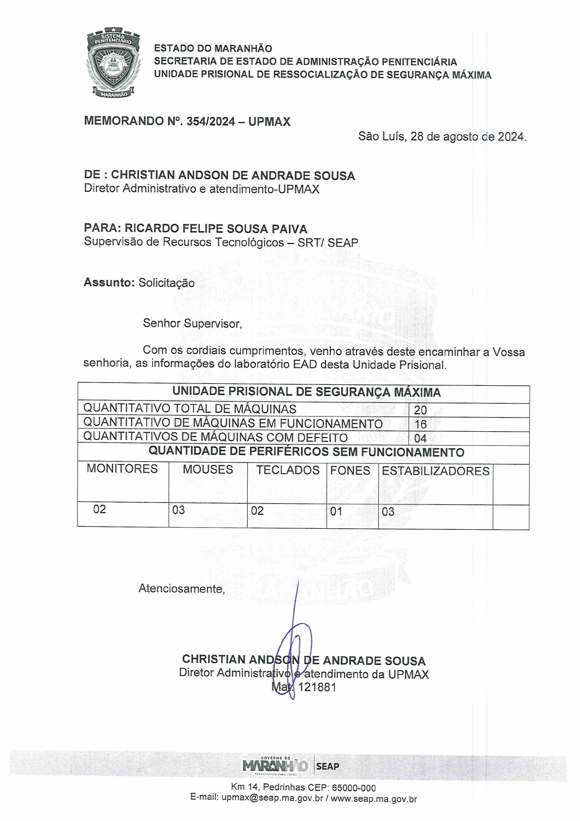 <p>SISTEMA ESTADO DO MARANHÃO SECRETARIA DE ESTADO DE ADMINISTRAÇÃO PENITENCIÁRIA UNIDADE PRISIONAL DE RESSOCIALIZAÇÃO DE SEGURANÇA MÁXIMA MARANHAO MEMORANDO N°. 354/2024 - UPMAX São Luís, 28 de agosto de DE : CHRISTIAN ANDSON DE ANDRADE SOUSA Diretor Administrativo e atendimento-UPMAX PARA: RICARDO FELIPE SOUSA PAIVA Supervisão de Recursos Tecnológicos - SRT/SEAP Assunto: Solicitação Senhor Supervisor, Com os cordiais cumprimentos, venho através deste encaminhar a Vossa senhoria, as informações do laboratório EAD desta Unidade Prisional. UNIDADE PRISIONAL DE SEGURANÇA MÁXIMA QUANTITATIVO TOTAL DE MÁQUINAS 20 QUANTITATIVO DE MÁQUINAS EM FUNCIONAMENTO 16 QUANTITATIVOS DE MÁQUINAS COM DEFEITO 04 QUANTIDADE DE PERIFÉRICOS SEM FUNCIONAMENTO MONITORES MOUSES TECLADOS FONES ESTABILIZADORES 02 03 02 01 03 Atenciosamente, CHRISTIAN DE ANDRADE SOUSA Diretor Administrativo atendimento da UPMAX 121881 GOVERNO DO MARANHA SEAP Km 14, Pedrinhas CEP: 65000-000 E-mail: / www.seap.ma.gov.br</p><p>SISTEMA ESTADO DO MARANHÃO SECRETARIA DE ESTADO DE ADMINISTRAÇÃO PENITENCIÁRIA UNIDADE PRISIONAL DE RESSOCIALIZAÇÃO DE SEGURANÇA MÁXIMA I MARANHAO MEMORANDO 353/2024 - UPMAX São Luís, 28 de agosto de 2024. DE : CHRISTIAN ANDSON DE ANDRADE SOUSA Diretor Administrativo e atendimento-UPMAX PARA: RICARDO FELIPE SOUSA PAIVA Supervisão de Recursos Tecnológicos - SRT/SEAP Assunto: Solicitação Senhor Supervisor, Venho através deste solicitar a Vossa Senhoria, manutenção dos computadores do laboratório de Ead/Programa Rumo Certo que foram enviados a esta Supervisão desde o ano de 2023, bem como a manutenção da câmera de CFTV do laboratório de informática do Bloco Alfa que continua inoperante. Atenciosamente, CHRISTIAN ANDSON DE ANDRADE SOUSA Diretor Administrativo e atendimento da UPMAX Mat. 121881 GOVERNO DO MARANHAO SEAP Km 14, Pedrinhas CEP: 65000-000 E-mail: upmax@seap.ma.gov.br / www.seap.ma.gov.br</p>