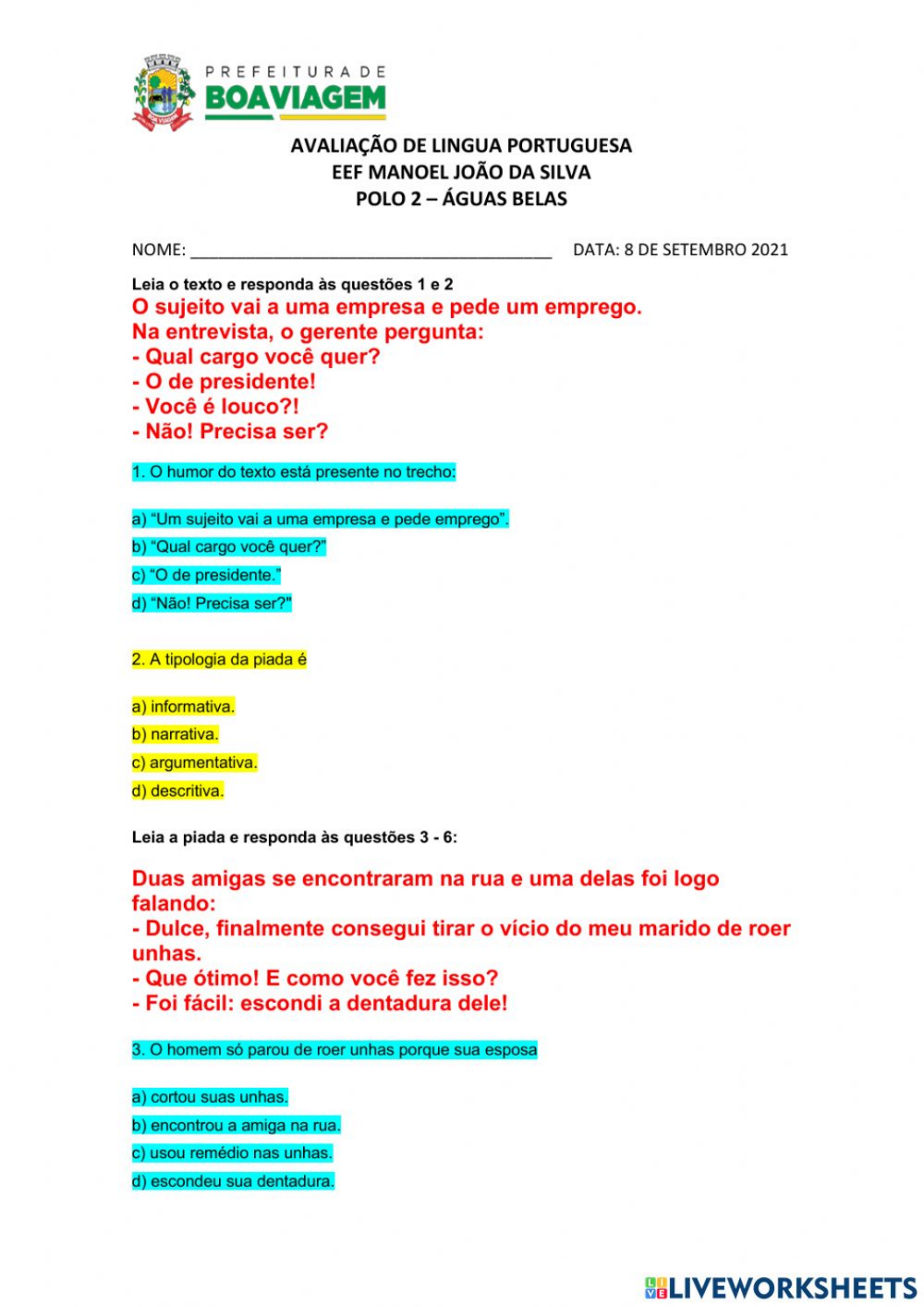 <p>PREFEITURAD BOAVIAGEM AVALIAÇÃO DE LINGUA PORTUGUESA EEF MANOEL JOÃO DA SILVA POLO 2 - ÁGUAS BELAS NOME: DATA: 8 DE SETEMBRO 2021 Leia texto e responda às questões 1 e 2 o sujeito vai a uma empresa e pede um emprego. Na entrevista, o gerente pergunta: - Qual cargo você quer? - o de presidente! - Você é louco?! - Não! Precisa ser? 1. o humor do texto está presente no trecho: a) "Um sujeito vai a uma empresa e pede emprego". b) "Qual cargo você quer?" c) "O de presidente." d) "Não! Precisa ser?" 2. A tipologia da piada é a) informativa. b) narrativa. c) argumentativa. d) descritiva. Leia a piada e responda às questões 3 - 6: Duas amigas se encontraram na rua e uma delas foi logo falando: - Dulce, finalmente consegui tirar vício do meu marido de roer unhas. - Que ótimo! E como você fez isso? - Foi fácil: escondi a dentadura dele! 3. o homem só parou de roer unhas porque sua esposa a) cortou suas unhas. b) encontrou a amiga na rua. c) usou remédio nas unhas. d) escondeu sua dentadura. BLIVEWORKSHEETS</p><p>BOAVIAGEM 4. o trecho "Duas amigas se encontraram na rua e uma delas foi logo falando:" é a fala do a) personagem principal. b) personagem secundário. c) narrador do texto. d) leitor do texto. 5. o ponto de exclamação no trecho: "- Que ótimo!", revela a) entusiasmo. b) afetividade. c) indagação. d) curiosidade. 6. A finalidade do texto é a) provocar reflexão. b) causar humor. c) informar um acontecimento. d) descrever uma situação. Leia a piada e responda às questões 7 e 8: No restaurante, o freguês chama o garçom: - Tem uma mosca no meu prato! - É desenho do prato, meu senhor. - Mas tá se mexendo! - Viu a tecnologia? É desenho animado! 7. o efeito de humor do texto é a) o garçom dizer que é um desenho animado. b) o cliente perceber que a mosca está se mexendo. c) o cliente encontrar uma mosca no prato de comida. d) o garçom responder que é um desenho no prato. 8. É característica do texto lido a) o uso da linguagem formal para se comunicar. b) a descrição exata dos fatos ocorridos de forma culta. c) a narração curta com elemento surpresa no final. d) a existência de opiniões e argumentos. LIVEWORKSHEETS</p><p>BOAVIAGEM Leia e resolva: A vizinha bateu na porta e não obteve resposta. Já se ia retirando quando apareceu um dos filhinhos dos donos da casa, de quatro anos de idade. - "Bom dia Bob", disse ela, "Você está sozinho em casa?" -"Estou, sim senhora. Mamãe está no hospital, e eu, papai, Regina, minha maior e Edna, a menor, estamos aqui, " 9. o menino diz que está sozinho porque a) seus pais estão no hospital. b) seus irmãos não estão em casa. c) sua mãe é muito importante. d) sua está no hospital. Leia e resolva: Uma batata fala ao tomate -E ae, tumate! -Err, se pronuncia TOmate, tá legal? - Ahhh! Tumate, tomate, tanto faz! - Tanto faz uma pinóia! E se eu te chamasse de bartata, que você ia achar? -la achar estranho, porque meu nome é Ricardo. 10. A linguagem predominante no texto é a) regional. b) informal. c) técnica. d) religiosa. Leia texto e responda a pergunta: 11. A mãe pede ao filho para não esquecer o casaco porque Filho, a) é uma mãe zelosa. b) é uma mãe desatenta. esquece de levar o casaco! c) seu filho é atencioso. d) seu filho é cuidadoso. (Beijos BLIVEWORKSHEETS</p><p>PREFEITURAD E BOAVIAGEM Leia e responda: Entramos em 12. No texto, a palavra "pique" indica a) total b) disposição. a partir do dia 27 de c) perigo. d) caminho. da equipe DiHellen Leia e responda: 91 (1) 13. A expressão "A alma do negócio..." significa que você TodoMundo a) está doente e não faz negócio. b) é quem dá vida ao negócio. alma do Entre negocio agora c) é quem fecha o negócio. no d) está fora do negócio. Leia o texto e depois responda a questão: Gato Editar Me 14. o efeito de sentido de pretensão, está presente na frase Jura??? Por quem??? Foi a imagem mais linda a) "Jura??? Por quem???" que eu já vi. Era b) "No meu quarto?" e ficava por horas no seu quarto c) "Gato, VC estava olhando para o espelho!!!!" olhando pra mim. d) "Lógico, o que mais seria a imagem mais linda que eu já vi?" No meu quarto? Gato, estava olhando para o espelho!!!! Entregue Lógico, o que mais seria a imagem mais linda que eu já vi? Message Enviar</p><p>PREFEITURADE BOAVIAGEM Feliz Natal irmão! Você tá no coração, hahahaha. Lida 22:25 Leia e responda: Para você também, 15. No texto, o uso da palavra "irmão" indica amigo, ótimo ano novo! a) consideração. Aproveita bem o dia! A gente se fala depois! b) desprezo. Abraço! c) ironia. Enviada como Mens. de Texto. d) humor. iMessage Enviar Leia: Me desculpe atrapalhar teu sono, que eu perdi meu pensando em você Eu te amo. 16. No trecho "eu perdi o a palavra sublinhada refere-se ao a) namorado. b) celular. c) sono. d) pensamento. Leia e responda: 17. A mensagem foi enviada por uma instituição a) educacional. FGTS b) hospitalar. c) financeira. d) religiosa.</p><p>Leia e responda: hj CVC xau 18. o padrão de linguagem usada no texto é bj a) técnica. b) regional. c) religiosa. d) informal. Leia e responda: 19. Na mensagem, a palavra "luta" indica a) briga. b) disputa. te c) esforço. d) zanga. para CD luta Beija Leia e responda: 20. A mensagem acima, apresenta um tipo de linguagem utilizada entre a) amigos. b) parentes. mozinho c) namorados. 08/08/2012 19:23 d) professores. oi moxao mo, to com dor onde mozao? no peito ): porque amor? porque to longe de voce de Enviar</p>