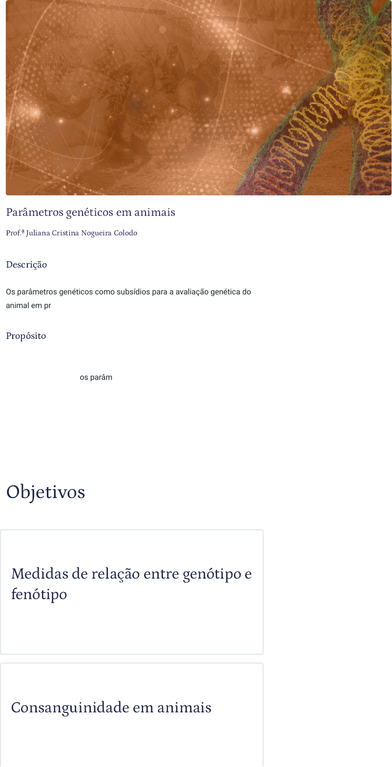 <p>Parâmetros genéticos em animais</p><p>Prof.ª Juliana Cristina Nogueira Colodo</p><p>Descrição</p><p>Os parâmetros genéticos como subsídios para a avaliação genética do</p><p>animal em programas de melhoramento.</p><p>Propósito</p><p>Para o planejamento de um programa de melhoramento animal, é</p><p>necessário conhecer os parâmetros genéticos da população alvo, entre</p><p>eles a variância, a herdabilidade, a heterose e seus desdobramentos, em</p><p>função da característica que se deseja selecionar. A partir desse</p><p>conhecimento, é possível verificar se a característica desejada responde</p><p>ao processo de seleção genética e, consequentemente, obter o valor</p><p>genético estimado do animal.</p><p>Objetivos</p><p>Módulo 1</p><p>Medidas de relação entre genótipo e</p><p>fenótipo</p><p>Definir as medidas de relação entre genótipo e fenótipo animal.</p><p>Módulo 2</p><p>Consanguinidade em animais</p><p>Analisar a consanguinidade em animais e seus efeitos.</p><p>Módulo 3</p><p>Avaliação genética animal</p><p>Reconhecer os fundamentos, objetivos e métodos da avaliação</p><p>genética animal.</p><p>Introdução</p><p>O melhoramento animal é baseado nas características</p><p>fenotípicas que os animais apresentam, sendo muitas delas</p><p>influenciadas pelo ambiente no qual o animal vive, principalmente</p><p>aquelas de interesse econômico, como ganho de peso, produção</p><p>de ovos, produção de leite, quantidade de óvulos em uma desova</p><p>de peixes etc.</p><p>Neste conteúdo, aprenderemos a desvendar o quanto da</p><p>característica que se deseja melhorar é de efeito genético e o</p><p>quanto é de efeito ambiental. Essa é a base para calcular os</p><p>valores genéticos estimados dos animais nos programas de</p><p>melhoramento animal. Por meio de cálculos, é possível ranquear</p><p>os animais de acordo com seus valores genéticos estimados e</p><p>adequar o melhor método de seleção genética.</p><p>Após este estudo, você será capaz de ranquear os animais de</p><p>acordo com as características desejadas em um programa de</p><p>melhoramento genético e saber se essas características</p><p>respondem à seleção genética.</p><p></p><p>1 - Medidas de relação entre genótipo e fenótipo</p><p>Ao �nal deste módulo, você deverá ser capaz de de�nir as medidas de</p><p>relação entre genótipo e fenótipo animal.</p><p>Relação genótipo e fenótipo</p><p>animal</p><p>Vamos começar com uma reflexão!</p><p>Considerando que é possível estimar o quanto as características de</p><p>interesse econômico são transmitidas aos descendentes por meio dos</p><p>parâmetros genéticos, analise a imagem com os bovinos da raça Angus</p><p>e escolha qual seria o melhor animal a transmitir a característica</p><p>“qualidade de carne” para a próxima geração.</p><p>Bovinos da raça Angus.</p><p>Somente olhando a morfologia externa dos animais não é possível</p><p>determinar qual deles apresenta a melhor qualidade da carne, que será</p><p>repassada aos seus descendentes.</p><p>Logo, para planejar um programa de melhoramento</p><p>animal, precisamos conhecer algumas propriedades da</p><p>população que se deseja trabalhar. Entre elas, a</p><p>variância e a herdabilidade das características, e como</p><p>elas são aplicadas no melhoramento genético animal.</p><p>As características econômicas avaliadas nos animais são de natureza</p><p>poligênica, ou seja, controladas por muitos genes. A maioria é</p><p>influenciada também pelo ambiente em que o animal vive. O resultado</p><p>dessas características econômicas é o fenótipo do animal, que</p><p>podemos enxergar e, muitas vezes, até medir.</p><p>Ovos de diferentes raças de galinhas. A cor da casca do ovo é um fator genético e independe do</p><p>ambiente em que o animal vive.</p><p>Pense em um rebanho bovino de leite. Uma das características</p><p>econômicas avaliadas no melhoramento é a quantidade de leite</p><p>produzido no ciclo de produção de uma vaca. Parte dessa quantidade é</p><p>um efeito genético do indivíduo e a outra parte é um efeito ambiental.</p><p>Durante o ciclo produtivo de uma vaca, o ambiente está sempre</p><p>mudando. Então, a produção de leite oscila conforme o ambiente. A</p><p>nutrição, o clima e o manejo estão entre os fatores que interferem na</p><p>produção de leite. Já o fator genético não muda no animal, é sempre o</p><p>mesmo. E é esse fator que é importante para o melhoramento genético.</p><p>A mensuração da produção de leite cada vez que a vaca é ordenhada é um dado básico para</p><p>identificar o animal mais produtivo.</p><p>Cada animal possui um potencial genético de produção. Tal potencial</p><p>será favorável dependendo do ambiente. Se o animal estiver em um</p><p>ambiente ótimo, terá uma ótima produção; se estiver em ambiente</p><p>desfavorável, sua produção será menor.</p><p>Exemplo</p><p>Pensando em uma fazenda de gado leiteiro, é normal selecionar aquela</p><p>vaca que produziu mais leite, mas nem sempre isso é o ideal. Imagine a</p><p>vaca 362, que produziu 5.940kg de leite em um ciclo de 305 dias, e a</p><p>vaca 465, que produziu 6.720kg de leite. Com base nessas informações,</p><p>a vaca 465 seria a melhor produtora de leite. Entretanto, ao acessar</p><p>informações do ambiente, como ordem de lactação, descobre-se que a</p><p>vaca 362 seria de 1ª ordem de lactação e a vaca 465 seria de 3ª ordem</p><p>de lactação.</p><p>É sabido que, na produção de leite, as vacas atingem seu pico de</p><p>produção na 3ª ordem de lactação. A vaca 362 está em sua 1ª ordem de</p><p>lactação e ainda não manifestou todo seu potencial genético. Então,</p><p>será preciso definir o quanto desses quilos de leite é de origem</p><p>genética e o quanto foi devido ao ambiente favorável para a produção</p><p>de leite.</p><p>Vacas com grande potencial genético d