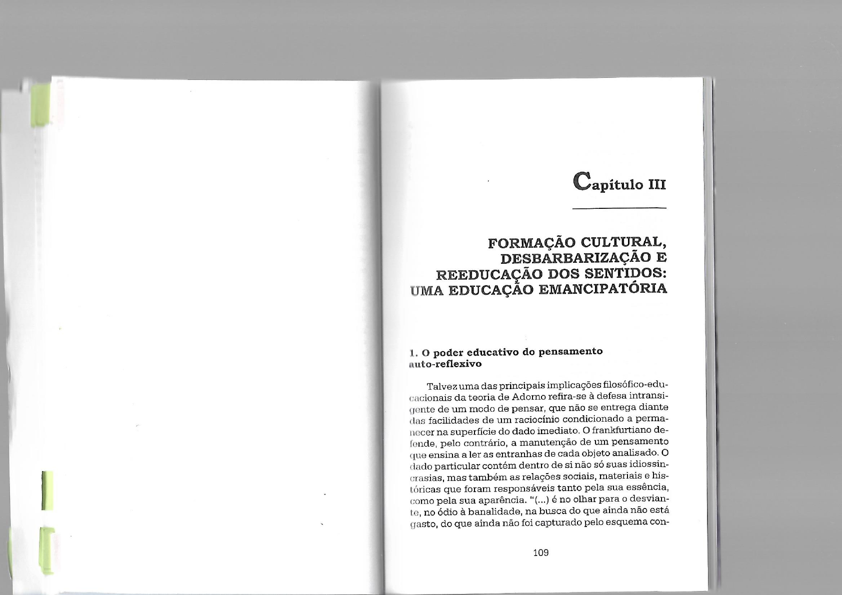 <p>III FORMAÇÃO CULTURAL, DESBARBARIZAÇÃO E REEDUCAÇÃO DOS SENTIDOS: UMA EDUCAÇÃO EMANCIPATÓRIA 1. O poder educativo do pensamento auto-reflexivo Talvez uma das principais implicações filosófico-edu- cacionais da teoria de Adorno refira-se à defesa intransi- gente de um modo de pensar, que não se entrega diante das facilidades de um raciocínio condicionado a perma- necer na superfície do dado imediato. frankfurtiano de- fende, pelo contrário, a manutenção de um pensamento que ensina a ler as entranhas de cada objeto analisado. dado particular contém dentro de si não só suas idiossin- crasias, mas também as relações sociais, materiais e his- tóricas que foram responsáveis tanto pela sua essência, como pela sua aparência. "(...) é no olhar para o desvian- te, no ódio à banalidade, na busca do que ainda não está gasto, do que ainda não foi capturado pelo esquema con- 109</p><p>ceitual geral que reside a derradeira chance do pensa- ciências. Adorno, no texto diz que essa infe- mento" (MM, p. 58). rência hegeliana aparece de forma explícita no Marx de A Ideologia "O homem Pedro só se refere a si próprio Ao proceder dessa forma, descobre-se uma incon- como homem através de sua relação com o homem Paulo, gruência entre a essência e aparência do objeto, fazendo sou semelhante". com que se vislumbre a distância entre suas promessas e efetivas realizações. Na análise do dado ideológico, obser- Percebe-se a diferença em relação ao raciocínio posi- va-se tanto a verdade do conteúdo das palavras, tais como tivista, que se contenta em encetar explicações superfici- a defesa de uma sociedade mais justa e igualitária, e a fal- ais dos problemas provenientes das relações entre indiví- sidade de que essa promessa se encontra efetivamente duo e sociedade. Dentro desse aspecto, sustenta-se a cumprida. Efetiva-se, portanto, aquilo que os frankfurtia- idéia de que os acontecimentos sociais são desenvolvi- nos chamam de crítica imanente ao próprio objeto. dos numa direção linear, onde nascem e perecem após certo tempo. Na verdade, perde-se de vista a considera- Um conceito fundamental para a efetuação desse ção de que há uma relação de interdeterminação entre es- objetivo é o de negação determinada, desenvolvido por ses mesmos acontecimentos. Sabemos que nas contradi- Hegel. É verdade que os frankfurtianos, e particular- ções geradas entre as relações de produção e as forças mente Adorno, criticaram a forma como Hegel finaliza o produtivas dentro do feudalismo, já se encontram desen- processo do raciocínio dialético, convergindo as anti- volvidas, potencialmente, as características do modo de nomias sociais entre sujeito e objeto no espírito absolu- produção capitalista, por exemplo. "O positivismo se con- to. Contudo, concordam com a intuição hegeliana de verte em ideologia quando elimina primeiro a categoria que verdadeiro conhecimento não fica restrito ao time- objetiva de essência e, depois, conseqüentemente, in- diatismo do objeto, mas que compreende suas relações teresse pelo essencial" (DN, p. 173). espaço-temporais dentro dos sentidos histórico, social Há uma censura ao raciocínio positivista que se ren- e humano. Há uma negação ao dado imediato, para pos- de à tautologia tão criticada nas bases explicativas do teriormente poder compreendê-lo como parte de um mito, pois sabe-se de antemão os resultados que serão processo social, e não como uma parte isolada do todo. obtidos mediante o controle "total" das variáveis. Na ver- A construção da identidade não se limita ao momento dade, pensamento não se conserva apenas em si mes- em que o indivíduo se distancia do objeto, num movi- mo. A pretensão de auto-suficiência do positivismo en- mento de contemplação. contra correlação direta com a veleidade do indivíduo Faz-se necessária a retomada de contato consigo burguês que crê no poder do exercício de sua vontade, a mesmo, pela mediação do trabalho, objetivando-se não despeito de possíveis entraves sociais. A crítica de Ador- só o auto-reconhecimento de si, como também o reco- no, desenvolvida dentro da tradição do materialismo his- nhecimento do outro. A concretização das aspirações pessoais depende do trabalho em conjunto entre o sujei- to e seus semelhantes. A satisfação da autoconsciência só é alcançada mediante o contato com outras autocons- 1. In: Adorno, T.W. e Horkheimer, M. Temas básicos da sociologia. Tradução de Álvaro Cabral. São Paulo: Cultrix, 1973, p. 52. 110 111</p><p>tórico não ortodoxo, tem papel relevante na desmistifica- em Minima Moralia: "Entre conhecimento e o poder não ção do conceito de indivíduo enquanto entidade absoluta existe apenas uma relação de lacaio, mas também uma e independente. Contudo, atento para o perigo de tal ati- relação de verdade" (MM, p. 48). Além disso, chama a tude, o frankfurtiano também alude ao de uma atenção para a universalização da lógica do equivalente concepção de sociedade que acaba por conduzir ao mes- em todas as relações sociais, tal como pudemos observar mo erro observado na tentativa psicológica de absoluti- na equiparação das leis da matemática, da justiça e da zação do conceito de indivíduo. afetividade. combate à propagação desse princípio en- contra ressonâncias nas atividades cotidianas desenvol- Como vimos anteriormente, o pensamento está sem- pre vinculado a juízos de valores, consubstanciado a inte- vidas em todas as instituições que envolvam processos resses que determinam a forma como o saber será objeti- de sociabilização. Nas escolas, esse tipo de atuação po- deria ser identificado em várias situações. Como exem- vado em produtos sociais posteriormente distribuídos e assimilados pelos indivíduos. Dessa feita, outra contribui- plo, poderíamos fazer menção ao predomínio do nio entre os alunos de que um fenômeno social é comple- ç