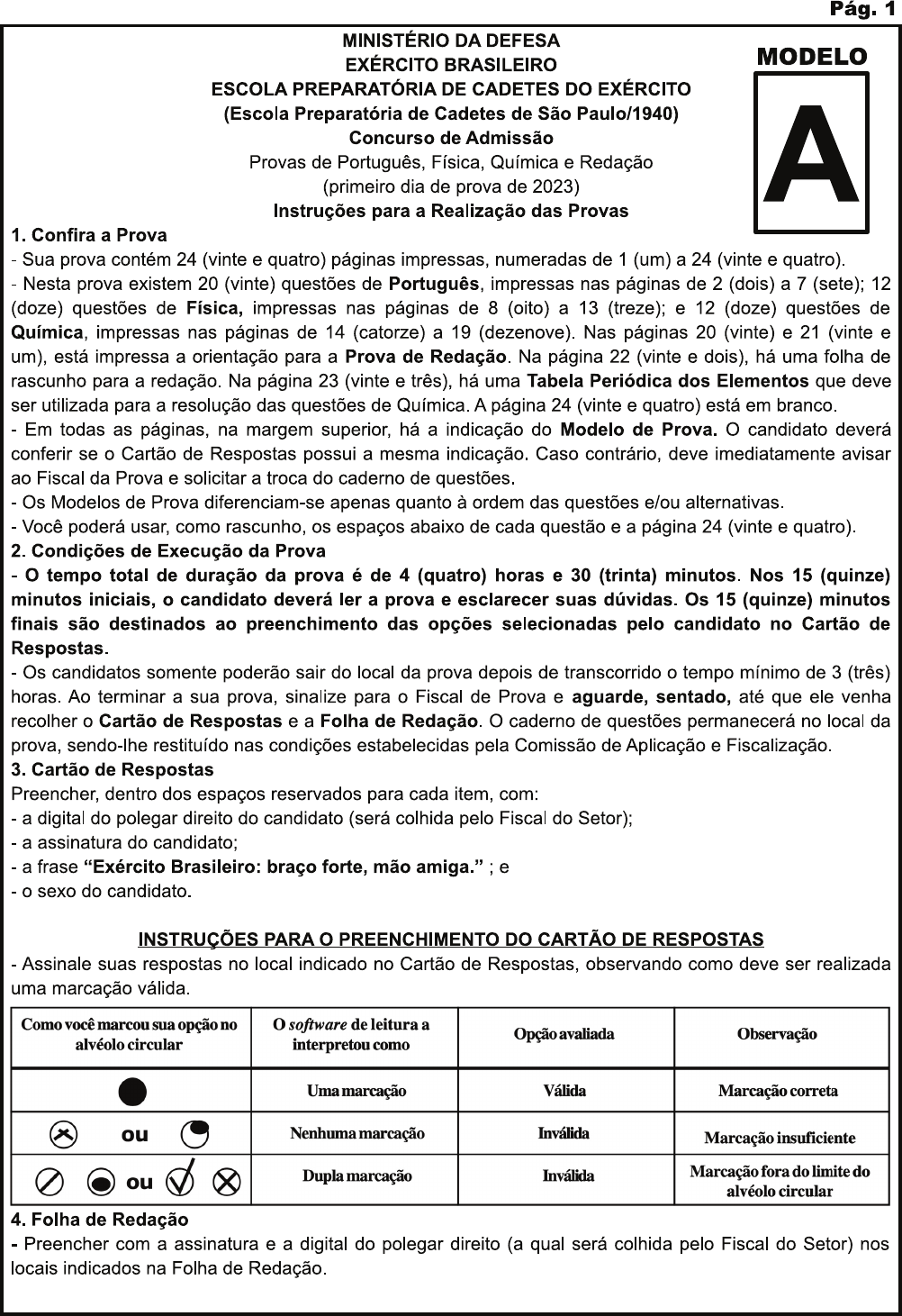<p>Pág. 1 MINISTÉRIO DA DEFESA EXÉRCITO BRASILEIRO MODELO ESCOLA PREPARATÓRIA DE CADETES DO EXÉRCITO (Escola Preparatória de Cadetes de São Paulo/1940) Concurso de Admissão Provas de Português, Física, Química e Redação A (primeiro dia de prova de 2023) Instruções para a Realização das Provas 1. Confira a Prova Sua prova contém 24 (vinte e quatro) páginas impressas, numeradas de 1 (um) a 24 (vinte e quatro). Nesta prova existem 20 (vinte) questões de Português, impressas nas páginas de 2 (dois) a 7 (sete); 12 (doze) questões de Física, impressas nas páginas de 8 (oito) a 13 (treze); e 12 (doze) questões de Química, impressas nas páginas de 14 (catorze) a 19 (dezenove). Nas páginas 20 (vinte) e 21 (vinte e um), está impressa a orientação para a Prova de Redação. Na página 22 (vinte e dois), há uma folha de rascunho para a redação. Na página 23 (vinte e três), há uma Tabela Periódica dos Elementos que deve ser utilizada para a resolução das questões de Química. A página 24 (vinte e quatro) está em branco. Em todas as páginas, na margem superior, há a indicação do Modelo de Prova. O candidato deverá conferir se o Cartão de Respostas possui a mesma indicação. Caso contrário, deve imediatamente avisar ao Fiscal da Prova e solicitar a troca do caderno de questões. Os Modelos de Prova diferenciam-se apenas quanto à ordem das questões e/ou alternativas. Você poderá usar, como rascunho, os espaços abaixo de cada questão e a página 24 (vinte e quatro). 2. Condições de Execução da Prova o tempo total de duração da prova é de 4 (quatro) horas e 30 (trinta) minutos. Nos 15 (quinze) minutos iniciais, o candidato deverá ler a prova e esclarecer suas dúvidas. Os 15 (quinze) minutos finais são destinados ao preenchimento das opções selecionadas pelo candidato no Cartão de Respostas. Os candidatos somente poderão sair do local da prova depois de transcorrido o tempo mínimo de 3 (três) horas. Ao terminar a sua prova, sinalize para o Fiscal de Prova e aguarde, sentado, até que ele venha recolher o Cartão de Respostas e a Folha de Redação. O caderno de questões permanecerá no local da prova, sendo-lhe restituído nas condições estabelecidas pela Comissão de Aplicação e 3. Cartão de Respostas Preencher, dentro dos espaços reservados para cada item, com: a digital do polegar direito do candidato (será colhida pelo Fiscal do Setor); a assinatura do candidato; a frase "Exército Brasileiro: braço forte, mão amiga." e o sexo do candidato. INSTRUÇÕES PARA o PREENCHIMENTO DO CARTÃO DE RESPOSTAS Assinale suas respostas no local indicado no Cartão de Respostas, observando como deve ser realizada uma marcação válida. Como você marcou sua opção no o software de leitura a Opção avaliada Observação alvéolo circular interpretou como amarcação Válida Marcação correta ou Nenhuma marcação Inválida Marcação insuficiente ou Dupla marcação Inválida Marcação fora do limite do alvéolo circular 4. Folha de Redação Preencher com a assinatura e a digital do polegar direito (a qual será colhida pelo Fiscal do Setor) nos locais indicados na Folha de Redação.</p><p>Pág. 2 Provas de Português, Física, Química e Redação - Modelo A PROVA DE PORTUGUÊS Escolha a única alternativa correta, dentre as opções apresentadas, que responde ou completa cada questão, assinalando-a, com caneta esferográfica de tinta azul ou preta, no Cartão de Respostas. Após a leitura atenta do texto apresentado a seguir, responda às questões propostas. HOMEM NO MAR Rubem Braga De minha varanda vejo, entre árvores e telhados, o mar. Não há ninguém na praia, que res- plende ao sol. O vento é nordeste, e vai tangendo, aqui e ali, no belo azul das águas, pequenas espumas que marcham alguns segundos e morrem, como bichos alegres e humildes; perto da ter- ra a onda é verde. Mas percebo um movimento em um ponto do mar; é um homem nadando. Ele nada a uma certa distância da praia, em braçadas pausadas e fortes; nada a favor das águas e do vento, e as pequenas espumas que nascem e somem parecem in mais depressa do que ele. Justo: espumas são leves, não são feitas de nada, toda sua substância é água e vento e luz, e o homem tem sua carne, seus ossos, seu coração, todo seu corpo a transportar na água. Ele usa os músculos com uma calma energia; avança. Certamente não suspeita de que um desconhecido o vê e o admira porque ele está nadando na praia deserta. Não sei de onde vem essa admiração, mas encontro nesse homem uma nobreza calma, sinto-me solidário com ele, acompanho o seu esforço solitário como se ele estivesse cumprindo uma bela missão. Já nadou em minha presença uns trezentos metros; antes, não sei; duas vezes o perdi de vista, quando ele passou atrás das árvores, mas esperei com toda confiança que reaparecesse sua cabeça, e o vimento alternado de seus braços. Mais uns cinquenta metros, e o perderei de vista, pois um te- o esconderá. Que ele nade bem esses cinquenta ou sessenta metros; isto me parece impor- tante; é preciso que conserve a mesma batida de sua braçada, e que eu o veja desaparecer assim como o vi aparecer, no mesmo rumo, no mesmo ritmo, forte, lento, sereno. Será perfeito; a ima- gem desse homem me faz bem. É apenas a imagem de um homem, e eu não poderia saber sua idade, nem sua cor, nem os traços de sua cara. Estou solidário com ele, e espero que ele esteja comigo. Que ele atinja o te- vermelho, e então eu poderei sair da varanda tranquilo, pensando "vi um homem sozinho, nadando no mar; quando o vi ele já estava nadando; acompanhei-o com atenção durante todo o tempo, e testemunho que ele nadou sempre com firmeza e correção; esperei que ele atingisse um telhado vermelho, e ele o atingiu". Agora não sou mais responsável por ele; cumpri o meu dever, e ele cumpriu o seu. Admiro- Não consigo saber em que reside, para mim, a grandeza de sua tarefa; ele não est