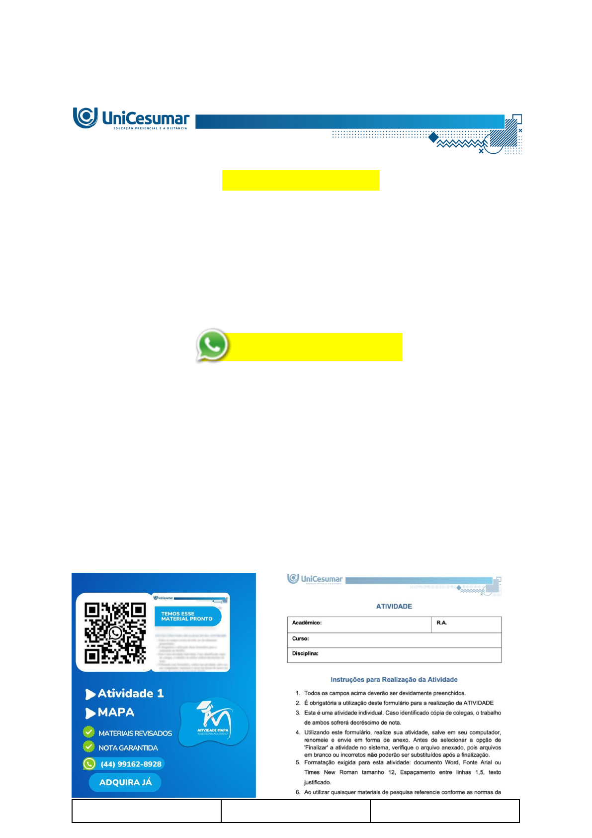 <p>(44) 99162-8928</p><p>Está SEM TEMPO ou com DIFICULDADE de realizar o seu trabalho</p><p>acadêmico?</p><p>Entre em contato conosco agora mesmo! Iremos te ajudar nessa</p><p>jornada acadêmica</p><p>(44) 99162-8928</p><p>MAPA – SANEAMENTO BÁSICO – 53_2024</p><p>DIAGNÓSTICO, ELABORAÇÃO E COORDENAÇÃO DE PROJETOS DE SANEAMENTO</p><p>BÁSICO: MEDIÇÃO E CONTROLE DE PROCESSOS DE TRATAMENTO DE ÁGUA</p><p>Olá, estudante!</p><p>Tudo bem? Seja bem-vindo a nossa atividade M.A.P.A. da disciplina Saneamento Básico. A</p><p>atividade tem como tema “Medição e controle de processos de tratamento de água”, e está</p><p>dividida em três etapas, com abordagem dos conteúdos que serão estudados ao longo de</p><p>toda a disciplina Saneamento Básico. Para as três fases, serão necessárias as análises</p><p>laboratoriais e as medidas de padrões de qualidade de água para a sua tomada de decisão</p><p>enquanto responsável técnico. Para tal, será essencial seu memorial de procedimentos</p><p>técnicos, bem como sua justificativa para suas as tomadas de decisões.</p><p>As suas tarefas nesse M.A.P.A. serão:</p><p>Realizar a análise microbiológica da amostra de água do rio de abastecimento da cidade</p><p>pelo laboratório virtual: LABORATÓRIO DE SANEAMENTO AMBIENTAL: COLETA,</p><p>PREPARO E ANÁLISE MICROBIOLÓGICA DA ÁGUA.</p><p>Avaliar os dados obtidos para determinar os Índices de Qualidade da Água (IQA) do rio que</p><p>abastece a cidade no interior do Paraná.</p><p>Identificar a classe e o tipo de tratamento para a qualidade da água em que o rio de</p><p>abastecimento público se enquadra.</p><p>Bom trabalho!</p><p>Profº André Simões</p><p>INSTRUÇÕES DE ENTREGA</p><p>Este é um trabalho INDIVIDUAL.</p><p>As respostas devem ser entregues utilizando o Modelo de Resposta MAPA</p><p>Saneamento Básico disponibilizado. Sobre o seu preenchimento, é necessário o</p><p>cumprimento das seguintes diretrizes:</p><p>Não serão aceitas respostas que constam apenas o resultado numérico, sem que seja</p><p>demonstrado o raciocínio que o levou a encontrar aquela resposta.</p><p>Toda e qualquer fonte e referência que você utilizar para responder os questionários deve</p><p>ser citada ao final da questão.</p><p>Após inteiramente respondido, o Modelo de Resposta MAPA Saneamento Básico deve</p><p>ser enviado para correção pelo seu Studeo em formato de arquivo DOC / DOCX ou</p><p>PDF, e apenas estes formatos serão aceitos.</p><p>O Modelo de Resposta MAPA Saneamento Básico pode ter quantas páginas você precisar</p><p>para respondê-lo, desde que siga a sua estrutura.</p><p>O Modelo de Resposta MAPA Saneamento Básico deve ser enviado única e</p><p>exclusivamente pelo seu Studeo, no campo "M.A.P.A." desta disciplina. Toda e qualquer</p><p>outra forma de entrega deste Modelo de Resposta MAPA não é considerada.</p><p>A qualidade do trabalho será considerada na hora da avaliação, então preencha tudo com</p><p>cuidado, explique o que está fazendo, responda as perguntas e mostre sempre o passo a</p><p>passo das resoluções e deduções. Quanto mais completo seu trabalho, melhor!</p><p>Problemas frequentes a evitar:</p><p>Coloque um nome simples no seu arquivo para não se confundir no momento de envio.</p><p>Se você usa OPEN OFFICE ou MAC, transforme o arquivo em PDF para evitar</p><p>incompatibilidades.</p><p>Verifique se você está enviando o arquivo correto! É o MAPA da disciplina certa? Ele está</p><p>preenchido adequadamente?</p><p>Como enviar o arquivo:</p><p>Acesse no Studeo o ambiente da disciplina e clique no botão M.A.P.A. No final da página há</p><p>uma caixa tracejada de envio de arquivo. Basta clicar nela e então selecionar o arquivo de</p><p>resposta da sua atividade;</p><p>Antes de clicar em FINALIZAR, certifique-se de que está tudo certo, pois uma vez</p><p>finalizado você não poderá mais modificar o arquivo. Sugerimos que você clique no link</p><p>gerado da sua atividade e faça o download para conferir se está de acordo com o arquivo</p><p>entregue.</p><p>Sobre plágio e outras regras:</p><p>Trabalhos copiados da internet ou de outros alunos serão zerados.</p><p>Trabalhos copiados dos anos anteriores também serão zerados, mesmo que você tenha</p><p>sido o autor.</p><p>A equipe de mediação está à sua disposição para o atendimento das dúvidas por meio do</p><p>“Fale com o Mediador” em seu Studeo. Aproveite essa ferramenta!</p><p>VOCÊ ESTÁ PREPARADO?</p><p>Nas próximas páginas, você será DESAFIADO! Como futuro engenheiro, queremos que</p><p>você desenvolva habilidades essenciais para a sua jornada, como: analisar, sistematizar,</p><p>refletir e tomar decisão. Uma aprendizagem ativa relevante é relacionada a nossa vida, aos</p><p>nossos projetos e expectativas. E nisso, o Saneamento Básico é excelente! Analisar os</p><p>desafios da vida real para a tomada de decisão, transformando-os em um objeto de estudo</p><p>que permita a aplicação de conceitos de engenharia na vivência prática de concepção de</p><p>projetos.</p><p>O objetivo deste desafio é provocar o seu senso crítico, buscando na leitura os fundamentos</p><p>necessários à explicação e compreensão das questões propostas, conectando o conteúdo</p><p>da disciplina de Saneamento Básico à realidade. Além disso, este desafio proporciona</p><p>autonomia para que você seja capaz de organizar suas atividades mentais, de modo a</p><p>desenvolver não somente o que compete às suas atribuições como estudante, mas também</p><p>como futuros profissionais.</p><p>Nossa atividade está dividida em três etapas que deverão ser feitas individualmente. Você</p><p>será desafiado a avaliar, calcular e monitorar o processo de tratamento e distribuição de</p><p>água potável e tratamento e disposição final ambientalmente adequado dos efluentes</p><p>domésticos de seu município. Assim, seus conhecimentos serão colocados à prova! Você</p