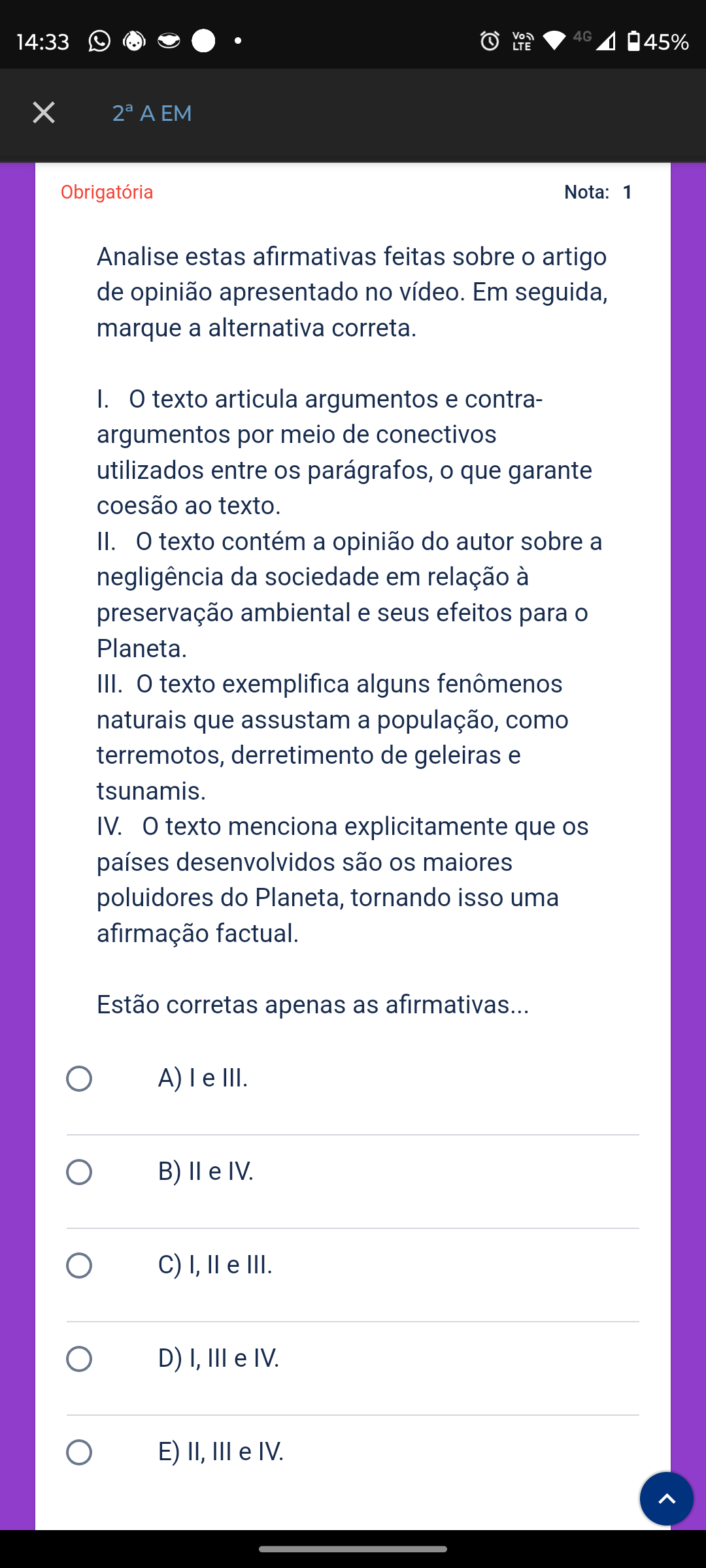 <p>14:33 4G LTE 45% X A EM Obrigatória Nota: 1 Analise estas afirmativas feitas sobre o artigo de opinião apresentado no vídeo. Em seguida, marque a alternativa correta. I. texto articula argumentos e contra- argumentos por meio de conectivos utilizados entre os parágrafos, o que garante coesão ao texto. II. texto contém a opinião do autor sobre a negligência da sociedade em relação à preservação ambiental e seus efeitos para o Planeta. III. o texto exemplifica alguns fenômenos naturais que assustam a população, como terremotos, derretimento de geleiras e tsunamis. IV. texto menciona explicitamente que os países desenvolvidos são os maiores poluidores do Planeta, tornando isso uma afirmação factual. Estão corretas apenas as afirmativas... A) e III. B) II e IV. C) I, II e III. D) I, III e IV. E) II, III e IV. ^</p>