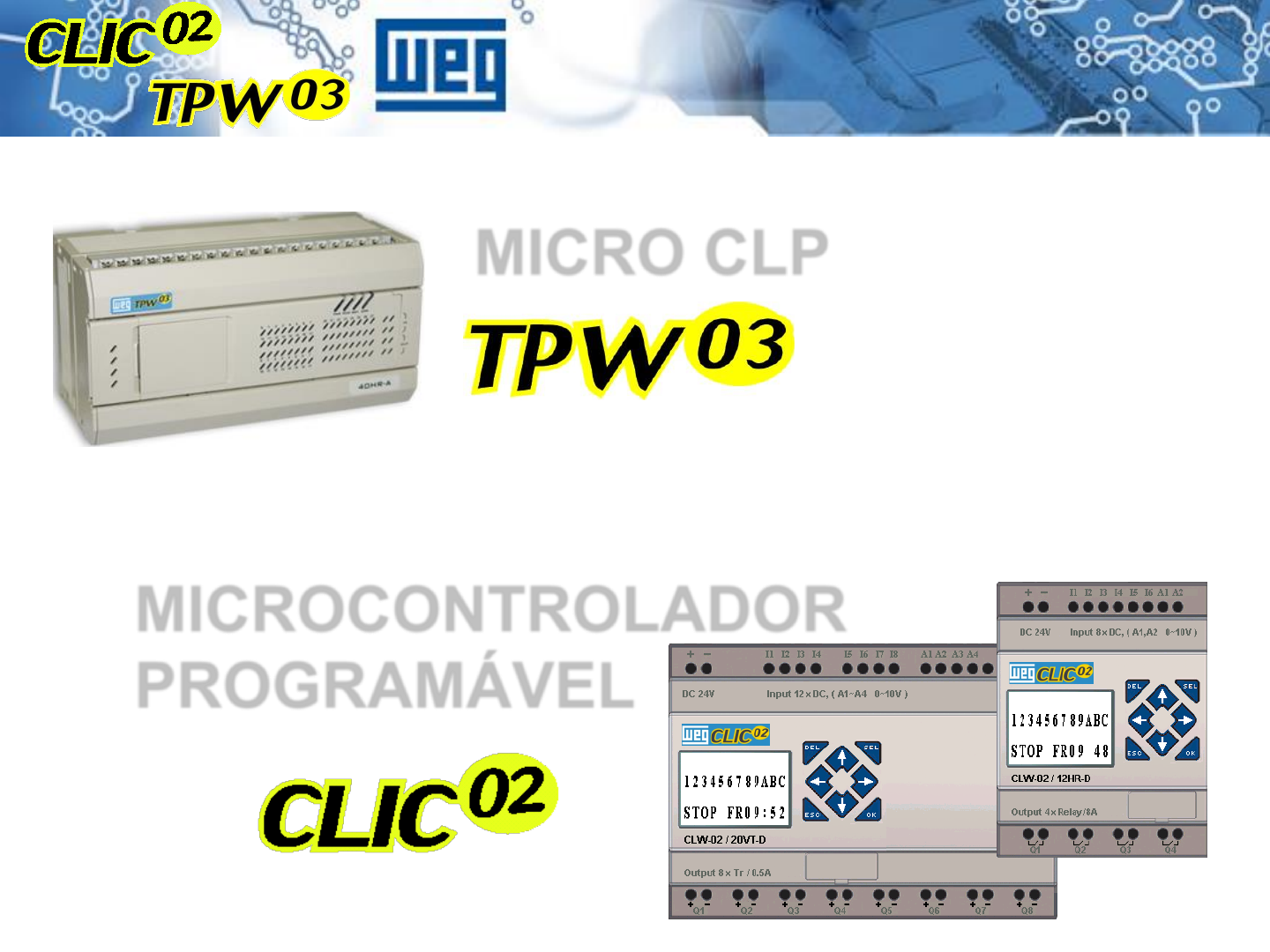 <p>MICRO CLP</p><p>MICROCONTROLADOR</p><p>PROGRAMÁVEL</p><p>- O controlador lógico programável,</p><p>ou simplesmente CLP, tem revolucionado</p><p>os comandos e controles industriais desde</p><p>o seu surgimento na década de 70.</p><p>- Inicialmente projetados para</p><p>substituirem os sistemas de controle por</p><p>relés, os CLP’s limitavam-se a aplicações</p><p>denvolvendo máquinas e processos de</p><p>operações repetitivas.</p><p>- Com o advento e a consequente</p><p>evolução tecnológica dos</p><p>microprocessadores, os CLP’s tiveram suas</p><p>funções ampliadas, aumentando</p><p>consideravelmente sua capacidade e</p><p>flexibilidade operacional.</p><p>- O que no seu surgimento era</p><p>executado com componentes discretos,</p><p>hoje se utiliza de</p><p>microprocessadores e microcontroladores</p><p>de última geração, usando técnicas de</p><p>processamento paralelo, redes de</p><p>comunicação, etc.</p><p>Controle</p><p>Altera</p><p>COMANDO</p><p>Processo</p><p>Monitora</p><p>Controle Processo</p><p>Comando</p><p>Monitoração</p><p>Alteração</p><p>CLP</p><p>Sensores</p><p>COMANDO</p><p>Entradas Saídas</p><p>Atuadores</p><p>Processo</p><p>Controlador</p><p>Leitura das Entradas</p><p>Execução do Programa</p><p>Atualização das Saídas</p><p>COMO FUNCIONA O CLP?</p><p>É um sinal que o CLP recebe</p><p>do sistema/ máquina.</p><p>É um sinal que o CLP envia</p><p>para o sistema/máquina.</p><p>Também conhecido como a</p><p>lógica ou intertravamento.</p><p> Entradas Digitais</p><p> PNP</p><p> NPN</p><p> Saídas Digitais</p><p> Relé</p><p> Transistor</p><p> Entradas Analógicas</p><p> 0 a 10V</p><p> 4 a 20mA</p><p> 0 a 20mA</p><p> Saídas Analógicas</p><p> 0 a 10V</p><p> 4 a 20mA</p><p> 0 a 20mA</p><p>ENTRADAS E SAÍDAS</p><p>EXEMPLOS DE ENTRADA DIGITAL</p><p>Chave fim</p><p>de curso</p><p>Sensores indutivos</p><p>e capacitivos</p><p>Botões e chaves</p><p>de comando</p><p>Entradas</p><p>Programa</p><p>Saídas</p><p>Pode ser dividido em duas</p><p>categorias:</p><p>- Entrada digital</p><p>- Entrada analógica</p><p>ENTRADAS</p><p>Entradas</p><p>Programa</p><p>Saídas</p><p> É um sinal pode ter duas condições:</p><p> Ligado (1)</p><p>Desligado (0)</p><p>ENTRADA DIGITAL</p><p>EXEMPLOS DE ENTRADA DIGITAL</p><p>Chave fim</p><p>de curso</p><p>Sensores indutivos</p><p>e capacitivos</p><p>Botões e chaves</p><p>de comando</p><p>Sensor Tipo “PNP”</p><p>LIGAÇÃO TIPO “PNP”</p><p>FOTOACOPLADOR</p><p>Vcc</p><p>PNP</p><p>Sensor</p><p>LIGAÇÃO TIPO “PNP”</p><p>Sensor Tipo “NPN”</p><p>LIGAÇÃO TIPO “NPN”</p><p>FOTOACOPLADOR</p><p>NPN</p><p>Vcc</p><p>Sensor</p><p>LIGAÇÃO TIPO “NPN”</p><p>Entradas</p><p>Programa</p><p>Saídas</p><p>Pode ser dividido em duas</p><p>categorias:</p><p>- Saída digital</p><p>- Saída analógica</p><p>SAÍDAS</p><p>Este sinal pode ter duas condições:</p><p> Ligado (1)</p><p>Desligado (0)</p><p>SAÍDA DIGITAL</p><p>Entradas</p><p>Programa</p><p>Saídas</p><p>EXEMPLOS DE SAÍDA DIGITAL</p><p>Sinalizadores</p><p>Contatores</p><p>Atuadores Hidráulicos</p><p>e pneumáticos</p><p>Vc [-]</p><p>Vc [+]</p><p>Carga 1</p><p>Carga 2</p><p>Carga N</p><p>comum</p><p>SAÍDA DIGITAL A RELÉ</p><p> Maior capacidade de condução de corrente;</p><p>TPW-03 2A, carga resistiva</p><p>Clic02 8A, carga resistiva</p><p> Acionamento de cargas sem a necessidade de interface a</p><p>rele externo.</p><p> Aceita tensões de até 250Vca</p><p> Desgaste dos contatos ao longo do tempo;</p><p> Freqüência de comutação baixa, não sendo possível</p><p>utilizá-la como saída rápida ou PWM.</p><p>SAÍDA DIGITAL A RELÉ</p><p>VANTAGENS</p><p>DESVANTAGENS</p><p>Vcc [+]</p><p>Vcc [-]</p><p>Carga</p><p>SAÍDA DIGITAL A TRANSISTOR</p><p> Saída “eletrônica”, não há desgastes;</p><p> Alta velocidade de comutação, podendo ser utilizada como</p><p>saída pulsada ou PWM</p><p> Menor capacidade de condução de corrente comparado às</p><p>saídas a relé;</p><p>TPW-03 0,3A em carga resistiva</p><p>Clic02 0,5A em carga resistiva</p><p> Necessidade de utilizar uma interface a relé externa</p><p>para o acionamento de cargas.</p><p> Tensão de trabalho única, normalmente 24Vcc (NPN).</p><p>SAÍDA DIGITAL A TRANSISTOR</p><p>VANTAGENS</p><p>DESVANTAGENS</p><p>Entradas</p><p>Programa</p><p>Saídas</p><p> Este sinal tem vários níveis, ou seja,</p><p>apresenta-se como um valor numa faixa</p><p>pré-estabelecida.</p><p>ENTRADA ANALÓGICA</p><p> Na indústria, os sinais analógicos mais</p><p>utilizados são:</p><p>- 0 a 10V ou 1 a 5V</p><p>- 0 a 20mA ou 4 a 20mA</p><p>EXEMPLOS DE ENTRADA ANALÓGICA</p><p>Sensores de</p><p>temperatura</p><p>Potenciômetro</p><p>Sensores</p><p>de pressão</p><p>Conversor</p><p>Analógico-Digital (AD)</p><p>Potenciômetro</p><p>CPU</p><p>8 bits: 0 a 255</p><p>ENTRADA ANALÓGICA</p><p>10 bits: 0 a 1024</p><p>12 bits: 0 a 4095</p><p>Entradas</p><p>Programa</p><p>Saídas</p><p> Este sinal tem vários níveis, ou seja,</p><p>apresenta-se como um valor numa faixa</p><p>pré-estabelecida.</p><p>SAÍDA ANALÓGICA</p><p> Na indústria, os sinais analógicos mais</p><p>utilizados são:</p><p>- 0 a 10V ou 1 a 5V</p><p>- 0 a 20mA ou 4 a 20mA</p><p>EXEMPLOS DE SAÍDA ANALÓGICA</p><p>Referência de</p><p>velocidade de</p><p>um motor</p><p>Controle de um</p><p>freio pneumático</p><p>Referência de</p><p>temperatura</p><p>de um forno</p><p>Conversor</p><p>Digital-Analógico (DA)</p><p>CPU</p><p>8 bits: 0 a 255</p><p>SAÍDA ANALÓGICA</p><p>10 bits: 0 a 1024</p><p>12 bits: 0 a 4095</p><p>Entradas para temperatura : Recebem sinais diretamente dos</p><p>sensores (termopares - J,K,L,R,S,</p><p>T, e termoresistências PT100);</p><p>Entradas Rápidas : Detecta pulsos mais rápidos que o ciclo de</p><p>scan (interrupções);</p><p>Permitem leitura direta de encoders;</p><p>Módulos de Rede : Permite estabelecer comunicação entre CP´s</p><p>e outros equipamentos inteligentes;</p><p>Relógio de Tempo Real : Permite que sejam tomada
