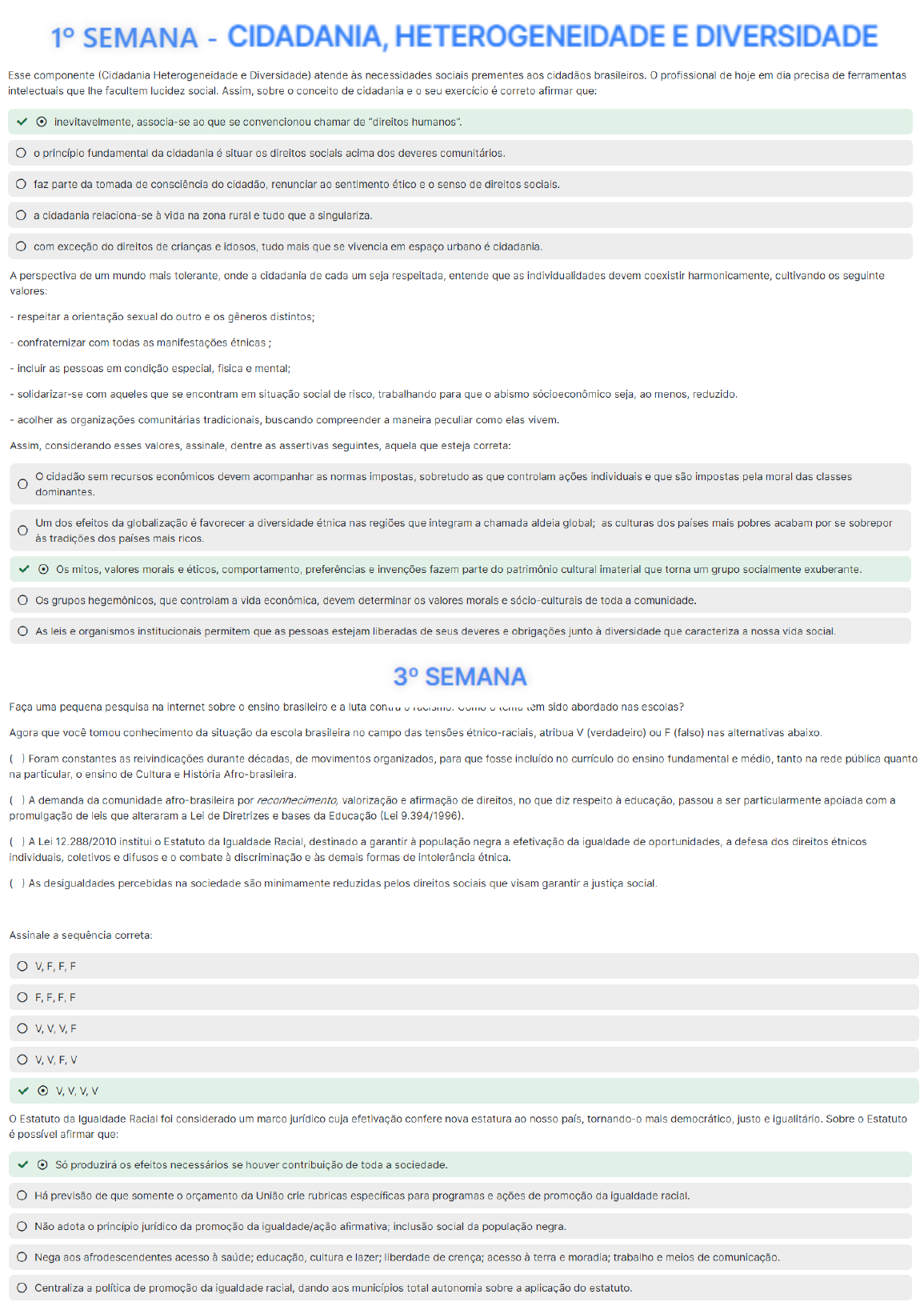 <p>1° SEMANA - CIDADANIA, HETEROGENEIDADE E DIVERSIDADE Esse componente (Cidadania Heterogeneidade e Diversidade) atende às necessidades sociais prementes aos cidadãos brasileiros. profissional de hoje em dia precisa de ferramentas intelectuais que lhe facultem lucidez social. Assim, sobre conceito de cidadania e seu exercício é correto afirmar que: inevitavelmente, associa-se ao que se convencionou chamar de "direitos humanos". princípio fundamental da cidadania é situar os direitos sociais acima dos deveres comunitários. faz parte da tomada de consciência do cidadão, renunciar ao sentimento ético e o senso de direitos sociais. a cidadania relaciona-se à vida na zona rural e tudo que a singulariza. com exceção do direitos de crianças e idosos, tudo mais que se vivencia em espaço urbano é cidadania. A perspectiva de um mundo mais tolerante, onde a cidadania de cada um seja respeitada, entende que as individualidades devem coexistir harmonicamente, cultivando os seguinte valores: respeitar a orientação sexual do outro e os gêneros distintos; - confraternizar com todas as manifestações étnicas ; incluir as pessoas em condição especial, fisica e mental; solidarizar-se com aqueles que se encontram em situação social de risco, trabalhando para que abismo sócioeconômico seja, ao menos, reduzido. acolher as organizações comunitárias tradicionais, buscando compreender a maneira peculiar como elas vivem. Assim, considerando esses valores, assinale, dentre as assertivas seguintes, aquela que esteja correta: cidadão sem recursos econômicos devem acompanhar as normas impostas, sobretudo as que controlam ações individuais e que são impostas pela moral das classes dominantes. Um dos efeitos da globalização é favorecer a diversidade étnica nas regiões que integram a chamada aldeia global; as culturas dos países mais pobres acabam por se sobrepor às tradições dos países mais ricos. Os mitos, valores morais e éticos, comportamento, preferências e invenções fazem parte do patrimônio cultural imaterial que torna um grupo socialmente exuberante. Os grupos hegemônicos, que controlam a vida econômica, devem determinar os valores morais e sócio-culturais de toda a comunidade. As leis e organismos institucionais permitem que as pessoas estejam liberadas de seus deveres e obrigações junto à diversidade que caracteriza a nossa vida social. 3° SEMANA Faça uma pequena pesquisa na internet sobre ensino brasileiro e a luta sido abordado nas escolas? Agora que você tomou conhecimento da situação da escola brasileira no campo das tensões étnico-raciais, atribua V (verdadeiro) ou F (falso) nas alternativas abaixo. ( ) Foram constantes as reivindicações durante décadas, de movimentos organizados, para que fosse incluído no currículo do ensino fundamental e médio, tanto na rede pública quanto na particular, ensino de Cultura e História Afro-brasileira. ( ) A demanda da comunidade afro-brasileira por reconhecimento, valorização e afirmação de direitos, no que diz respeito à educação, passou a ser particularmente apoiada com a promulgação de leis que alteraram a Lei de Diretrizes e bases da Educação (Lei 9.394/1996). ( ) A Lei 12.288/2010 institui Estatuto da Igualdade Racial, destinado a garantir à população negra a efetivação da igualdade de oportunidades, a defesa dos direitos étnicos individuais, coletivos e difusos e combate à discriminação e às demais formas de intolerância étnica. ( ) As desigualdades percebidas na sociedade são minimamente reduzidas pelos direitos sociais que visam garantir a justiça social. Assinale a sequência correta: V, F, F, F F, F, F, F V, V, V, F V, V, F, V V, V, V, V Estatuto da Igualdade Racial foi considerado um marco jurídico cuja efetivação confere nova estatura ao nosso país, tornando-o mais democrático, justo e igualitário. Sobre o Estatuto é possível afirmar que: Só produzirá os efeitos necessários se houver contribuição de toda a sociedade. Há previsão de que somente o orçamento da União crie rubricas específicas para programas e ações de promoção da igualdade racial. Não adota o princípio jurídico da promoção da igualdade/ação afirmativa; inclusão social da população negra. Nega aos afrodescendentes acesso à saúde; educação, cultura e lazer; liberdade de crença; acesso à terra e moradia; trabalho e meios de comunicação. Centraliza a política de promoção da igualdade racial, dando aos municípios total autonomia sobre a aplicação do estatuto.</p>